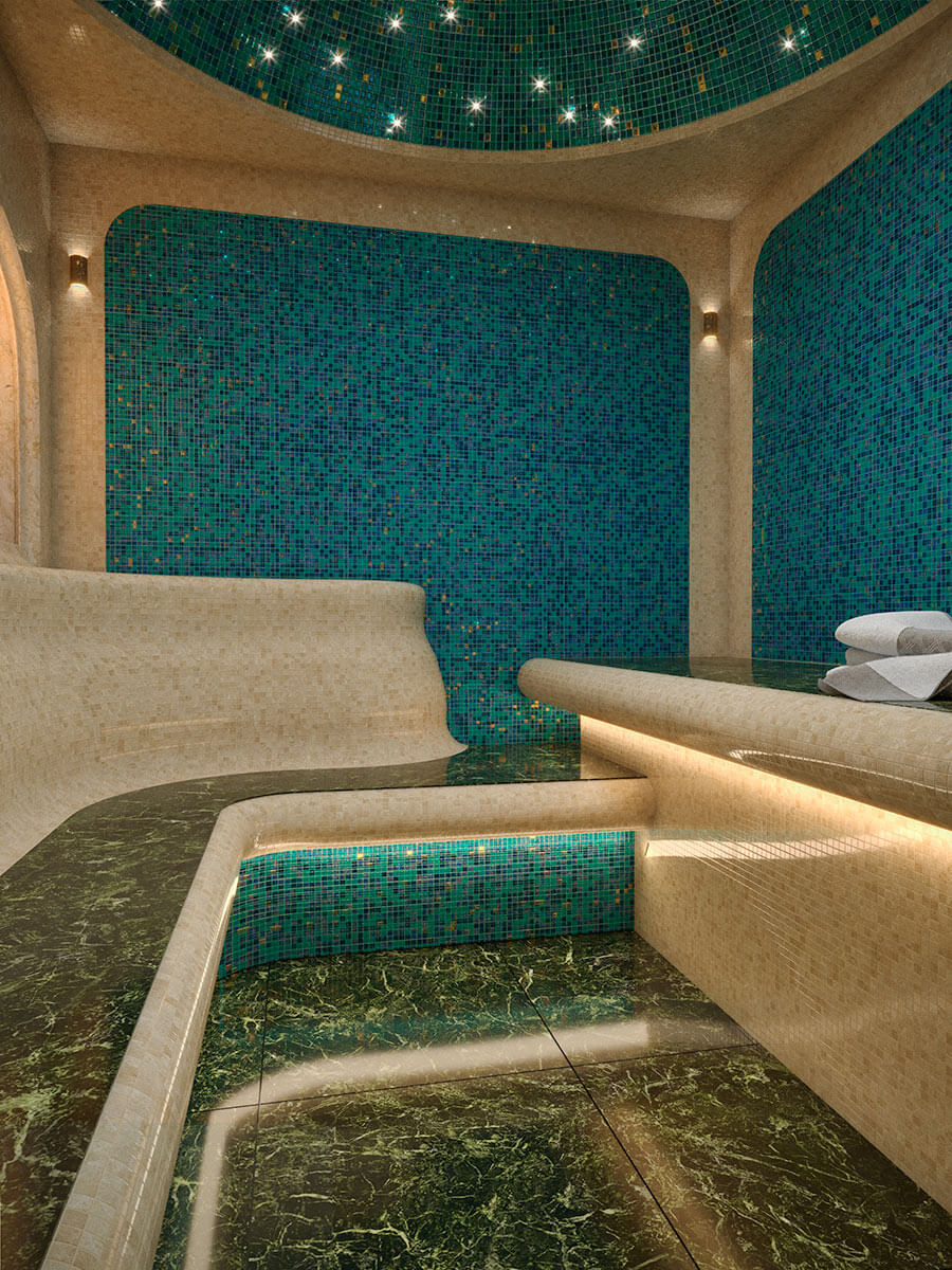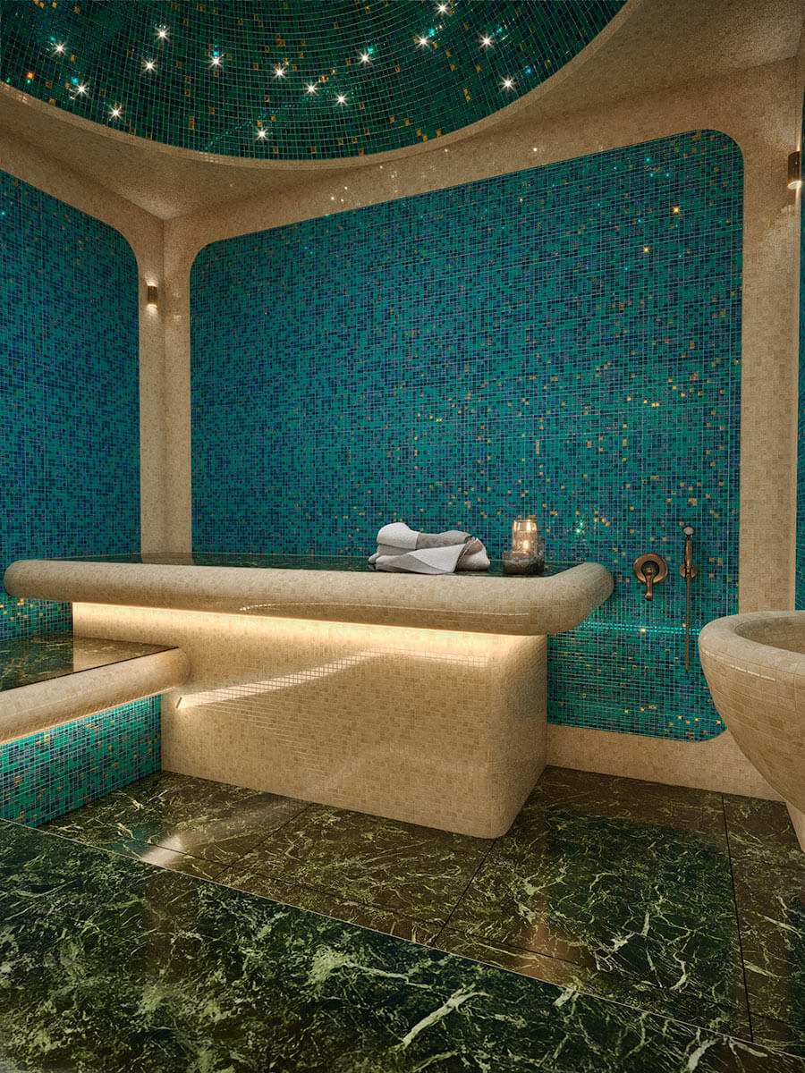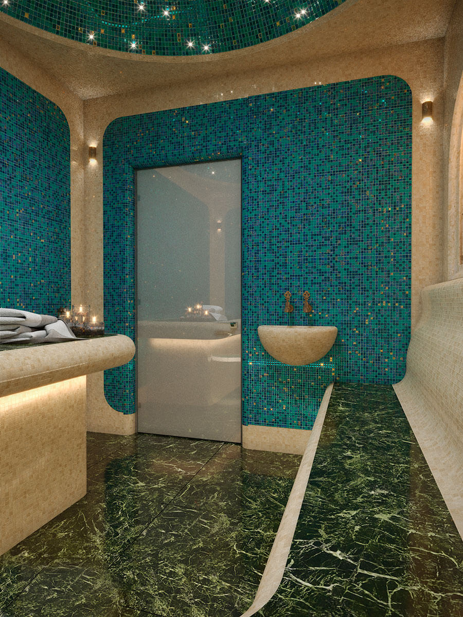 Цветовое решение основано на контрасте тонов светлого мрамора и мозаичных панно на стене и куполе. Пол и сидения сделаны из змеевика, который за счет глубокого цвета и сложного рисунка создает эффект глубины и роскоши. Проект имеет два варианта, где в первом случае использовано сочетание глубокого изумрудного в мозаике и бежевого мрамора Crema Marfil. Впоследствии изумрудный заменили бирюзовым.