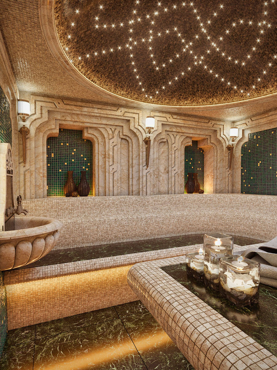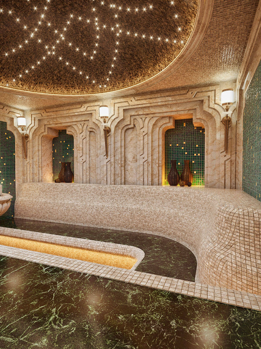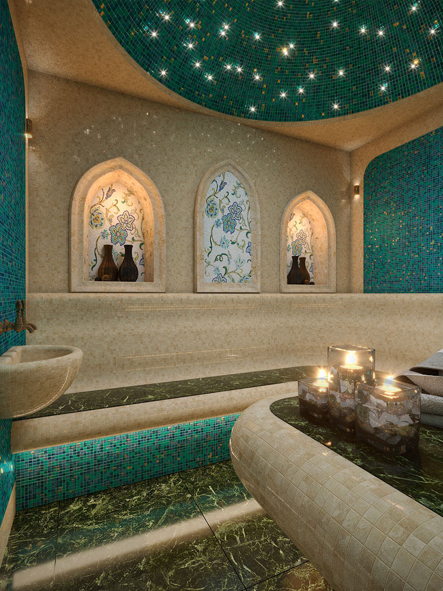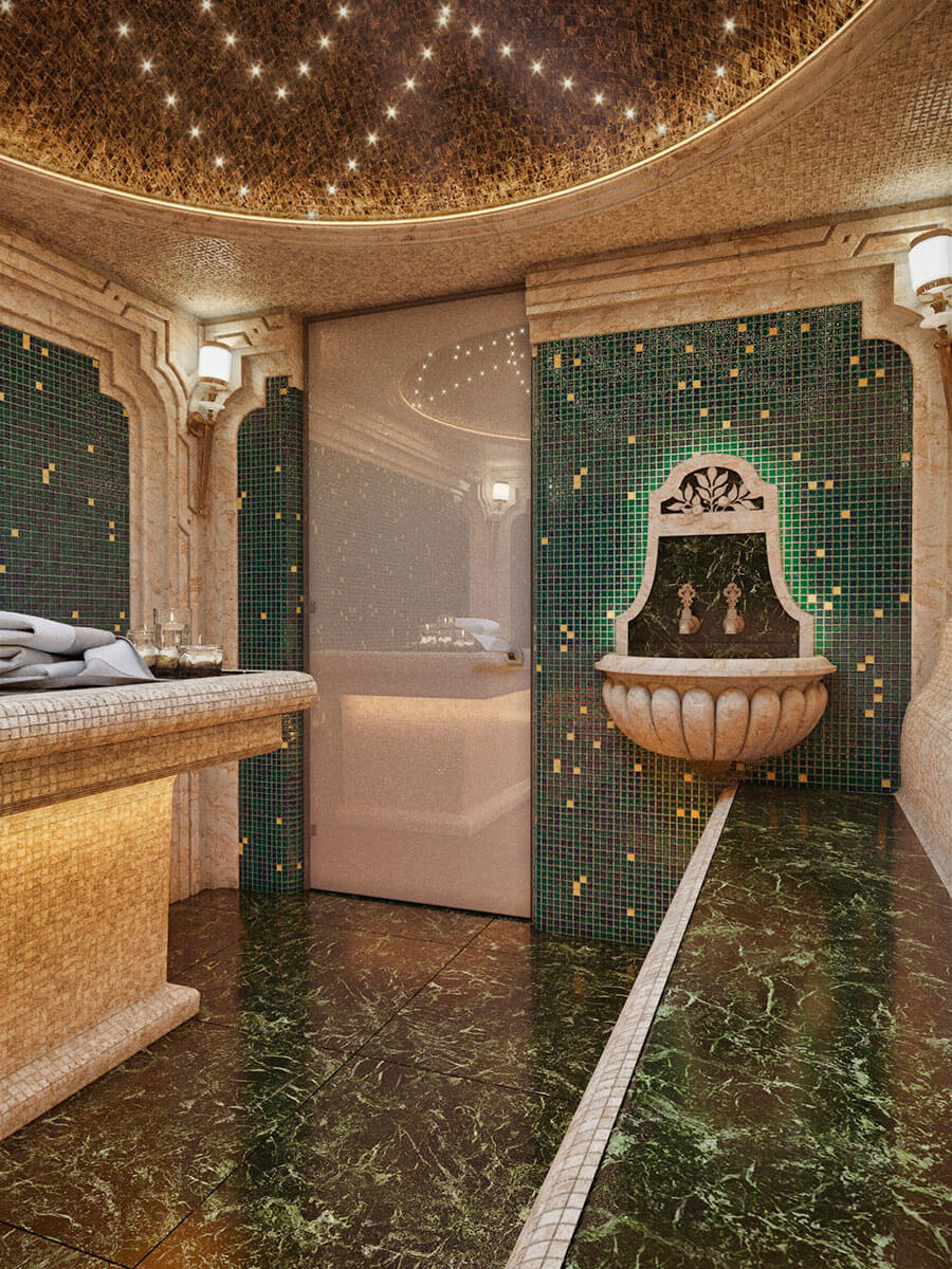 Цветовое решение основано на контрасте тонов светлого мрамора и мозаичных панно на стене и куполе. Пол и сидения сделаны из змеевика, который за счет глубокого цвета и сложного рисунка создает эффект глубины и роскоши. Проект имеет два варианта, где в первом случае использовано сочетание глубокого изумрудного в мозаике и бежевого мрамора Crema Marfil. Впоследствии изумрудный заменили бирюзовым.