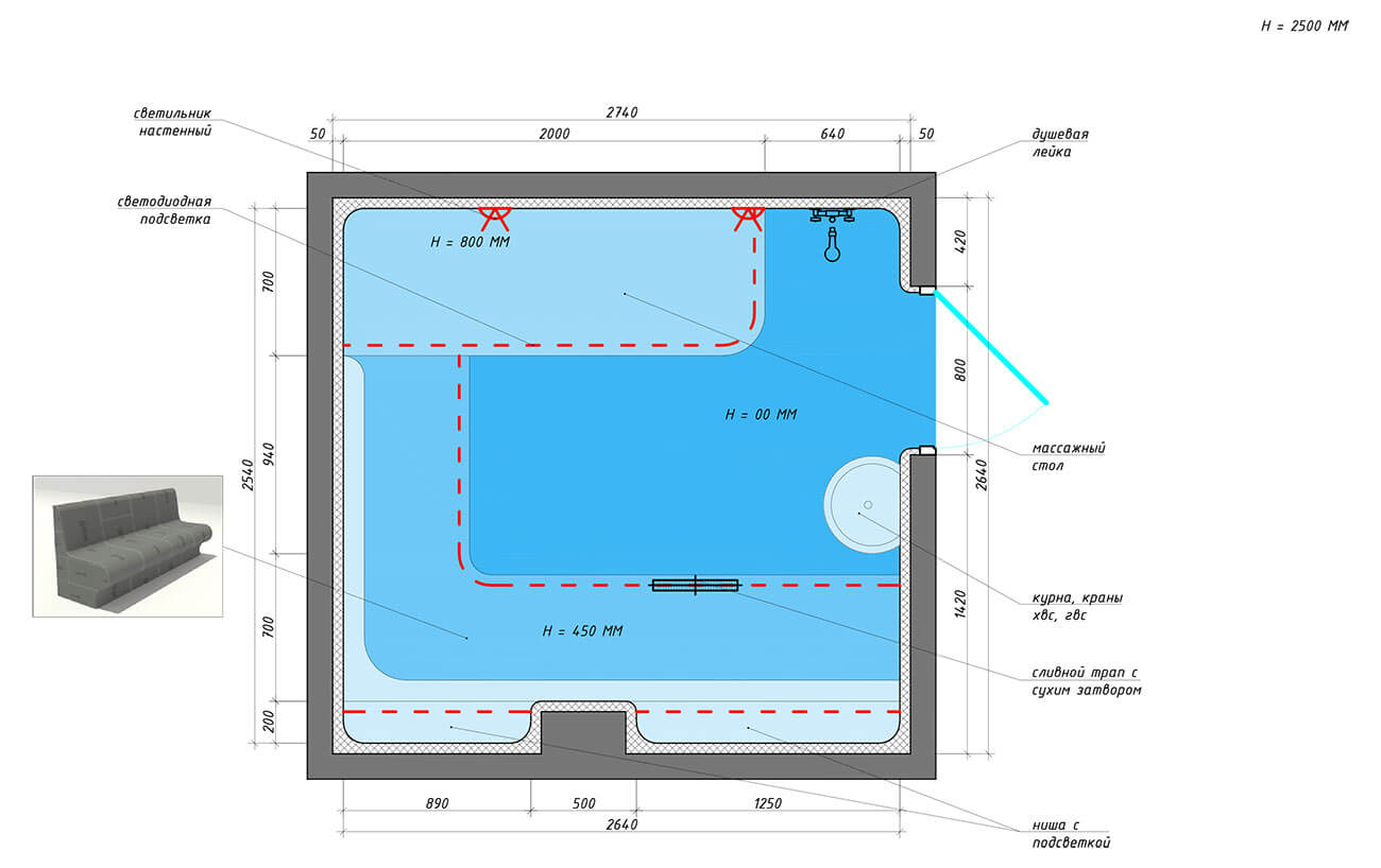 Планировочное решение достаточно компактное из-за размеров помещения. Массажный стол поместили в угол от входа, его размещение всегда увеличивает комфорт и позволяет проводить массажные процедуры. На противоположной стене находились несущие конструкции, которые скрыли за счет устройства ниш с декоративными панно. Купол со «звездным небом» привносит дополнительную эстетику за счет приглушенного освещения и потолочного акцента, визуально вытягивает пространственную композицию.