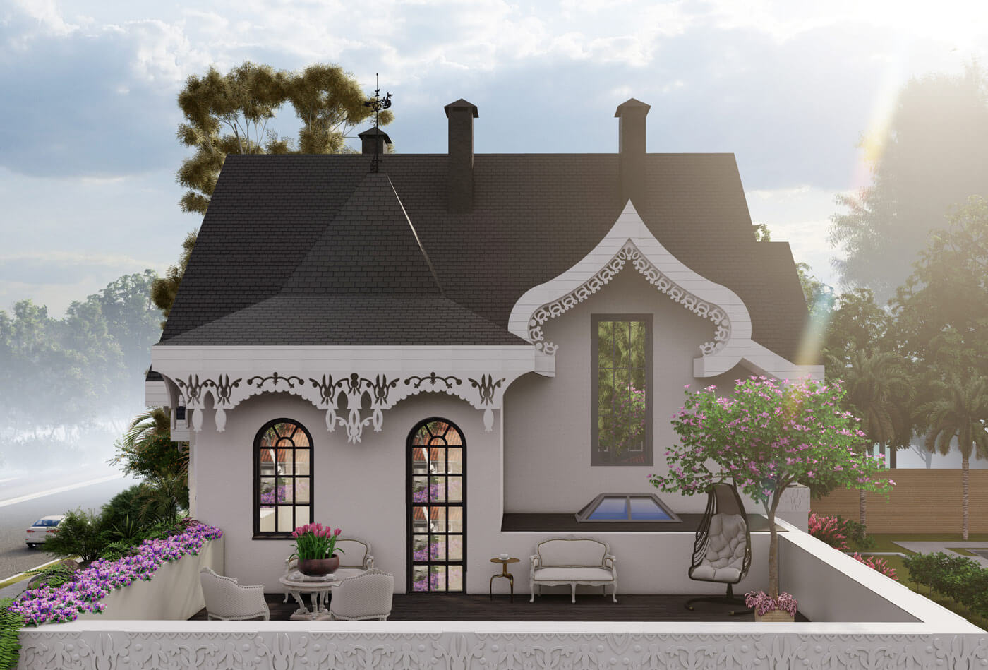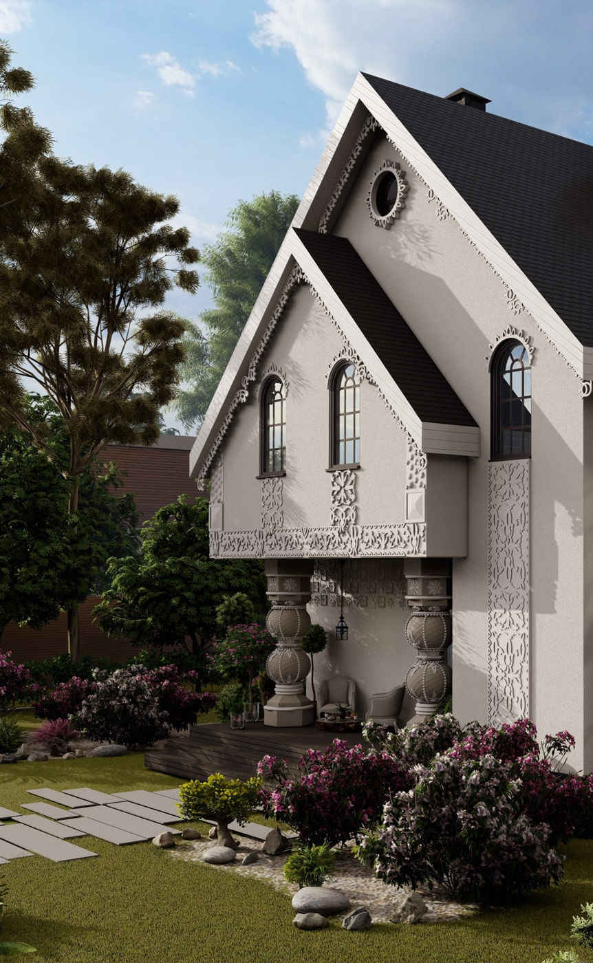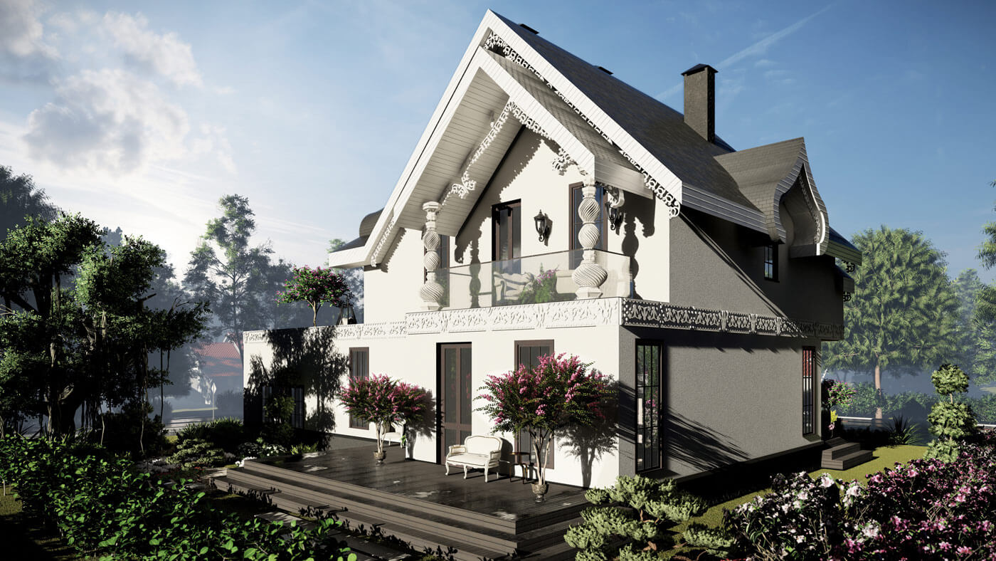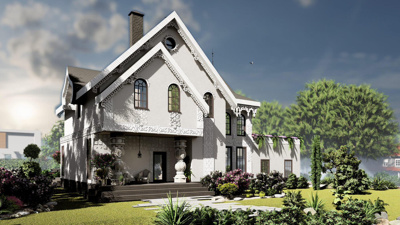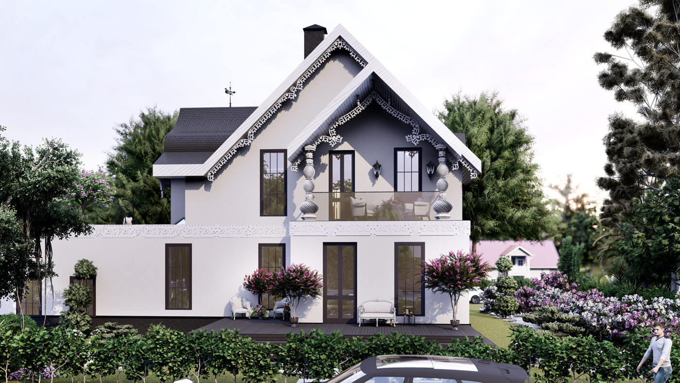 Пространство особняка формируется относительно главной ценности любой семьи — это быть вместе. Для этого скомпонована зона столовой и гостиной — смежные помещения. Гостиная, располагающаяся на первом этаже, освещена световым фонарем и имеет витражное остекление почти на всю высоту. Данное пространство связывает все планировочные элементы на первом этаже. Здесь же располагается лестница, соединяющая два этажа. В проекте предусмотрено 3 спальни (располагаются на втором этаже). В мастер-спальне предусмотрены санузел и зона гардероба, а также выход на балкон. Для теплого времяпрепровождения предусмотрен камин в гостиной, обеденный зал — для семейных обедов. В проекте присутствует несколько террас: две на первом этаже и одна на втором. Выход на террасу второго этажа осуществляется через лестницу. Так же предусмотрен гараж на два машиноместа.