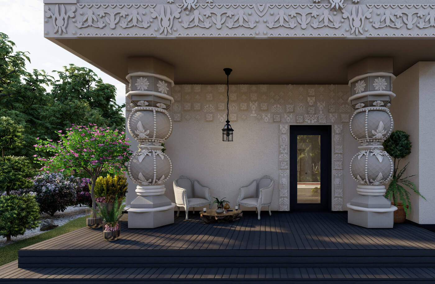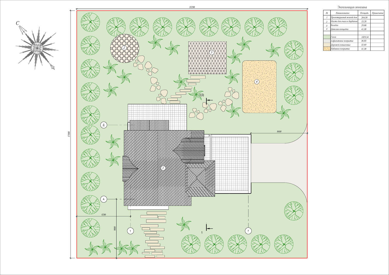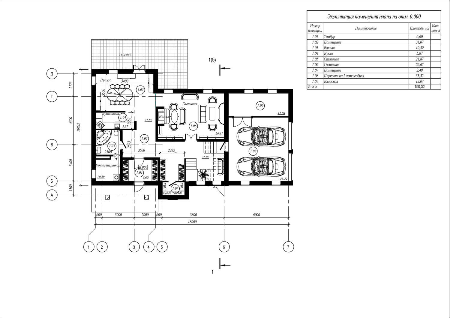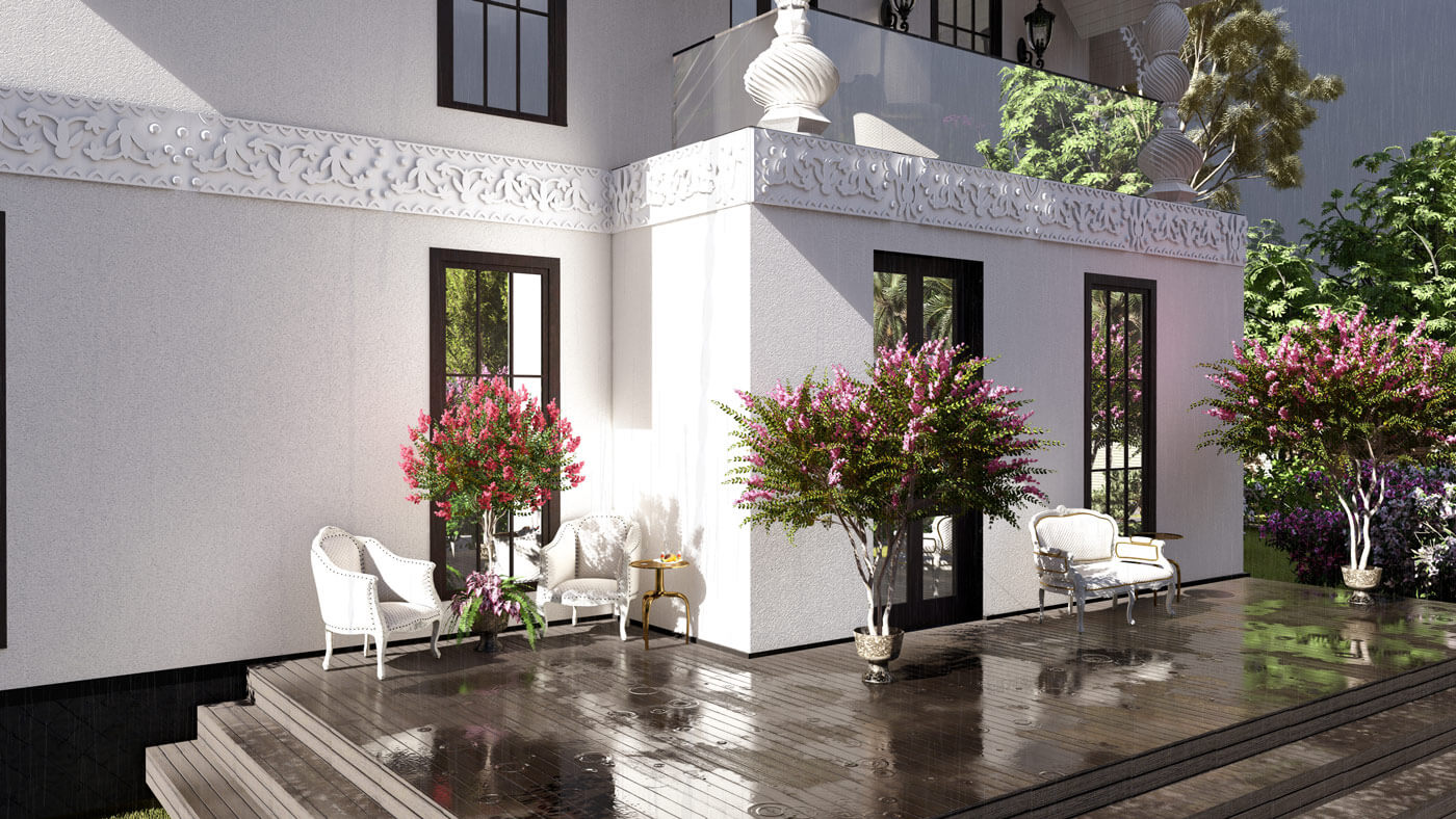 Пространство особняка формируется относительно главной ценности любой семьи — это быть вместе. Для этого скомпонована зона столовой и гостиной — смежные помещения. Гостиная, располагающаяся на первом этаже, освещена световым фонарем и имеет витражное остекление почти на всю высоту. Данное пространство связывает все планировочные элементы на первом этаже. Здесь же располагается лестница, соединяющая два этажа. В проекте предусмотрено 3 спальни (располагаются на втором этаже). В мастер-спальне предусмотрены санузел и зона гардероба, а также выход на балкон. Для теплого времяпрепровождения предусмотрен камин в гостиной, обеденный зал — для семейных обедов. В проекте присутствует несколько террас: две на первом этаже и одна на втором. Выход на террасу второго этажа осуществляется через лестницу. Так же предусмотрен гараж на два машиноместа.
