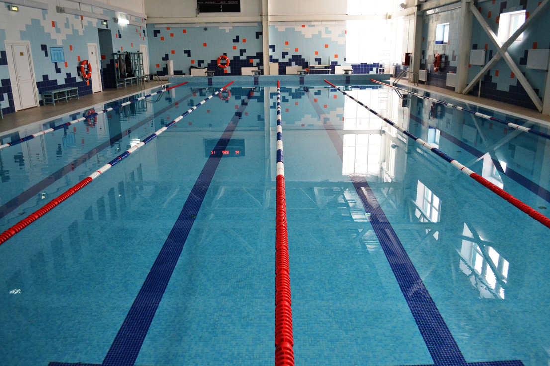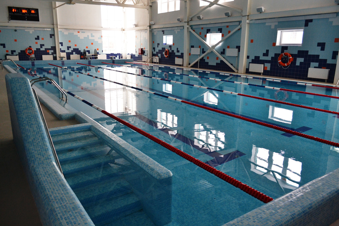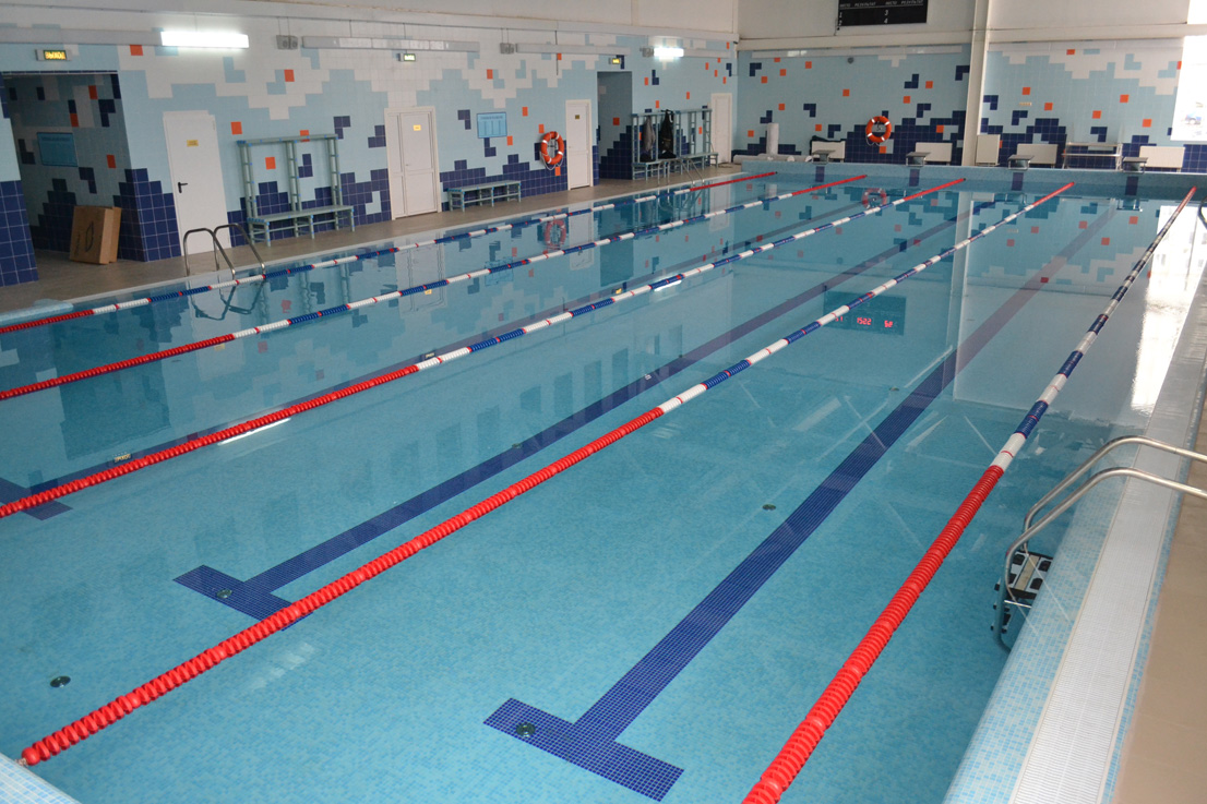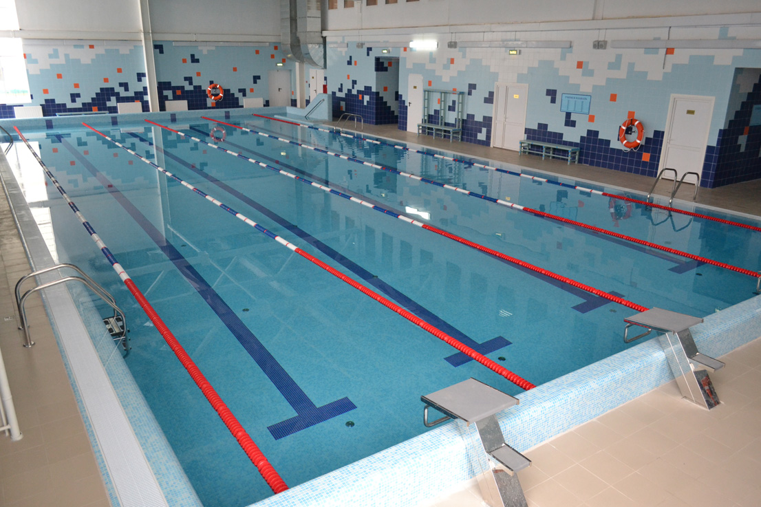 Бассейн переливного типа, предназначен для спортивного учебно-тренировочного и оздоровительного плавания. Все закладные элементы, лестницы, поручни выполнены из высококачественной нержавеющей стали. При отделке чаши бассейна использовалась стеклянная мозаика Trend (Италия) трёх цветов. Для удобства посещения бассейна детьми была спроектирована и реализована лестница римского типа.