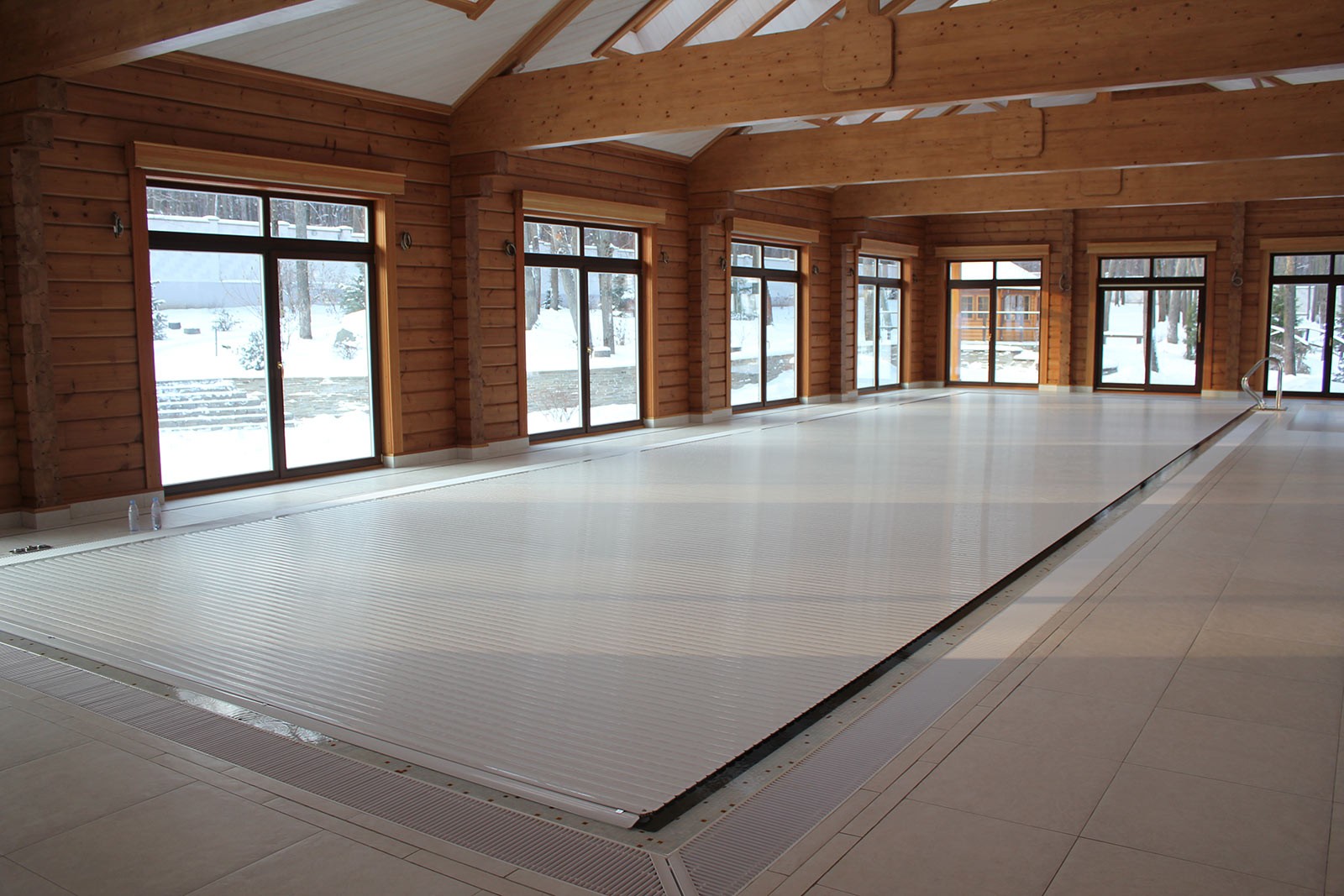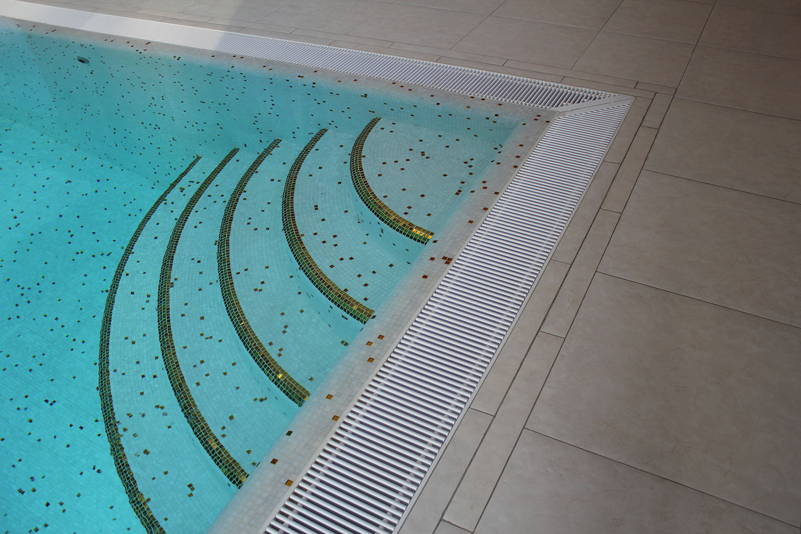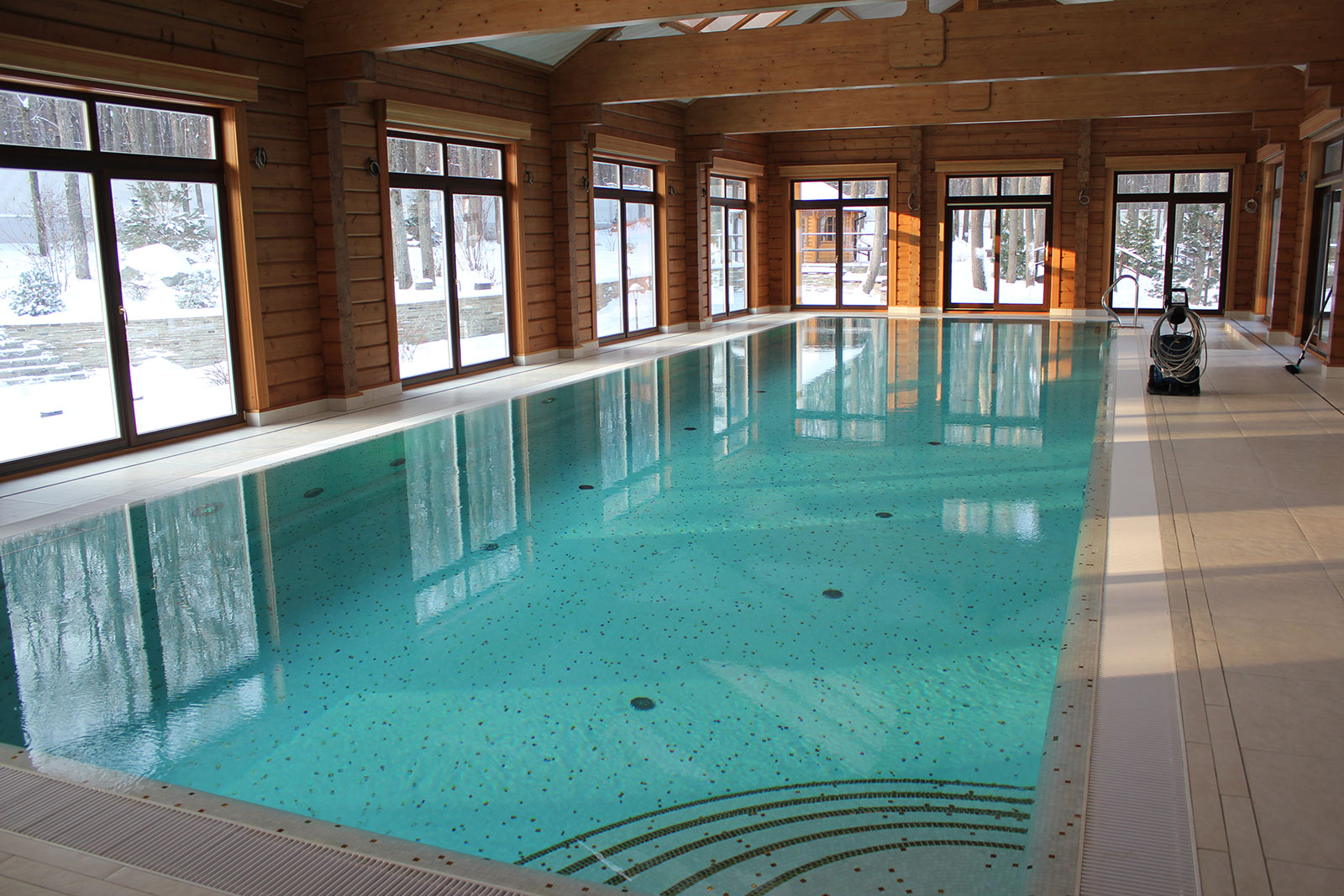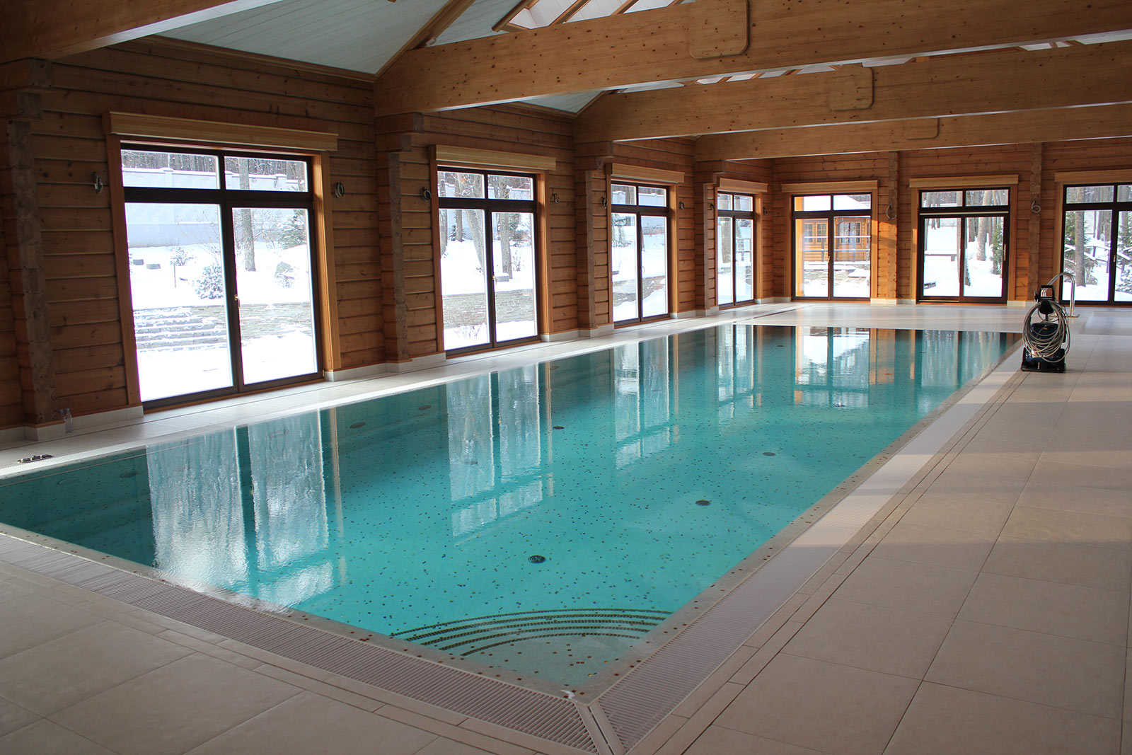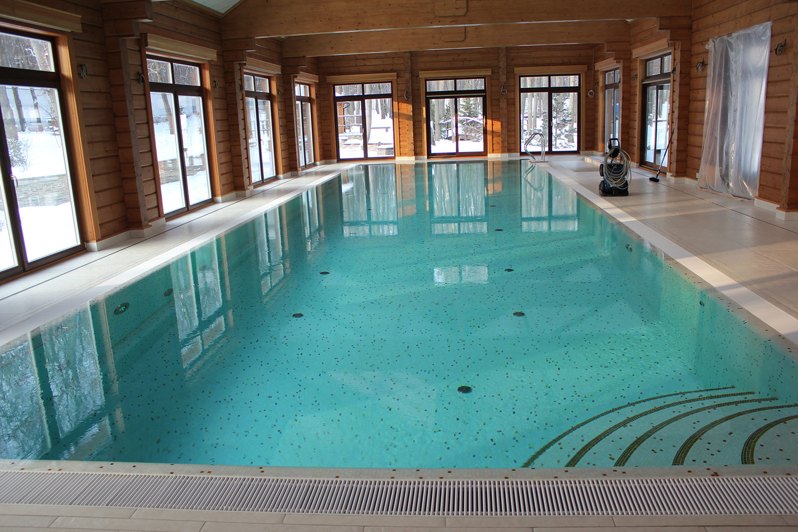 особенности форм: техническое помещение находится в цокольном этаже, под чашей бассейна. Переливная емкость бассейна выполнена в строительном исполнении, из бетона, с отделкой ПВХ пленкой для бассейна.