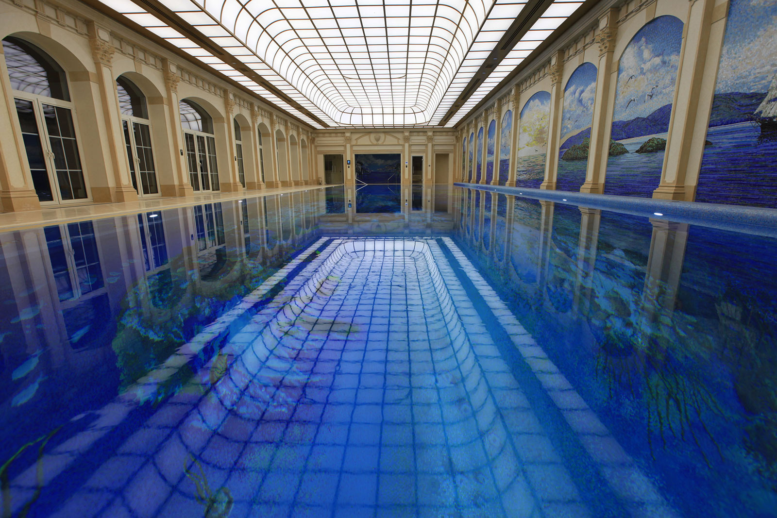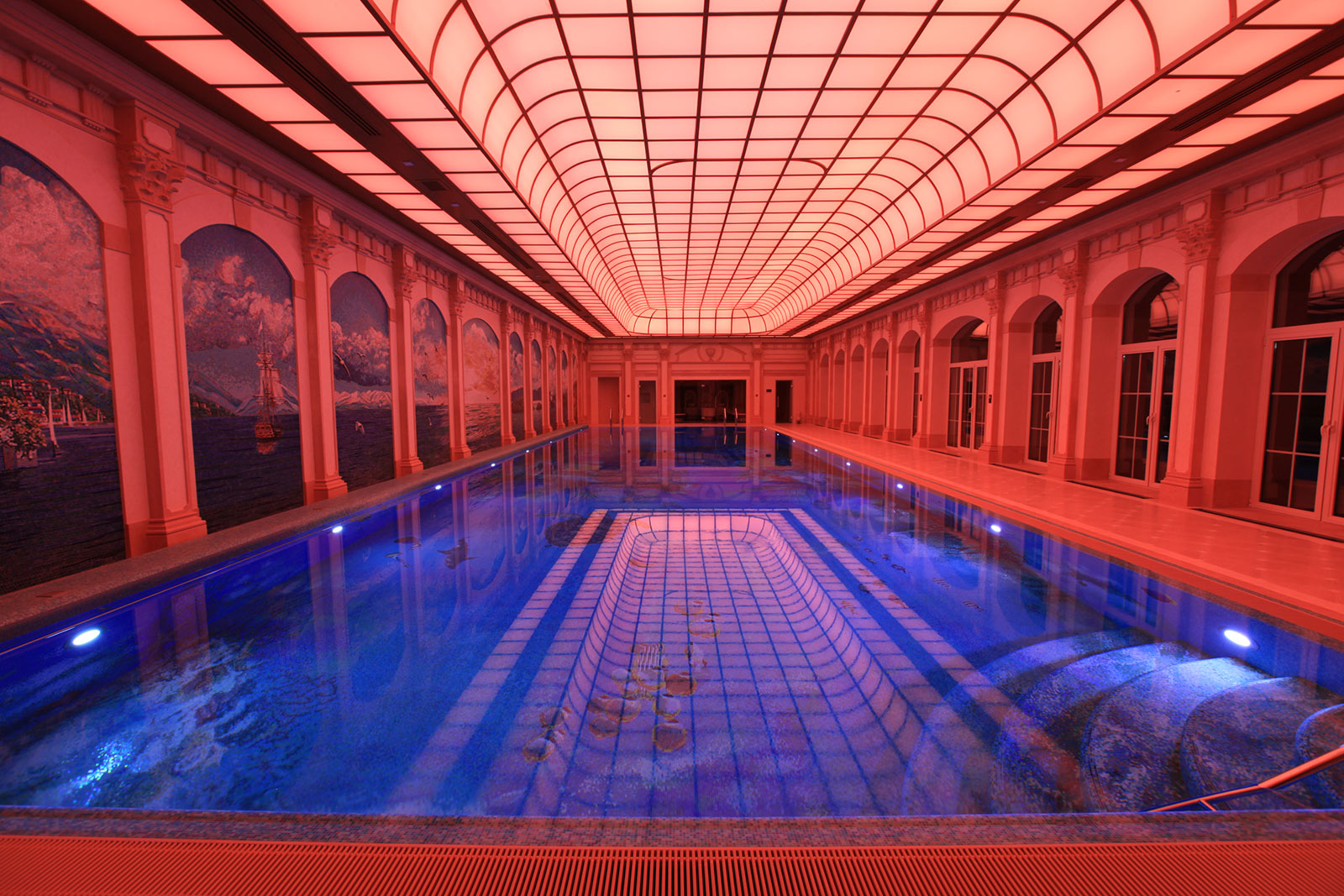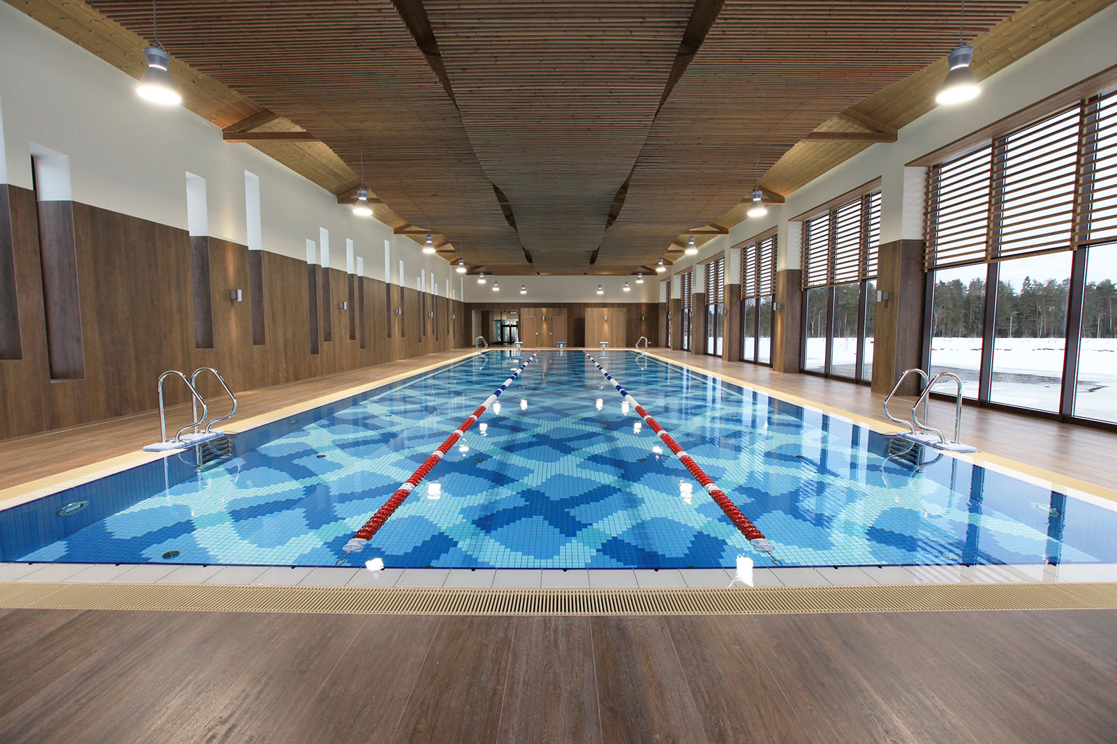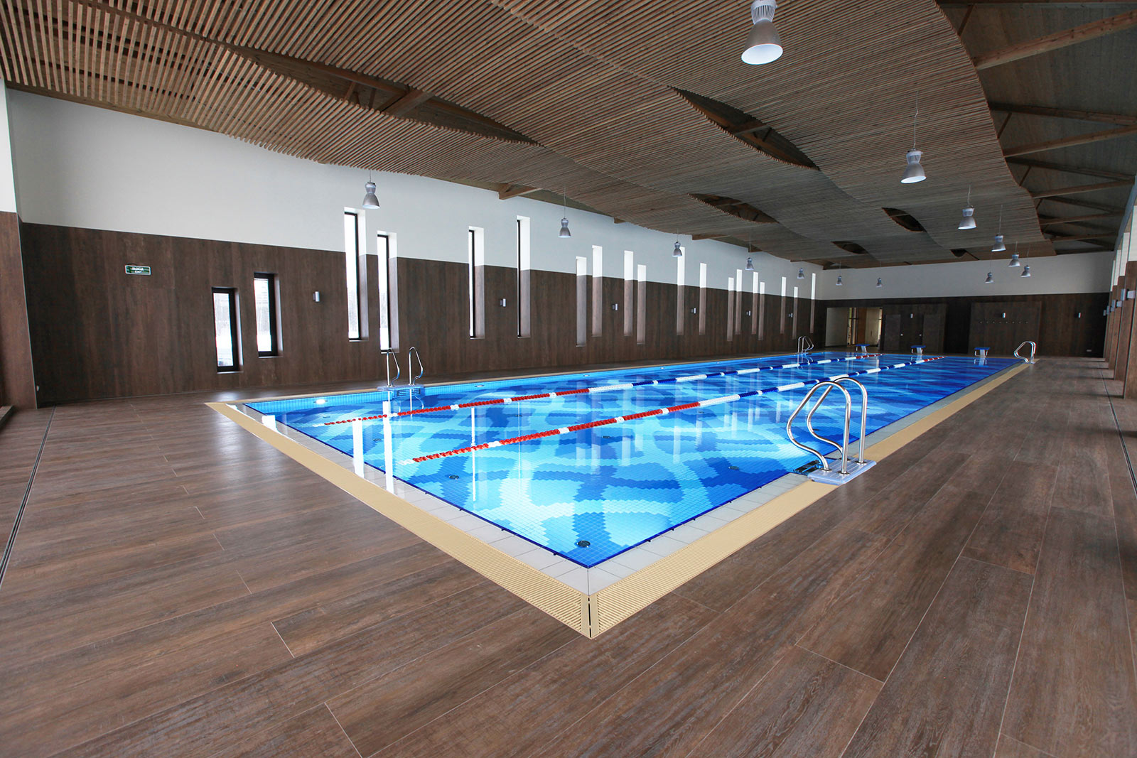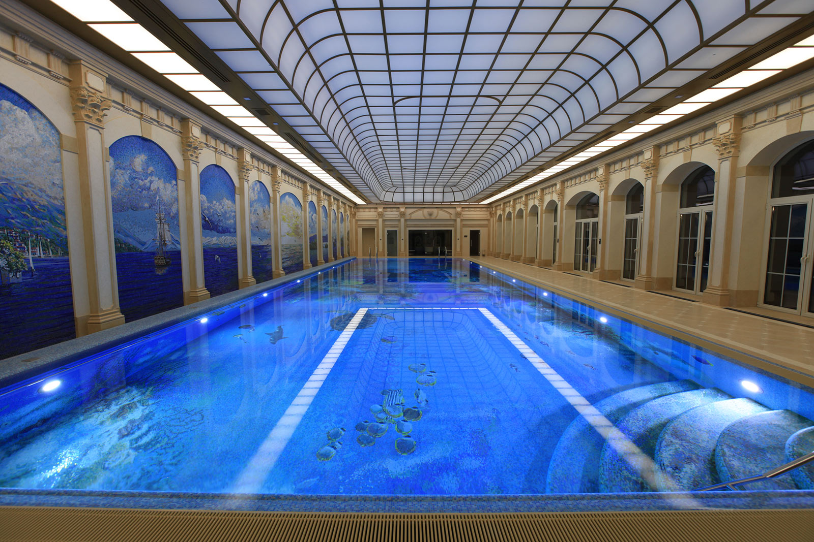 Параметры бассейна: 24,6 х 7,2 м, с переменной глубиной 1,45-3,0 м, объем 400 м³.