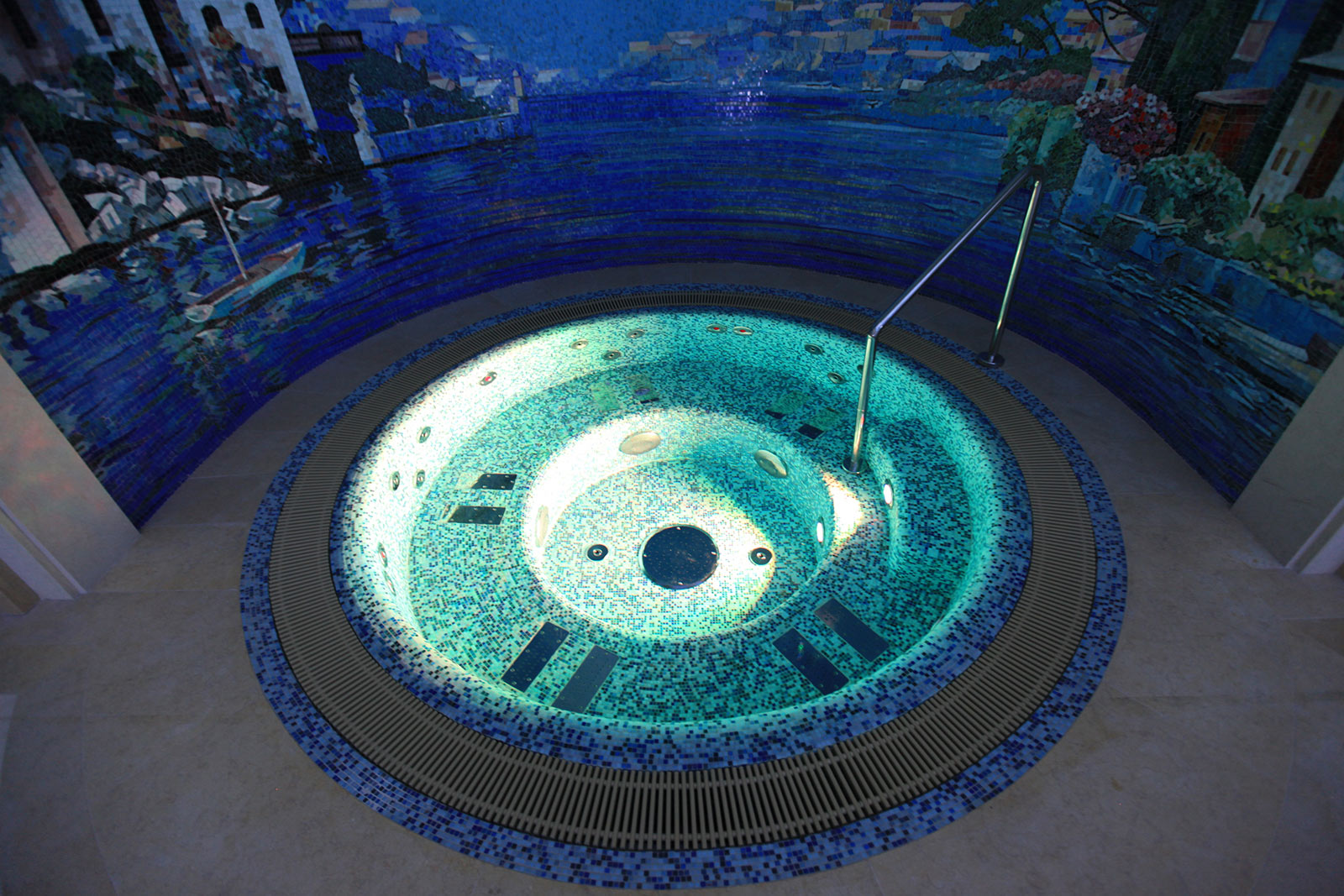 Гидромассажная ванна на 5 мест — d-2,1 м, глубина 0,95 м, объем 2,5 м³.