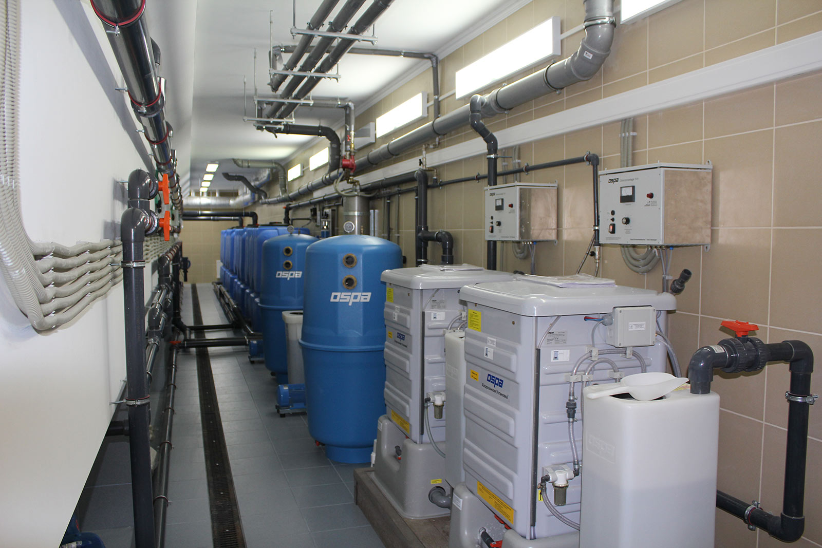 • Водоподготовка: комплексное оборудование фирмы Ospa, Германия. Комбинированная система «бассейн + гидромассажная ванна», с использованием частотных регуляторов насосов. Фильтр d-1000 мм -2 шт, насос Ospa 36 — 2 шт, хлорозонная установка 50 ELD — 2 шт, установка дозирования средств рН — 1 шт, установка дозирования коагулянта 1 — шт, измерительная станция — 1 шт, система управления Ospa BlueControl для комбинированной системы — 1 комплект.