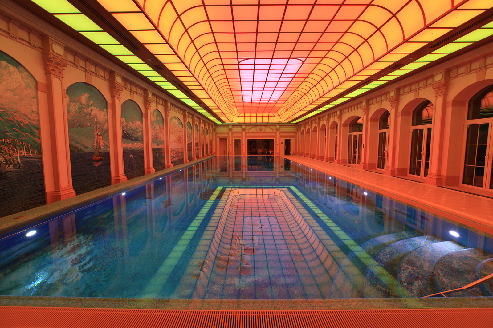 • Отделка потолка — витражный потолок с цветной RGB подсветкой.