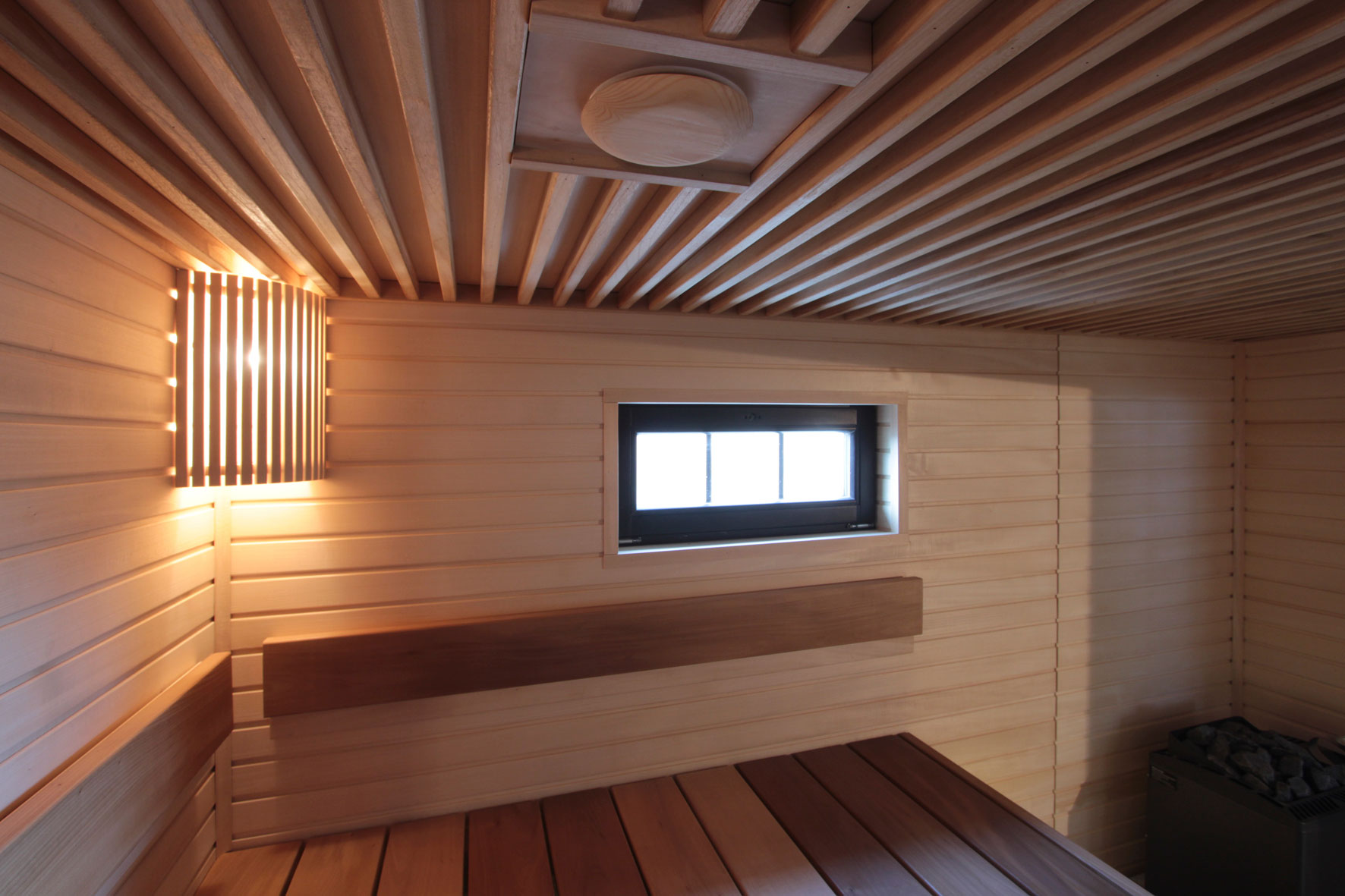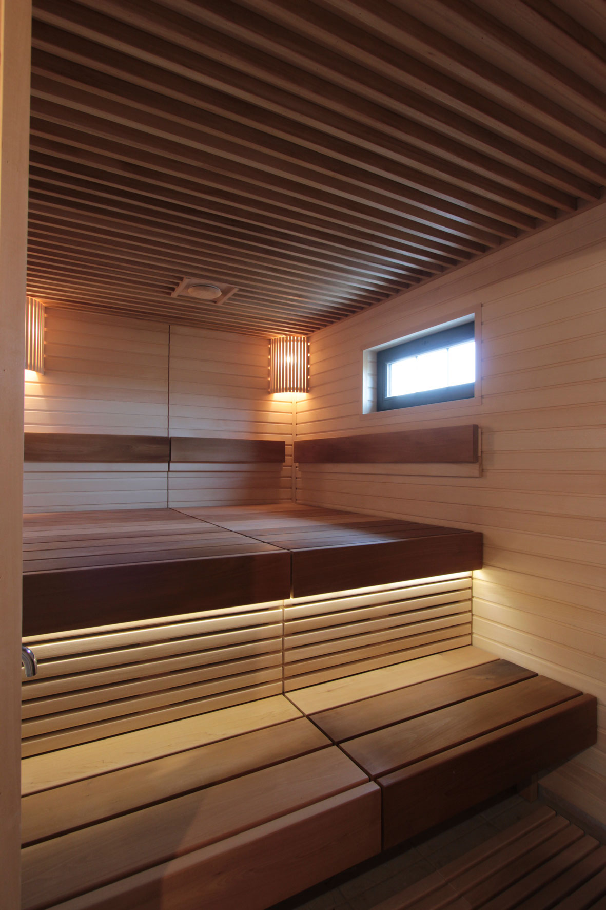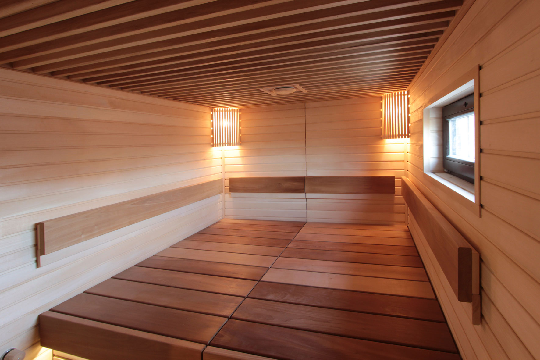стены — липа; потолок — липовая вагонка, расшитая липовым брусом; лавки – широкий брус термолипа; LED -подсветка за лавками.