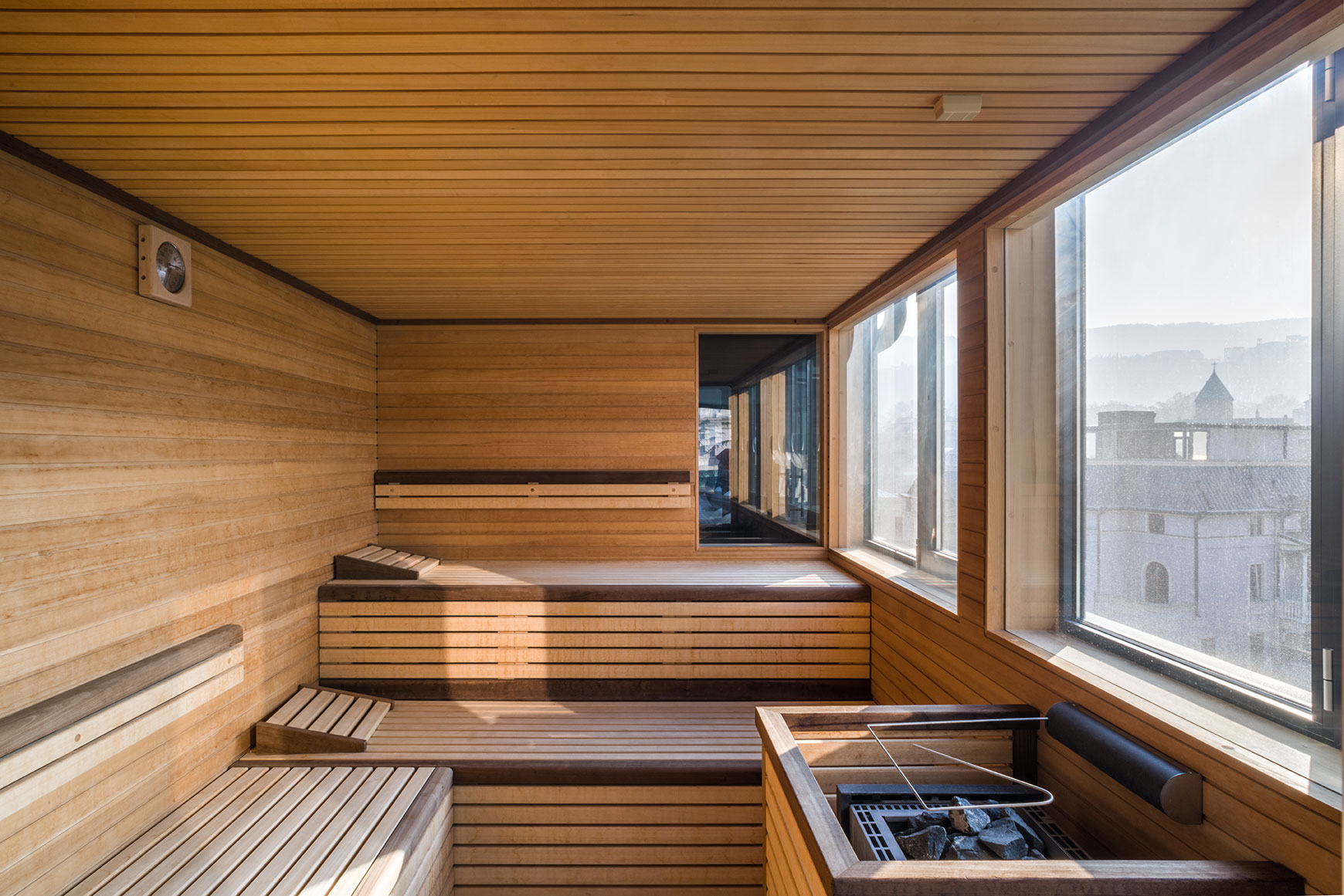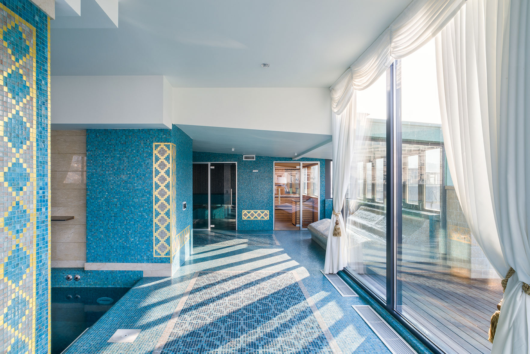 Рядом с бассейном располагаются сауна и хаммам с панорамным видом на центр старого города, ледогенератор, душ впечатлений и фитнес-зона с оборудованием Technogym. В Спа широко использовалась мозайка компании Project Italia, мрамор и большие зеркала.