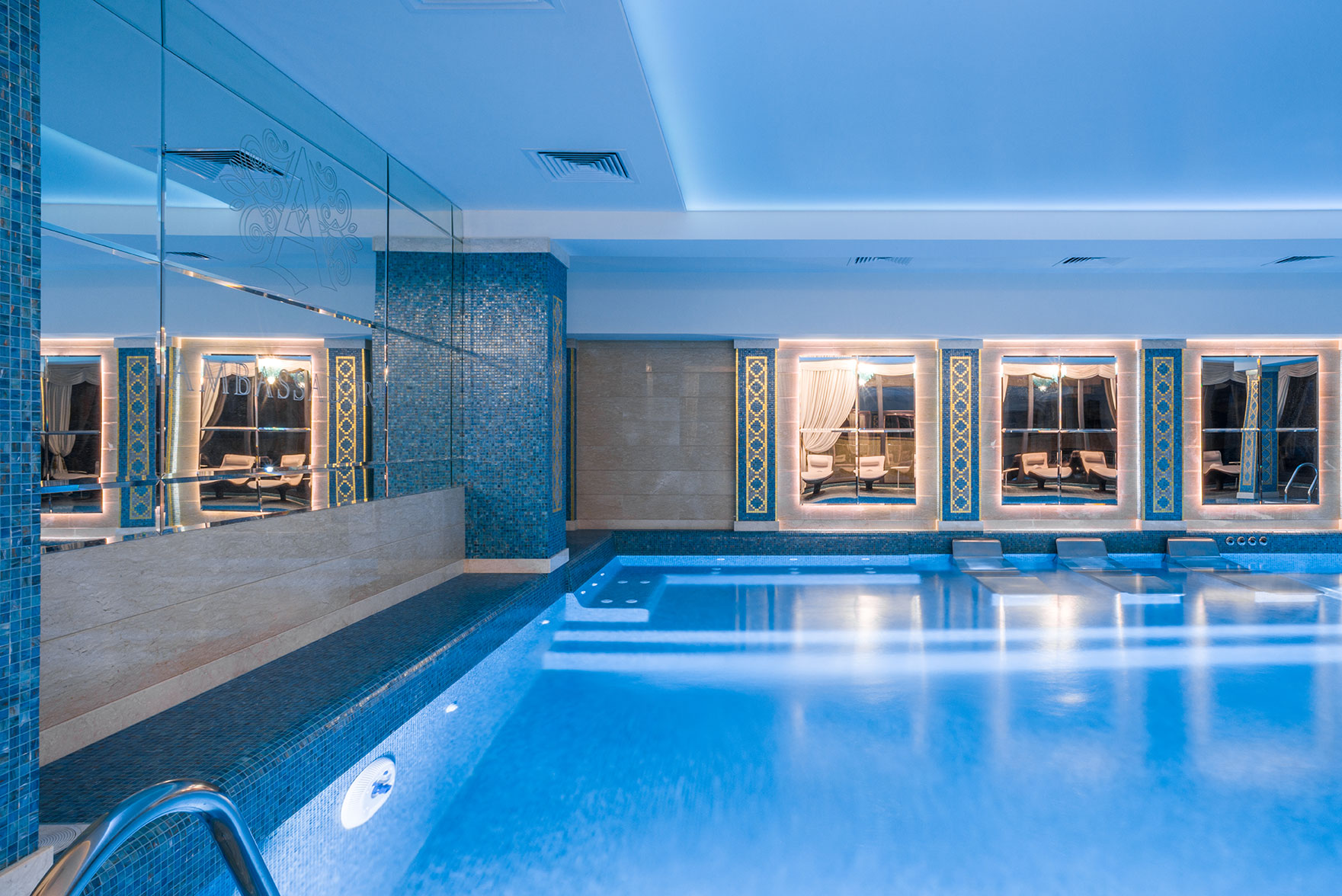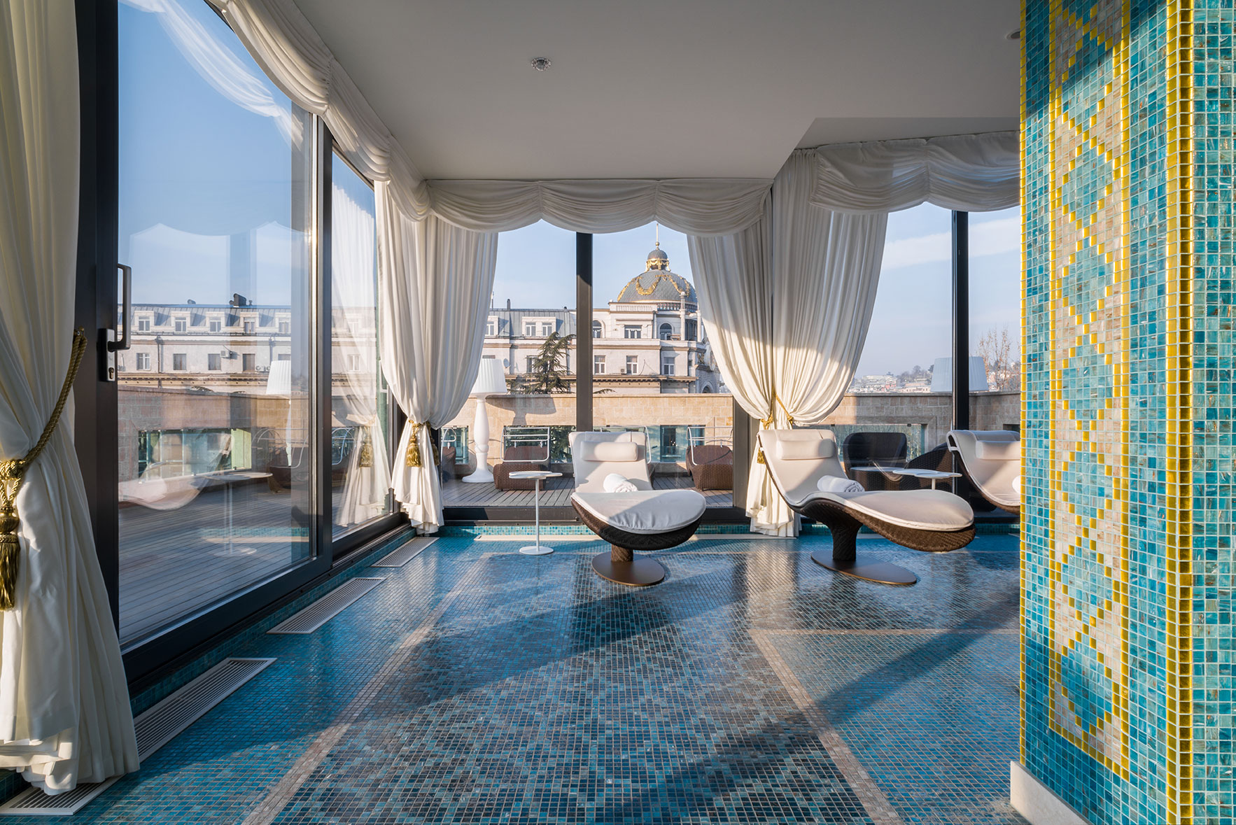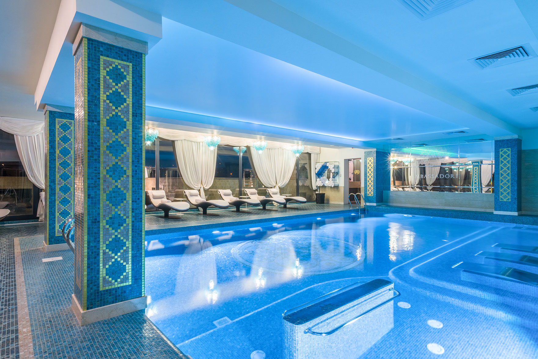 Дизайн-проект грандиозного отеля Ambassadori в Тбилиси, 260 м² которого занимает Спа-комплекс, расположенный между 4-м и 5-м этажами отеля. Спа состоит из бассейна в голубых тонах с большим декором из мозаики на дне, зоны с плаваньем против течения, шезлонгов Roberti Rattan, подсвеченные люстрами Patrizia Volpato, переливов воды.