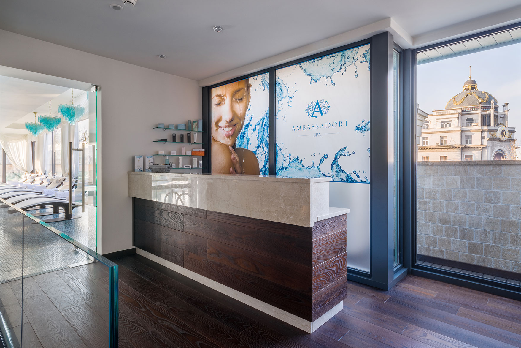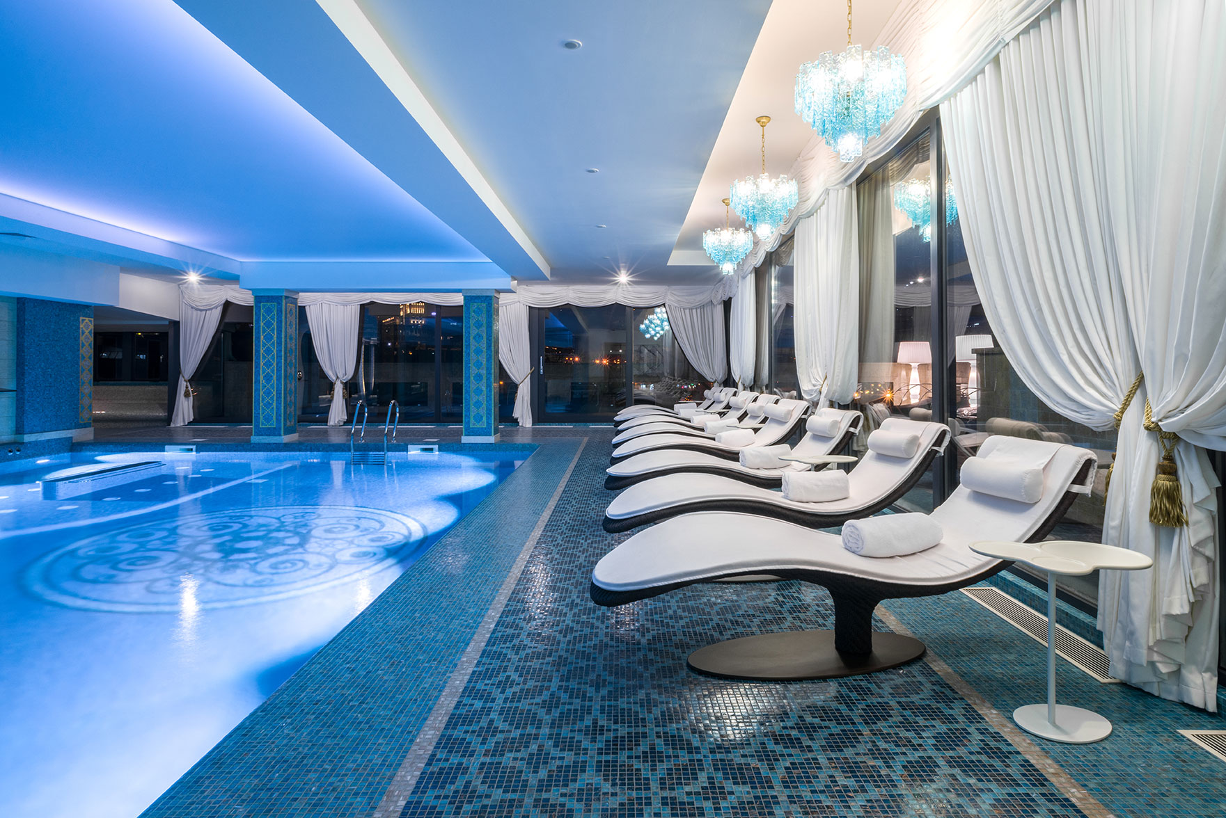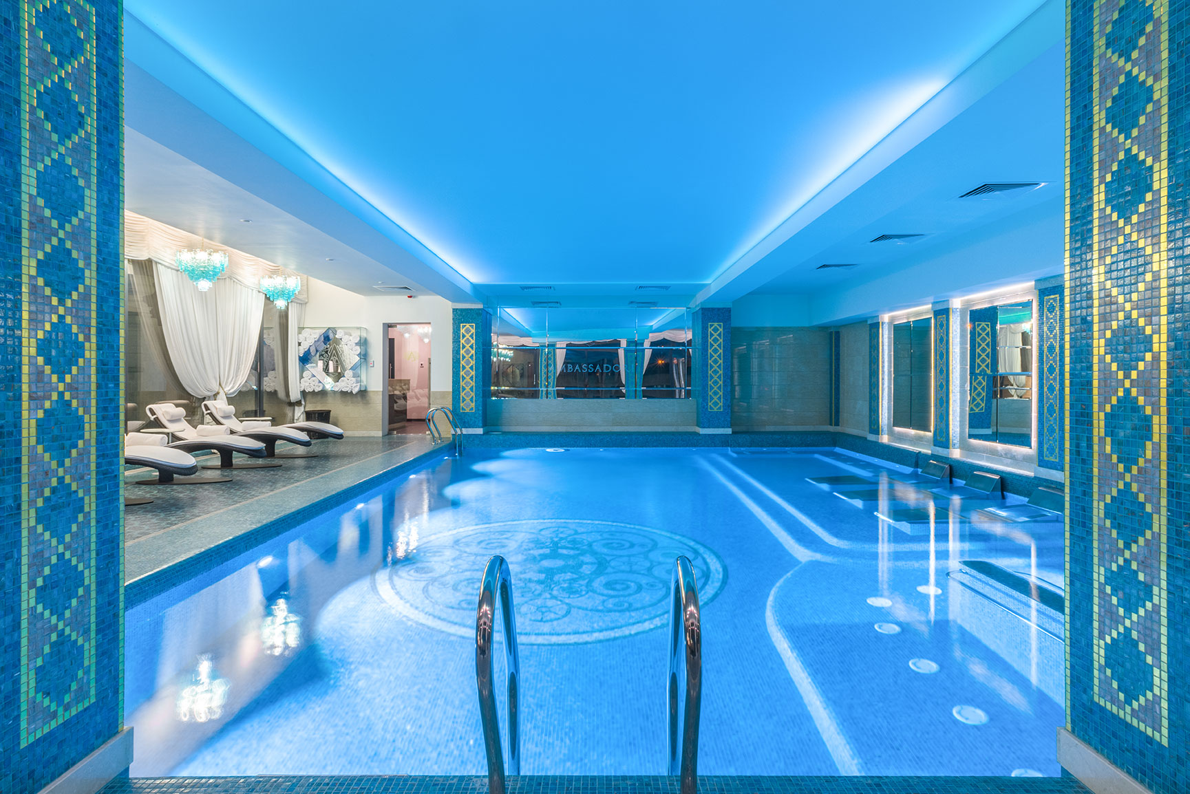 Дизайн-проект грандиозного отеля Ambassadori в Тбилиси, 260 м² которого занимает Спа-комплекс, расположенный между 4-м и 5-м этажами отеля. Спа состоит из бассейна в голубых тонах с большим декором из мозаики на дне, зоны с плаваньем против течения, шезлонгов Roberti Rattan, подсвеченные люстрами Patrizia Volpato, переливов воды.