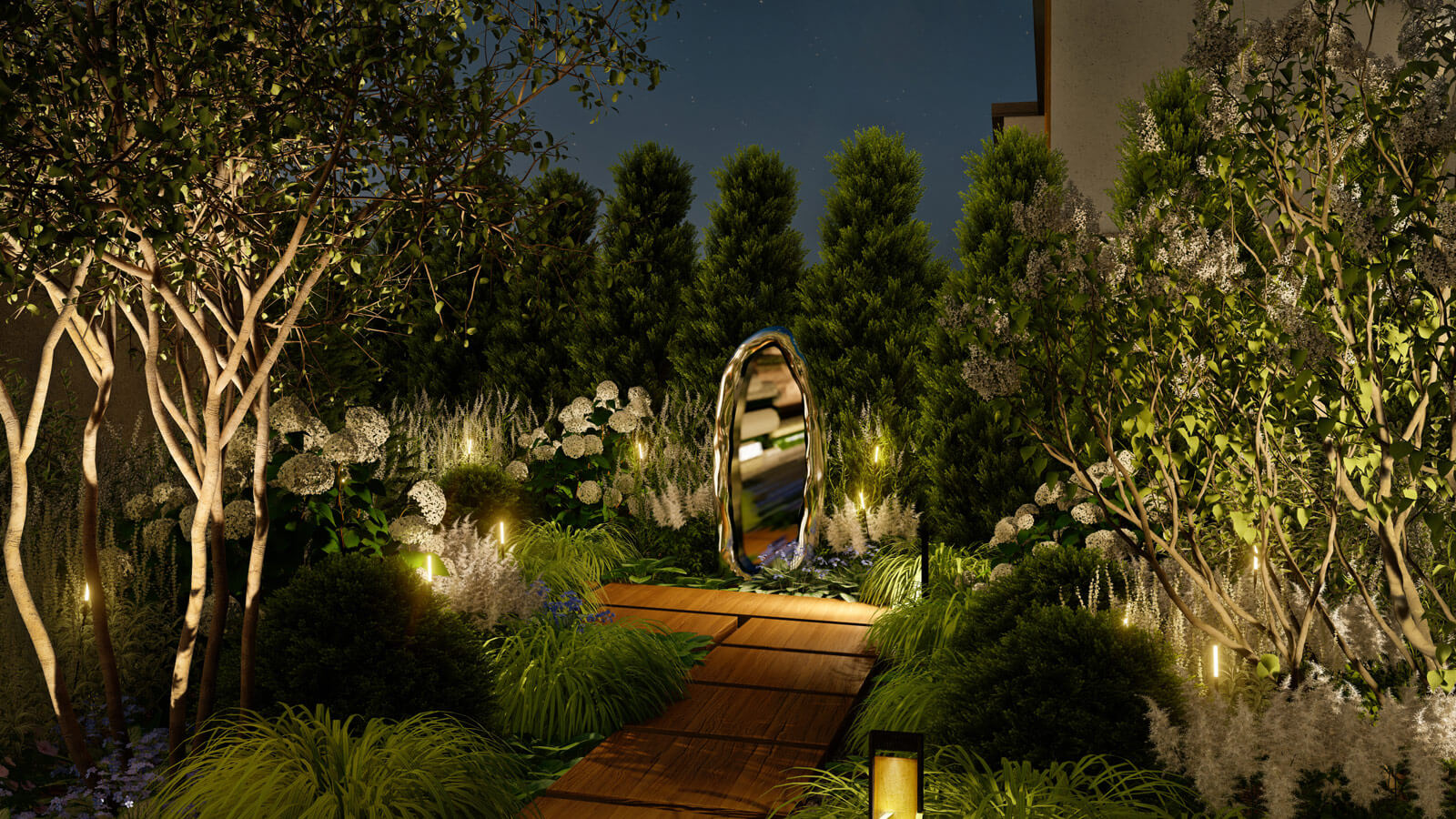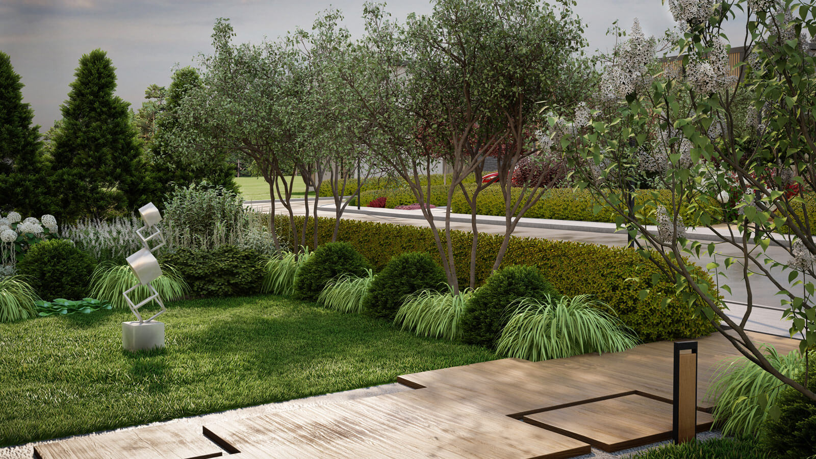 Источником баланса стал сад «Harmony». В саду располагается арт-объект в виде зеркала, который является точкой притяжения и символом сада. Посмотрев в него, можно гармонизировать свой внутренний мир, прийти к согласию с собой! Кроме того, с помощью зеркального отражения можно умножить красоту сада, зрительно удваивая, расширяя и увеличивая освещенность пространства. Также и инсталляция «Балансирующие кубы» где зеркальная поверхность скульптуры привлекает к себе внимание, эффектно выделяясь на общем фоне монохромного сада. Ландшафтные композиции - в единой цветовой гамме с преобладанием белого оттенка.