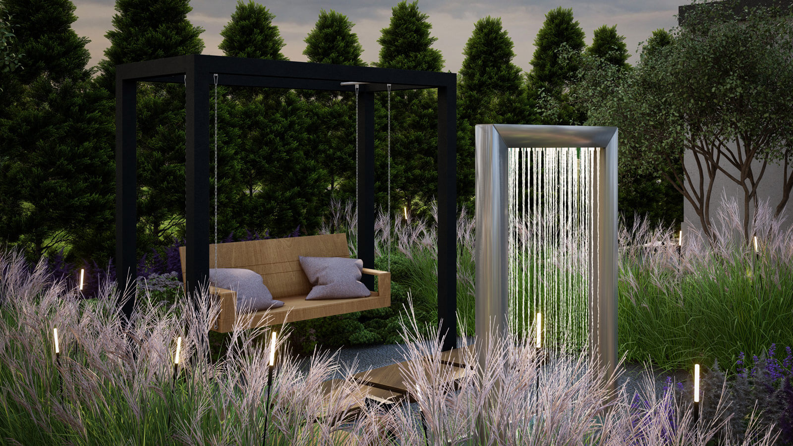 Сад «Calmness» пропитан атмосферой безмятежности и умиротворения, что помогает отдохнуть от городского шума, забыть о повседневных заботах и просто насладиться моментом. На открытой зеленой лужайке можно заняться йогой, медитацией или просто насладиться уединённым часом со своими мыслями. А в специально обособленной «зелёной комнате» с помощью массива из злаков расположилась живописная арка-водопад. Журчащая вода отвлекает от суеты и стресса, а своим звуком не только успокаивает человека, но и уменьшает фоновые шумы вокруг.