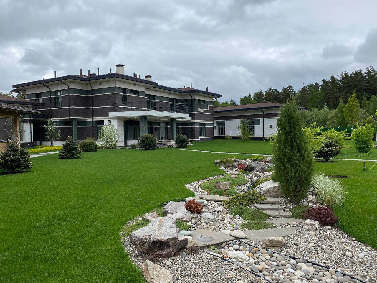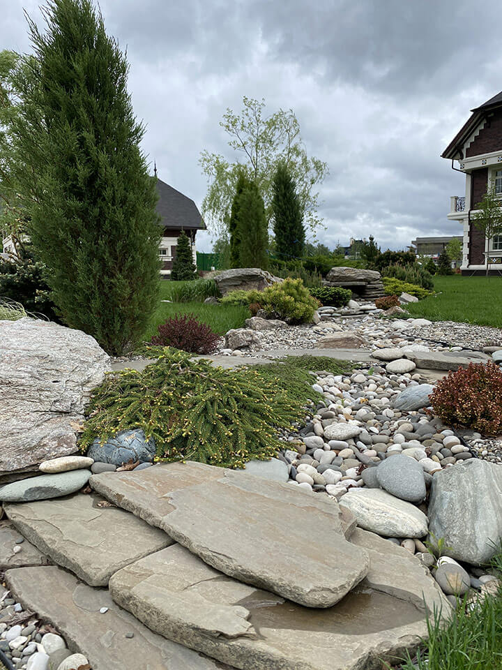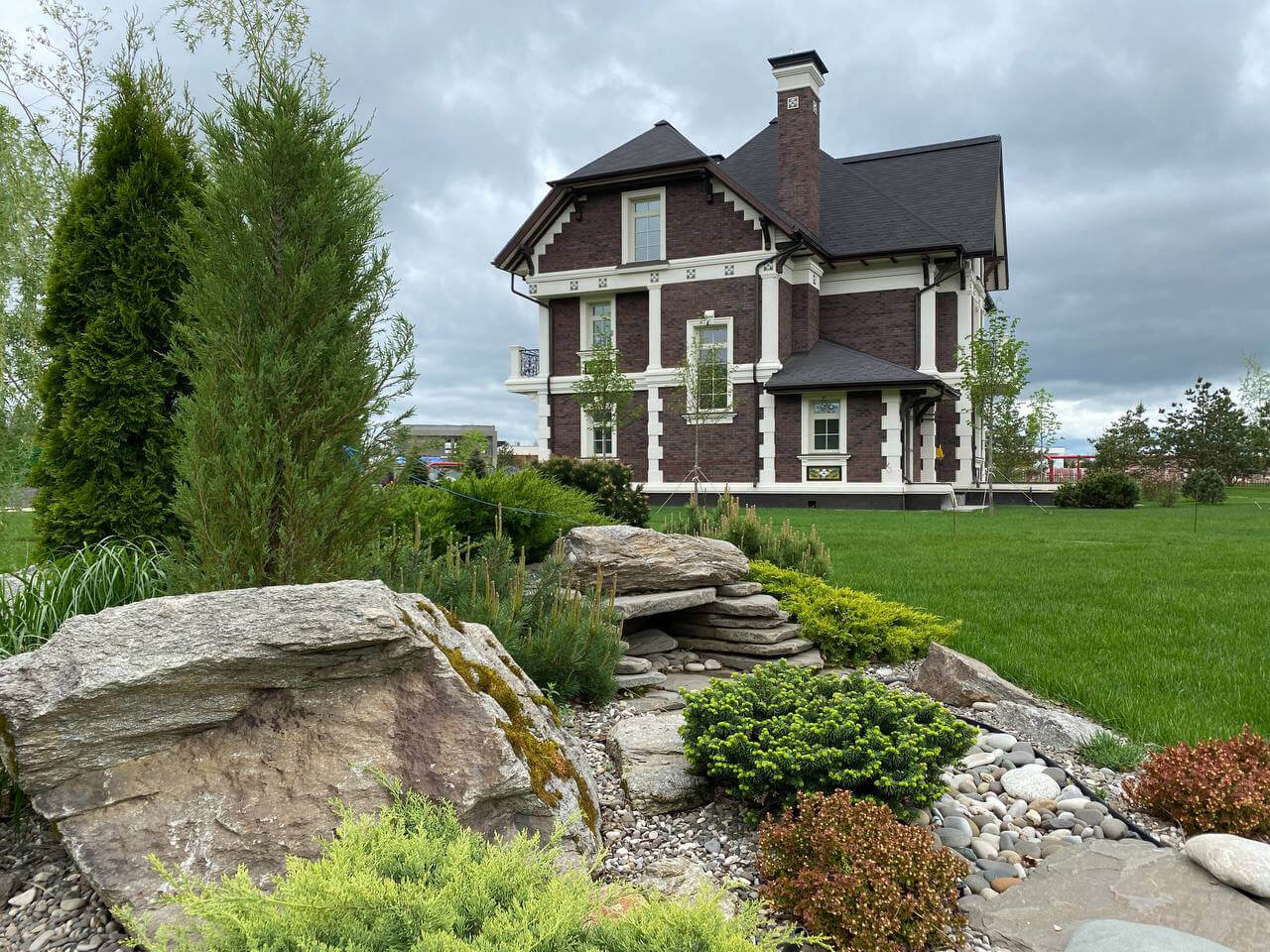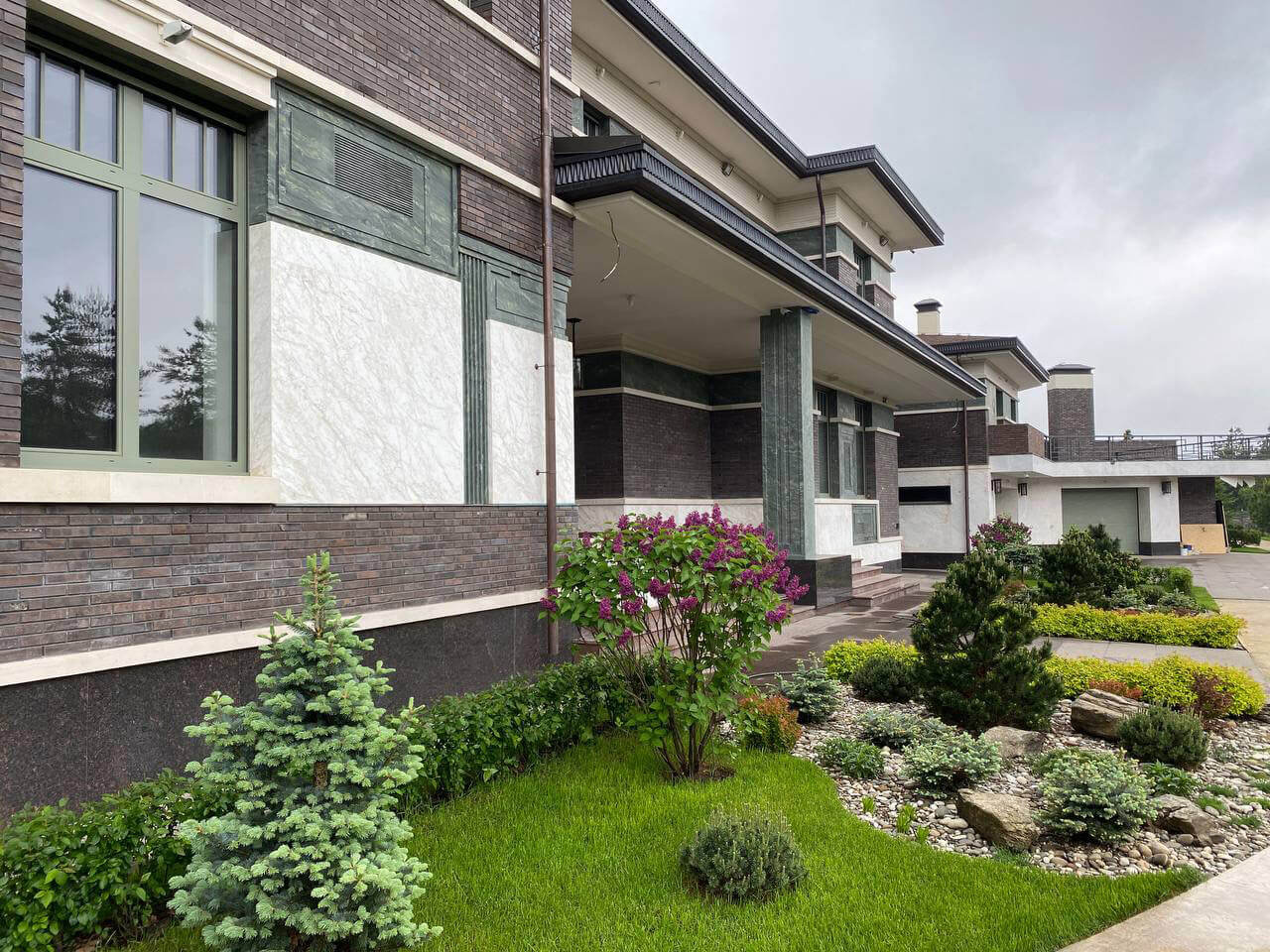На участке расположено два дома – главный и гостевой, каждый из которых имеет свою непохожую друг на друга архитектуру. Основной дом украшает композиция в виде рокария из невысоких хвойных растений, в сочетании с многолетними цветами, валунами и галечной отсыпкой. Напротив входа главного дома сделана небольшая площадка из гранитных плит для гостевой лавочки, в обрамлении кизильника, азалий и спирея японской. На заднем плане вдоль забора высажена изгородь из туи «Smaragd», кедровые сосны, пихта корейская «Samling» ель колючая «Fat albert».
