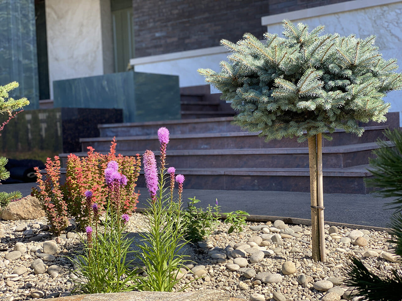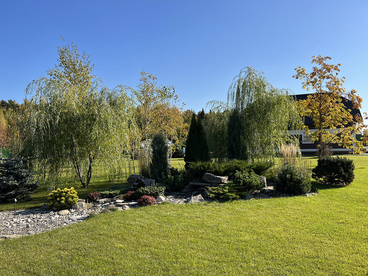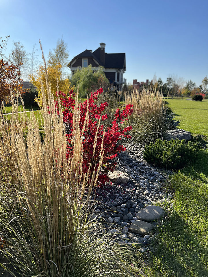 На заднем плане группами расположились бересклет крылатый, клён гиннала, ель колючая «Glauca globoza», большие горные шаровидные сосны «Mops», привезенные под заказ из европейских питомников.