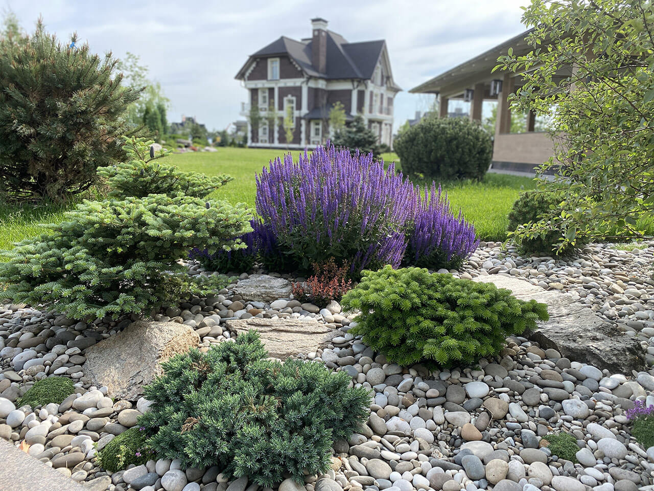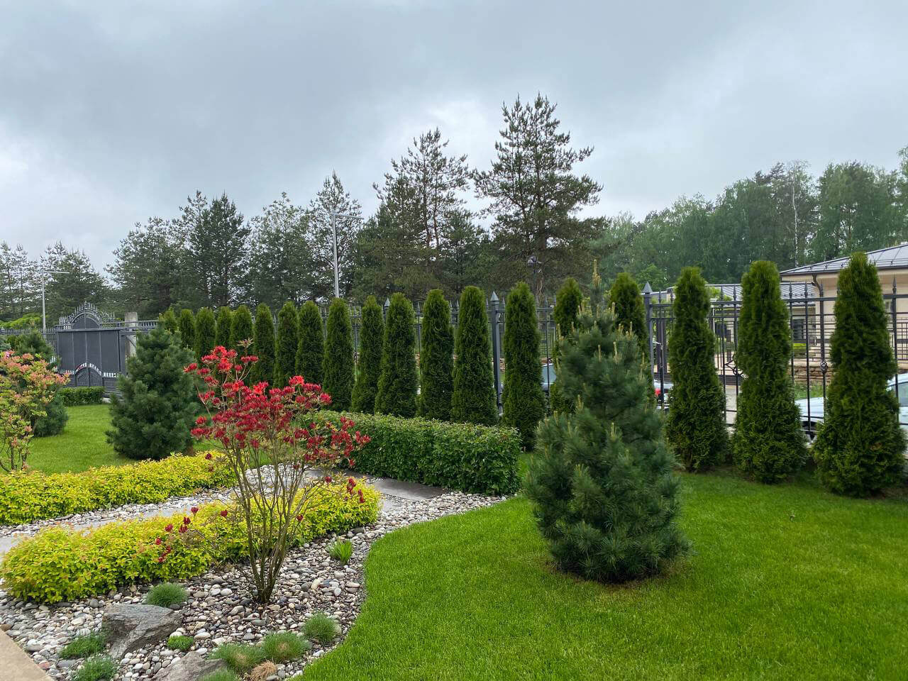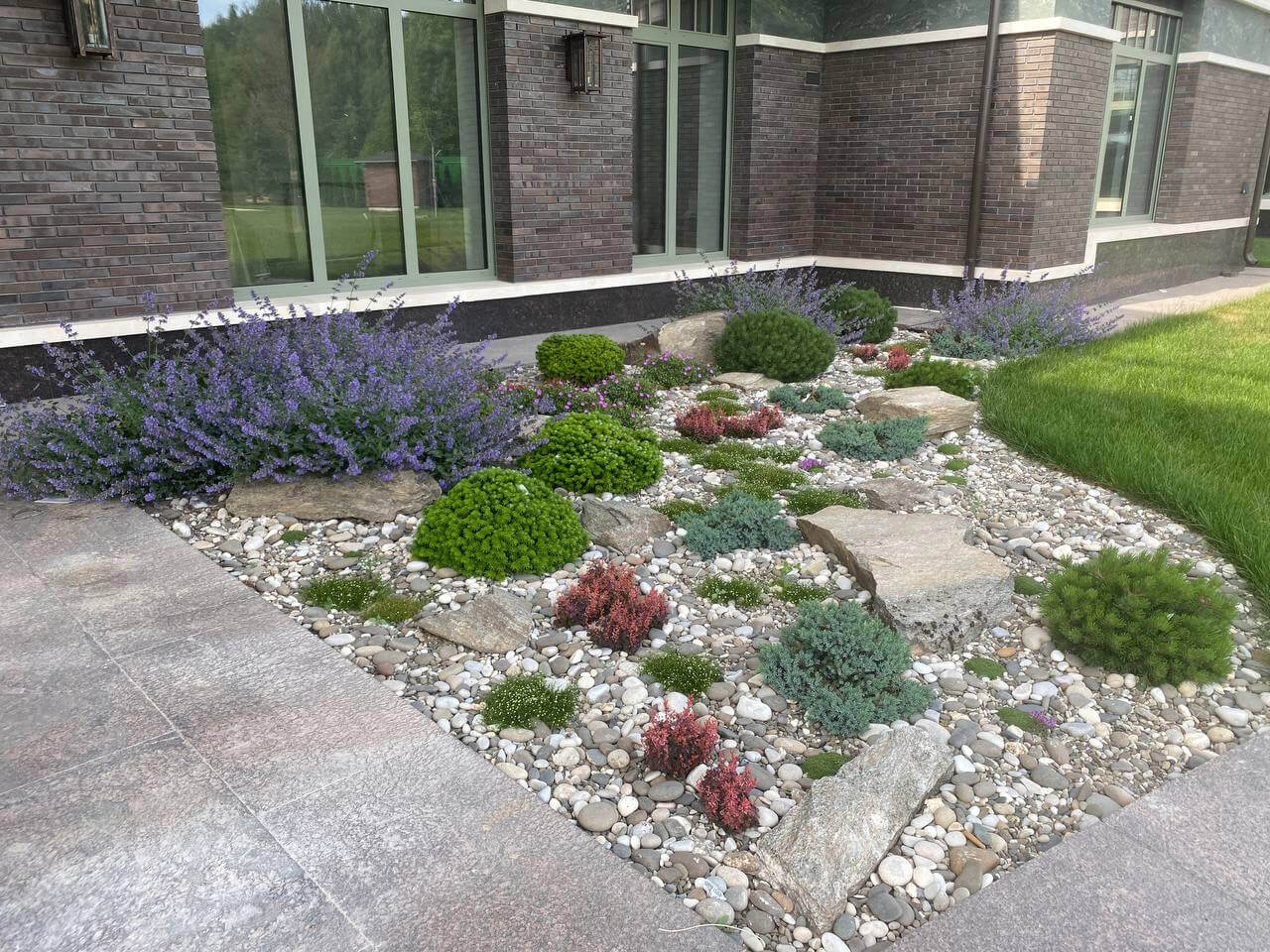 На заднем плане группами расположились бересклет крылатый, клён гиннала, ель колючая «Glauca globoza», большие горные шаровидные сосны «Mops», привезенные под заказ из европейских питомников.