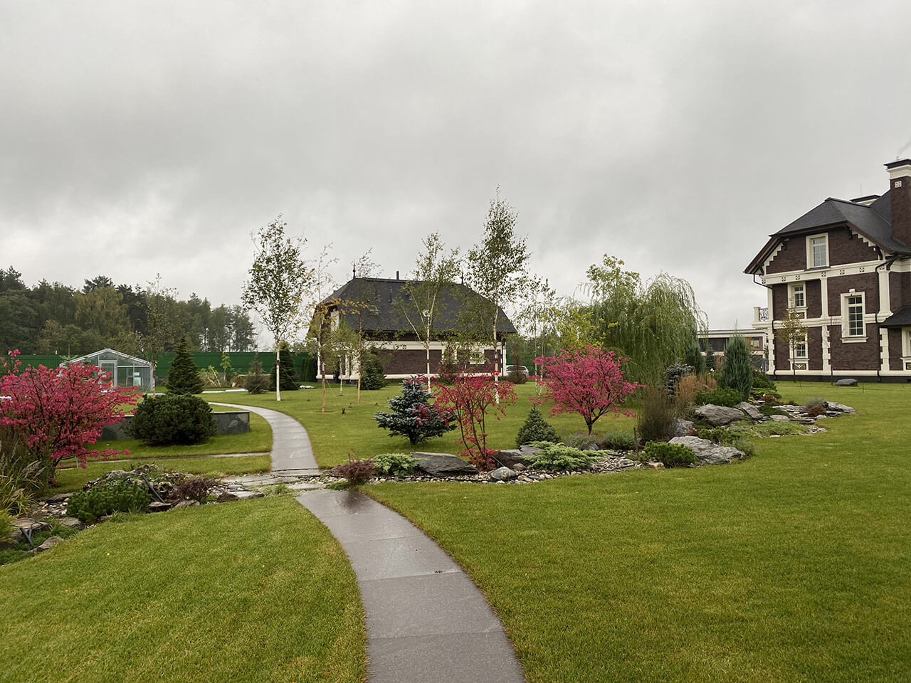 На участке нашли своё место просторная беседка, теннисный корт, плодовый сад с огородом и теплицей, беговая дорожка. Такой сад очень похож на пейзажный парк т.к. он прекрасен в любой сезон. Весной распускаются листья на всех деревьях, цветет сирень, азалия, спиреи серые. Лето сезон цветов – пышно цветёт шалфей, вероника, дербенник, лиатрис, вейник, тимьян, герань, котовник и многие другие. Осенью яркими пятнами выступают малиновые бересклеты, красные клены, жёлтые липы, дубы и орехи. Зимой сад частично скрывается под покровом снега и на передний план выходят хвойные деревья – пихты, ели, сосны, можжевельники и туи.