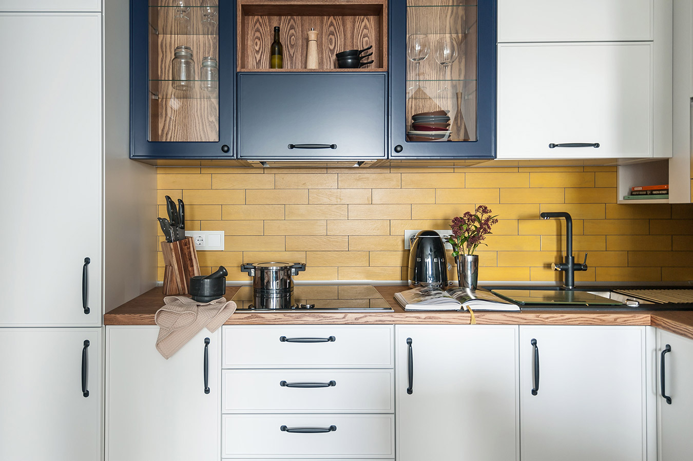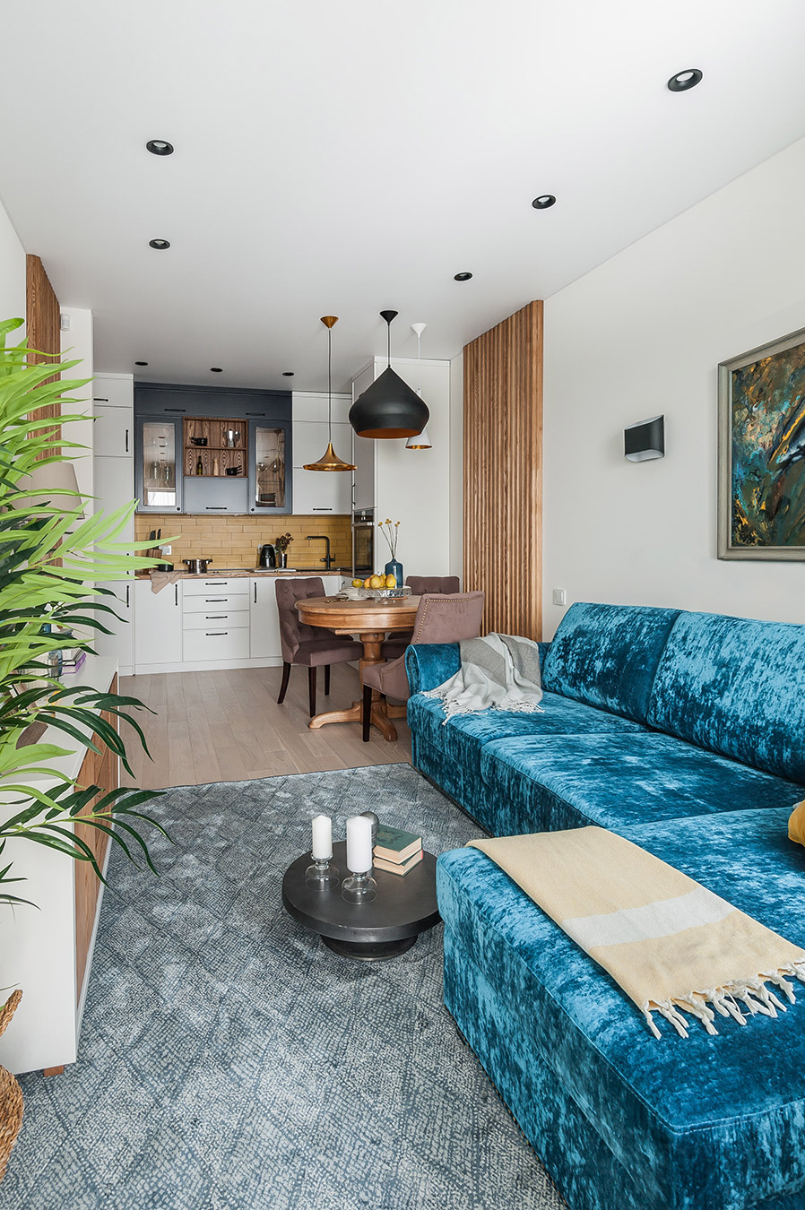 Дизайн квартиры получился легким, насыщенным, эмоциональным за счет внедрения сочных цветов. Желто-охристый, чернично-синий, сине-изумрудные оттенки, представленные отделкой и материалами создали яркий, запоминающийся, жизнеутверждающий образ. Стены покрыты английской краской Zoffani и Sanderson. В гостиной это теплый оттенок белого, в спальне — глубокий устрично-бежевый. Потолки белые, натяжные, пол — паркетная доска Coswick, дуб «белый иней» молочного оттенка с выраженной текстурой.