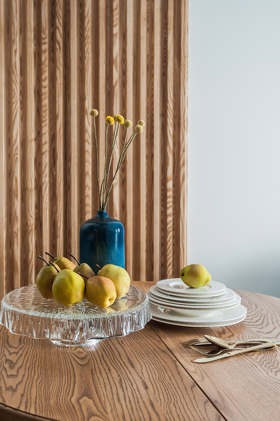 Для стен выбран лаконичный белый цвет, который стал прекрасным фоном для деревянных резных панелей, выполненных из ясеня с богатой текстурой и вырезанных по принципу выдавленных цилиндров. Тему дерева продолжают панели в спальне более темного оттенка. В целом в данном проекте используется много натурального дерева. Акцентными элементами являются металлические подвесы над обеденной зоной, низкий восточный столик, черные локальные вкрапления.