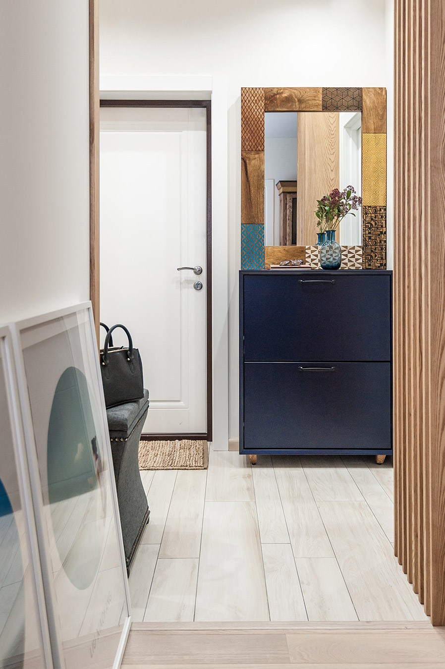 Концептуально дизайн квартиры выстроен на основе современной классики, дополняемой элементами других стилей. Интересным является сочетание разных предметов мебели, светильников, декора между собой. При входе гостей «встречает» сервант для посуды, выполненный по эскизам авторов проекта. Он служит символом уюта и вводит в обстановку тему дерева.