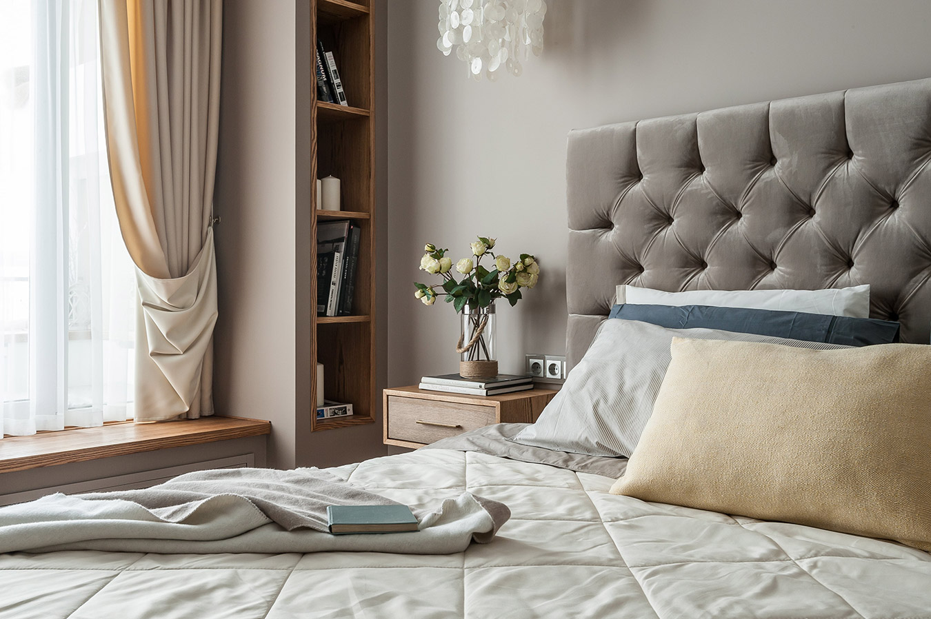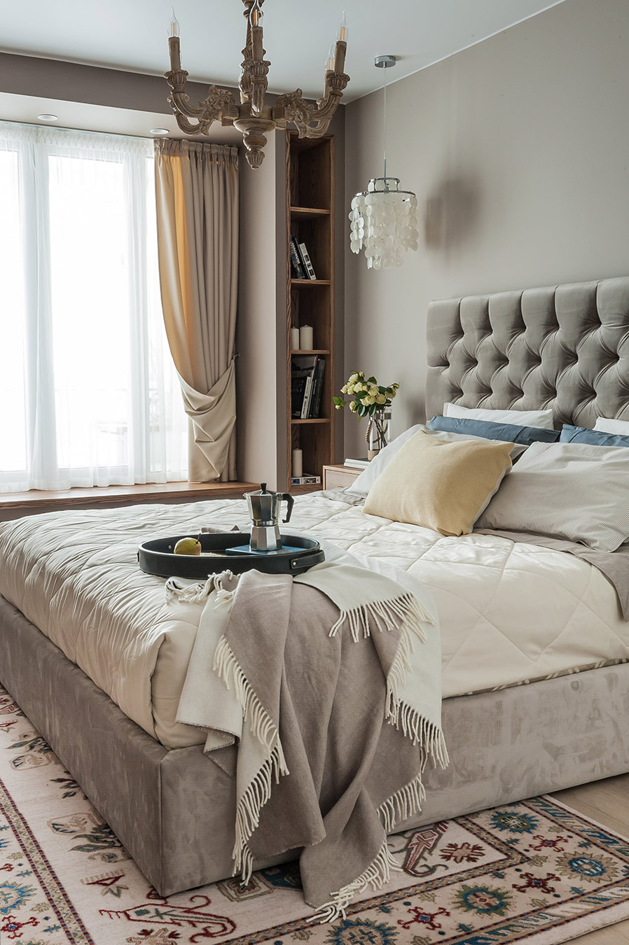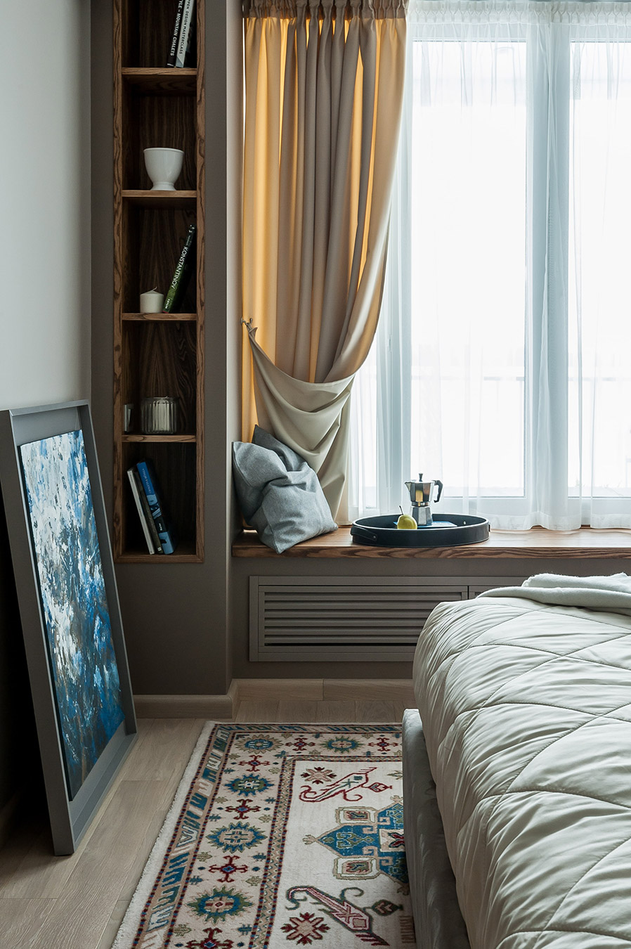 Спальня, в отличие от эмоциональной гостиной, спокойная и уютная. Она выполнена в пастельных оттенках. Мягкая зона у окна сформирована конструкцией портала, в котором по бокам размещены ниши для хранения книг. Здесь хорошо проводить время за чтением книг.