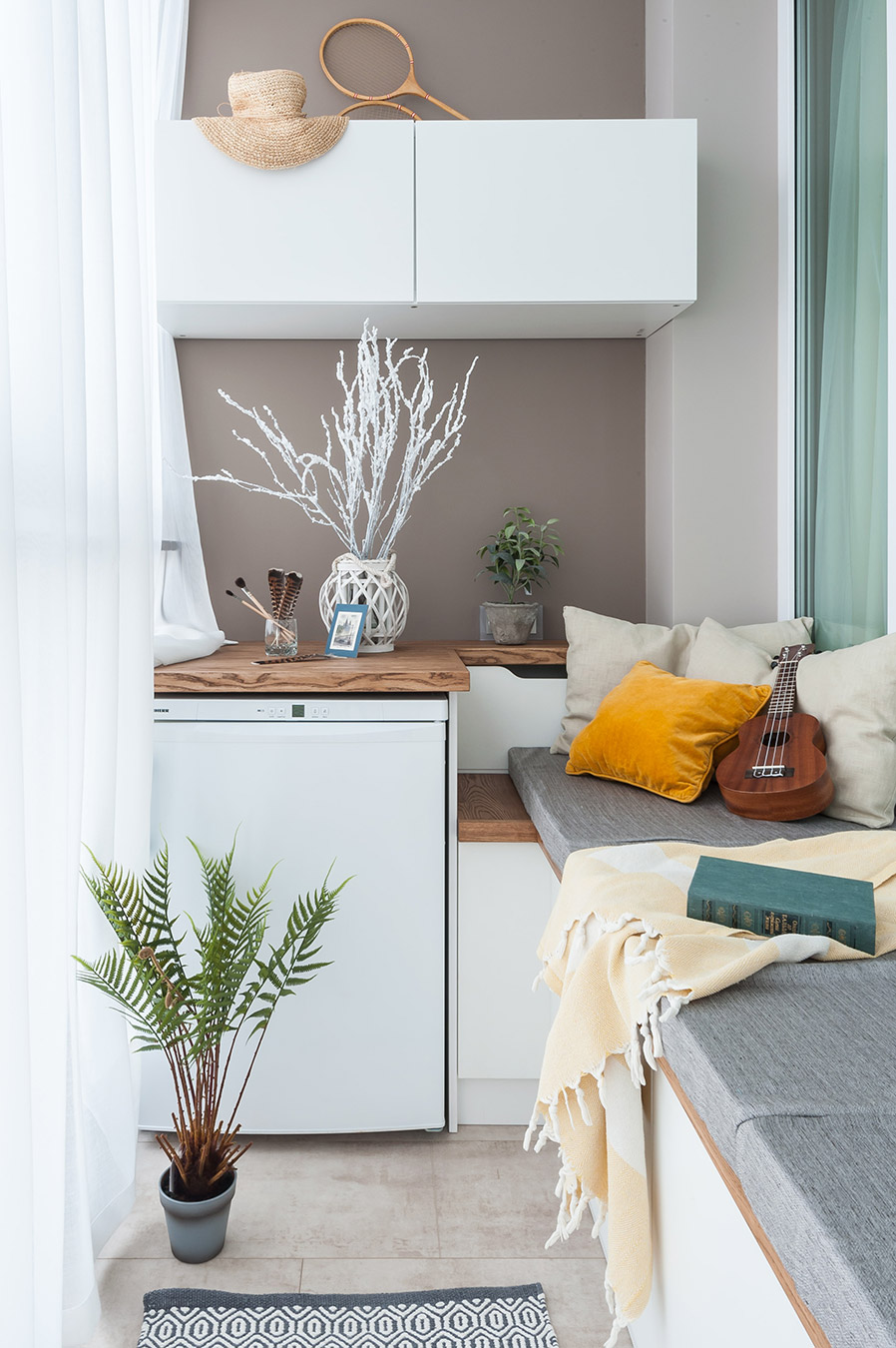 Балкон решен в общей стилистике со спальней. Он используется для хранения вещей и как дополнительная зона отдыха.