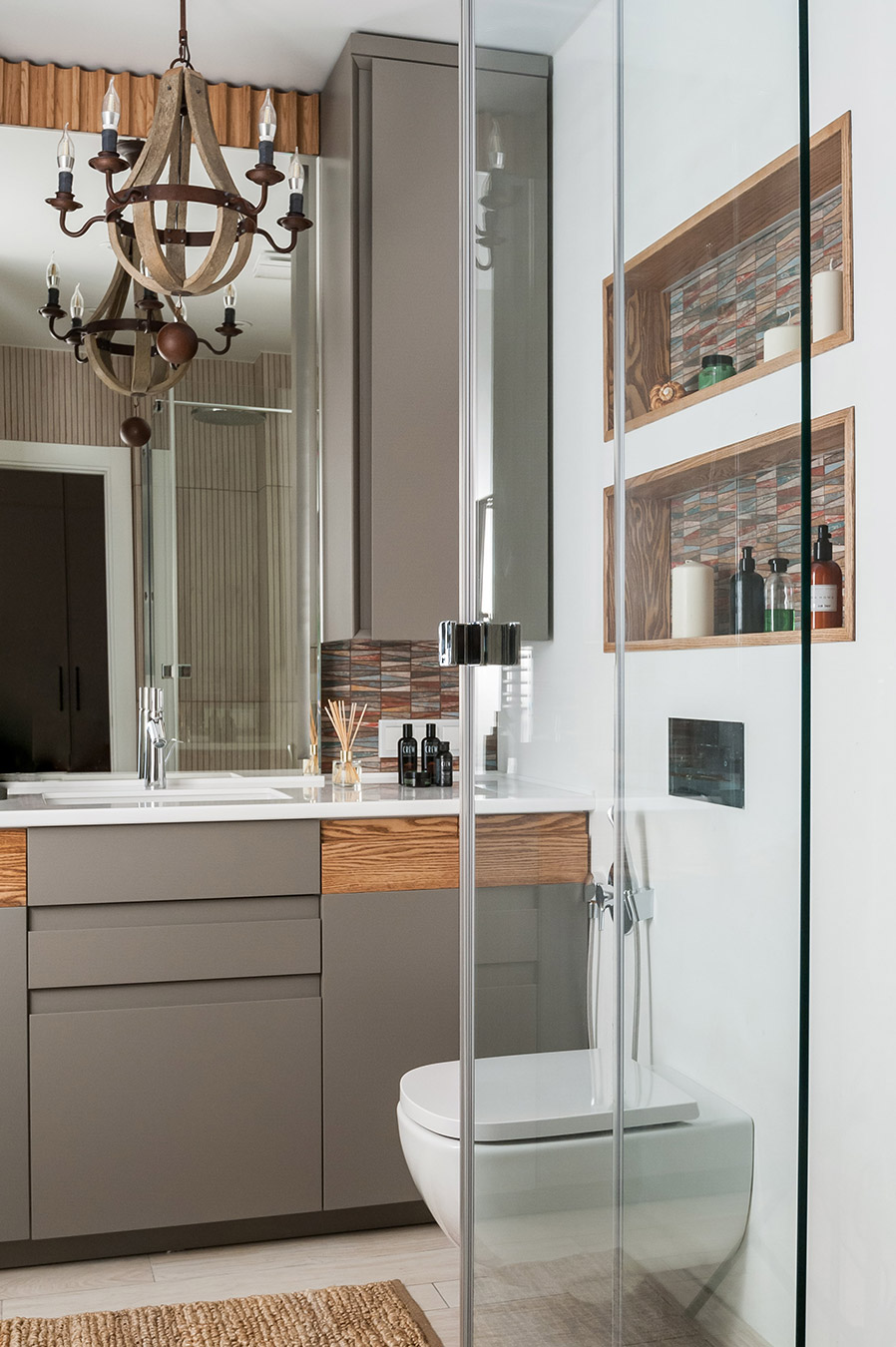 Санузел выполняет несколько функций. По центру установлена раковина с большим зеркалом с подсветкой. В нижних базах размещена стиральная машина, система хранения. В верхних боковых секциях — водонагреватель, места для хранения принадлежностей. Очень лаконична стеклянная компактная душевая кабина Huppe, сантехника Laufen. В отделке стен использовался керамогранит двух видов. Мозаика из состаренных «под дерево» фрагментов украшает зону раковины и ниши. Применив контрастную затирку, получили интересный эффект. Пол набран разноформатным керамогранитом Atlas Concorde Etic, в цвет основного пола в квартире, а в зоне душа — плиточка «под рейки». Стены выкрашены в белый цвет. Здесь также локально присутствует декор деревянными элементами — таким образом, все пространство квартиры связано единой концепцией оформления.