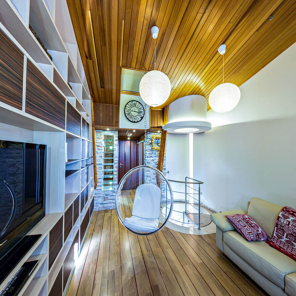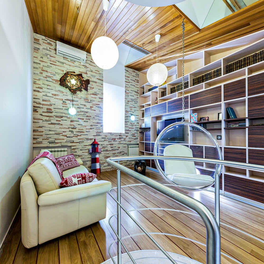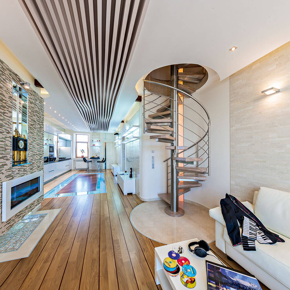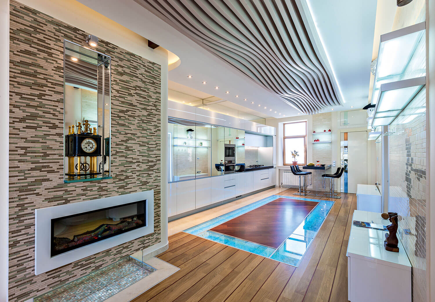 Интерьер двухуровневой квартиры приобрел футуристическое звучание благодаря оригинальной трактовке минимализма. Концепция строится на сочетаниях четких геометрических форм, зеркальных и стеклянных поверхностей, растворяющих границы функционального объема, и игре цветной подсветки. Необычный декоративный потолочный элемент из клееной влагостойкой фанеры, обрамленный светодиодной лентой и имитирующий волны, подчеркивает оригинальный характер студии. Изящная винтовая лестница сочетается с волнообразной пластикой потолка. Ее каркас и ограждения выполнены из матового алюминия, ступени — из выбеленного дуба. Если первый этаж задуман как студия, где можно принимать гостей, то второй решен в виде лофта и носит характер личного пространства.
