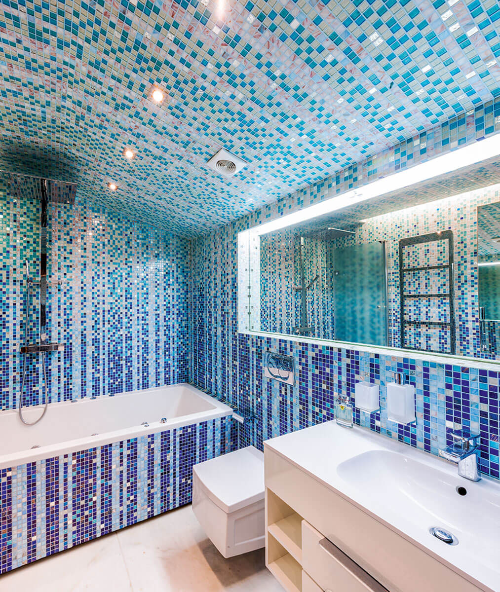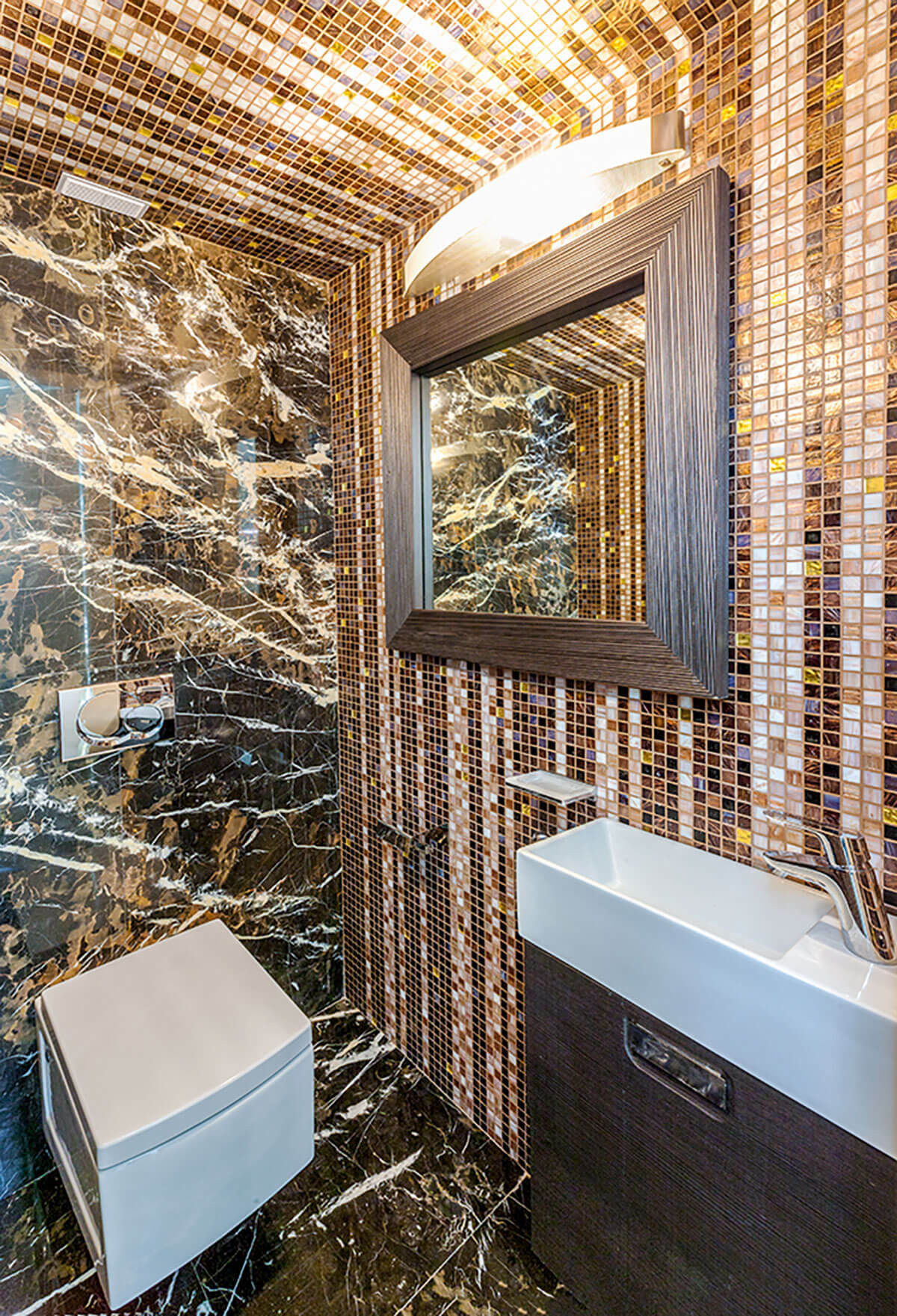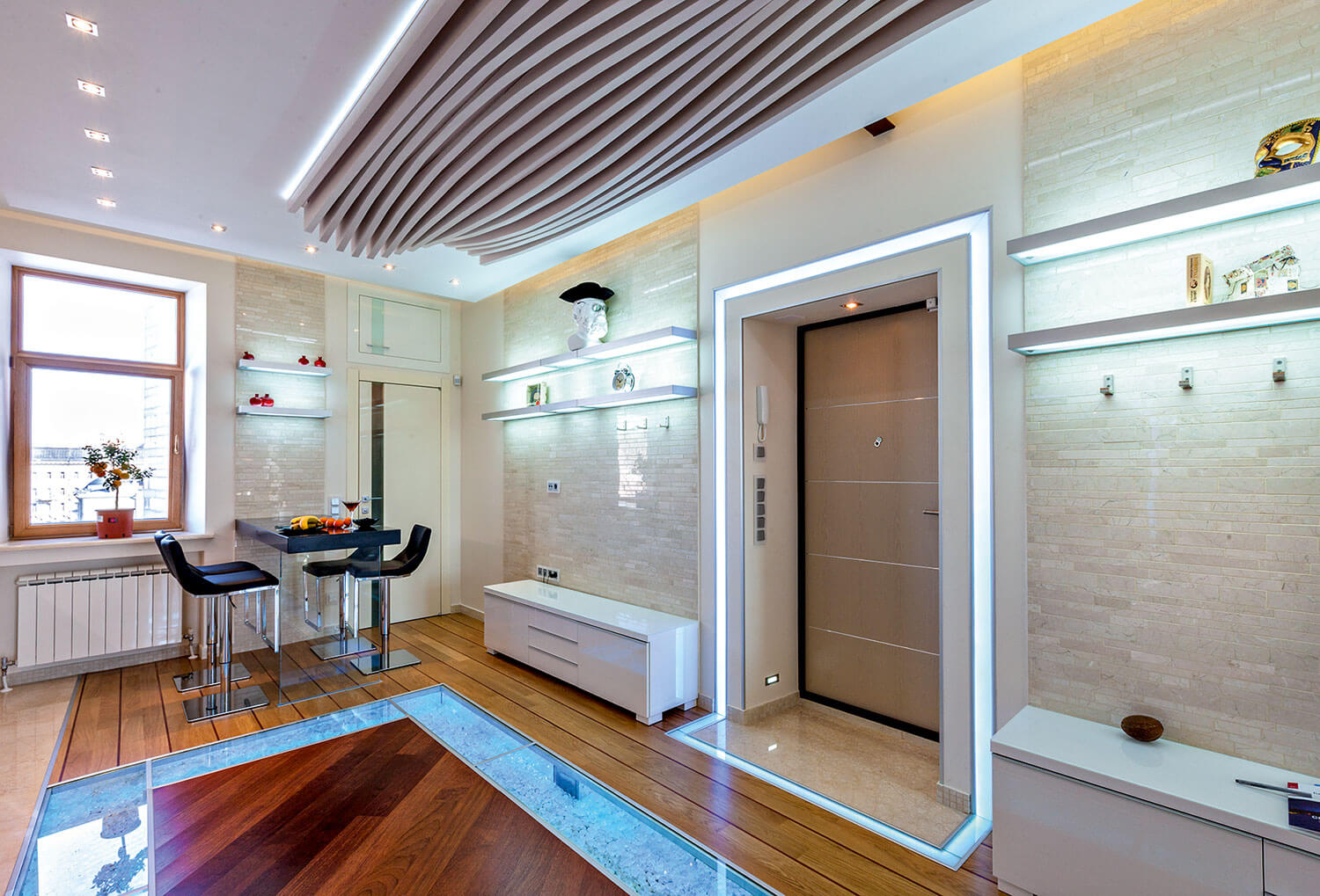 Интерьер двухуровневой квартиры приобрел футуристическое звучание благодаря оригинальной трактовке минимализма. Концепция строится на сочетаниях четких геометрических форм, зеркальных и стеклянных поверхностей, растворяющих границы функционального объема, и игре цветной подсветки. Необычный декоративный потолочный элемент из клееной влагостойкой фанеры, обрамленный светодиодной лентой и имитирующий волны, подчеркивает оригинальный характер студии. Изящная винтовая лестница сочетается с волнообразной пластикой потолка. Ее каркас и ограждения выполнены из матового алюминия, ступени — из выбеленного дуба. Если первый этаж задуман как студия, где можно принимать гостей, то второй решен в виде лофта и носит характер личного пространства.