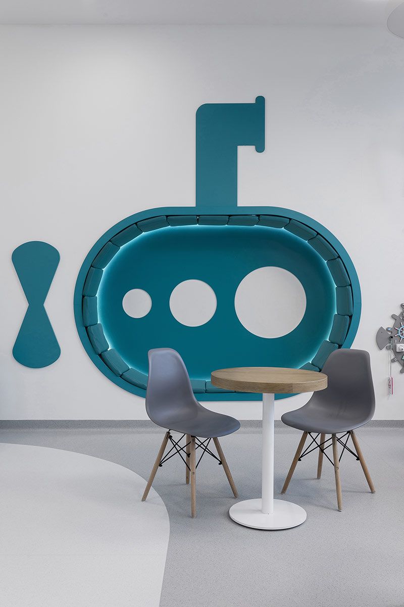 В интерьере «Батискафа» сглаженные углы и обтекаемые декоративные элементы делают пространство дружелюбным и безопасным для детей, создают ощущение «перетекания» из одной зону в другую. Основной цвет — белый служит фоном для ярких акцентов мебели и цветового зонирования помещений.