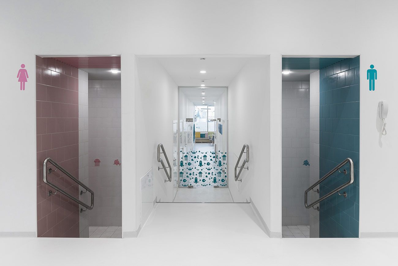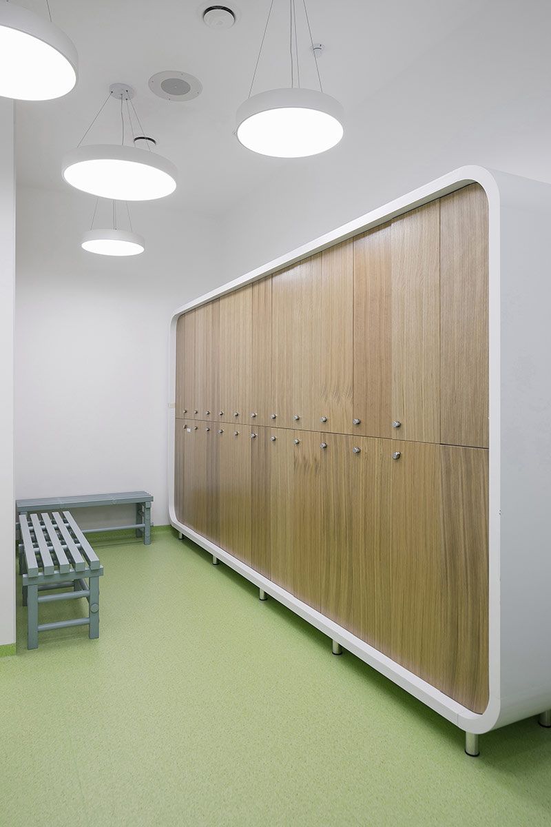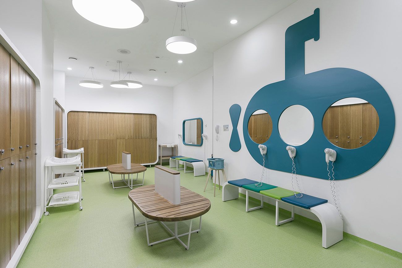 Раздевалкам было уделено отдельное внимание, т.к. в акваклубе предусмотрено сочетание индивидуальных пространств для разных семейных групп. Таким образом, папа с дочкой, мама с сыном или папа с сыном и мама с дочкой имеют разные раздевалки, душевые и выходы к бассейнам, что дает возможность обоим родителям посещать акваклуб независимо от пола ребенка. Также предусмотрены раздевалки, душевые и санузлы для детей с ограниченными возможностями.