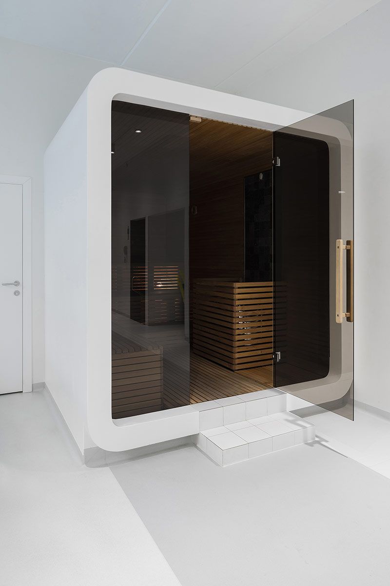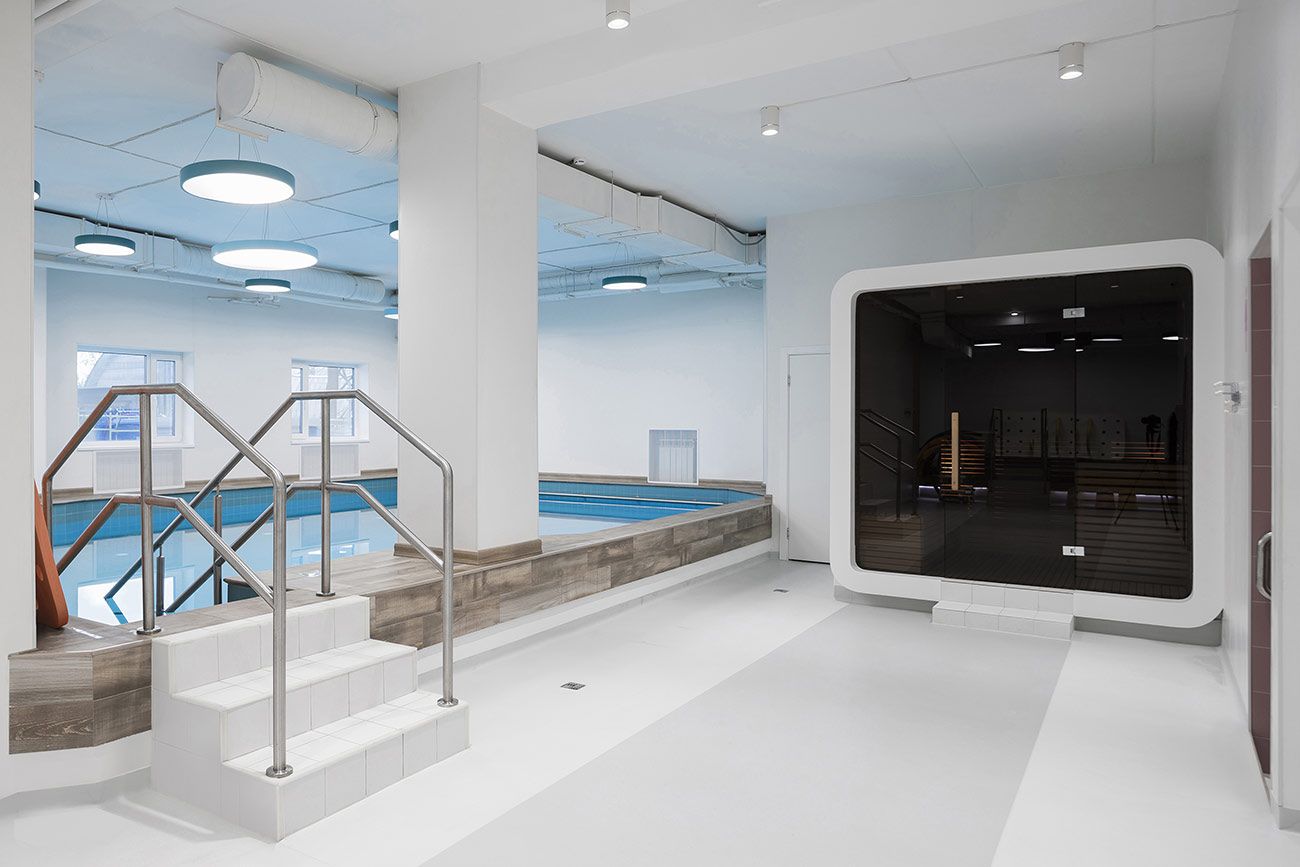 Через душевую зону посетители попадают в зону бассейнов, где находятся большая площадка для разминки на суше перед входом в воду и отдельно стоящий белый объем сауны.