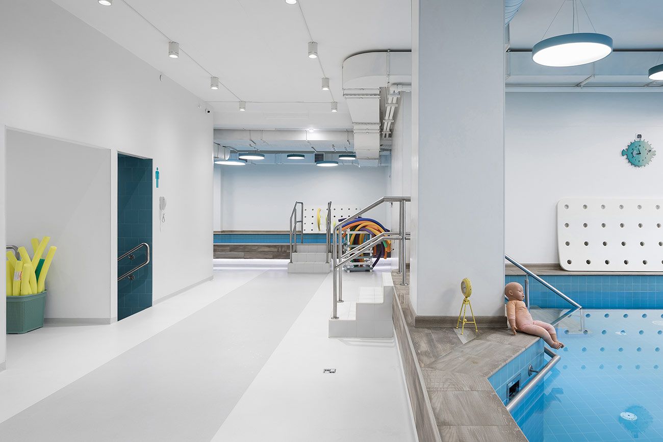 Рассеянный, диммирующий свет, пастельные тона цветовых акцентов, светлые стены, переходящие в пол и потолок, создают комфортное, современное пространство для восприятия и занятий маленьких посетителей аквацентра.