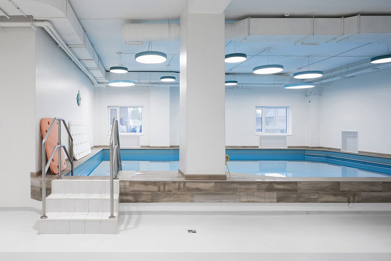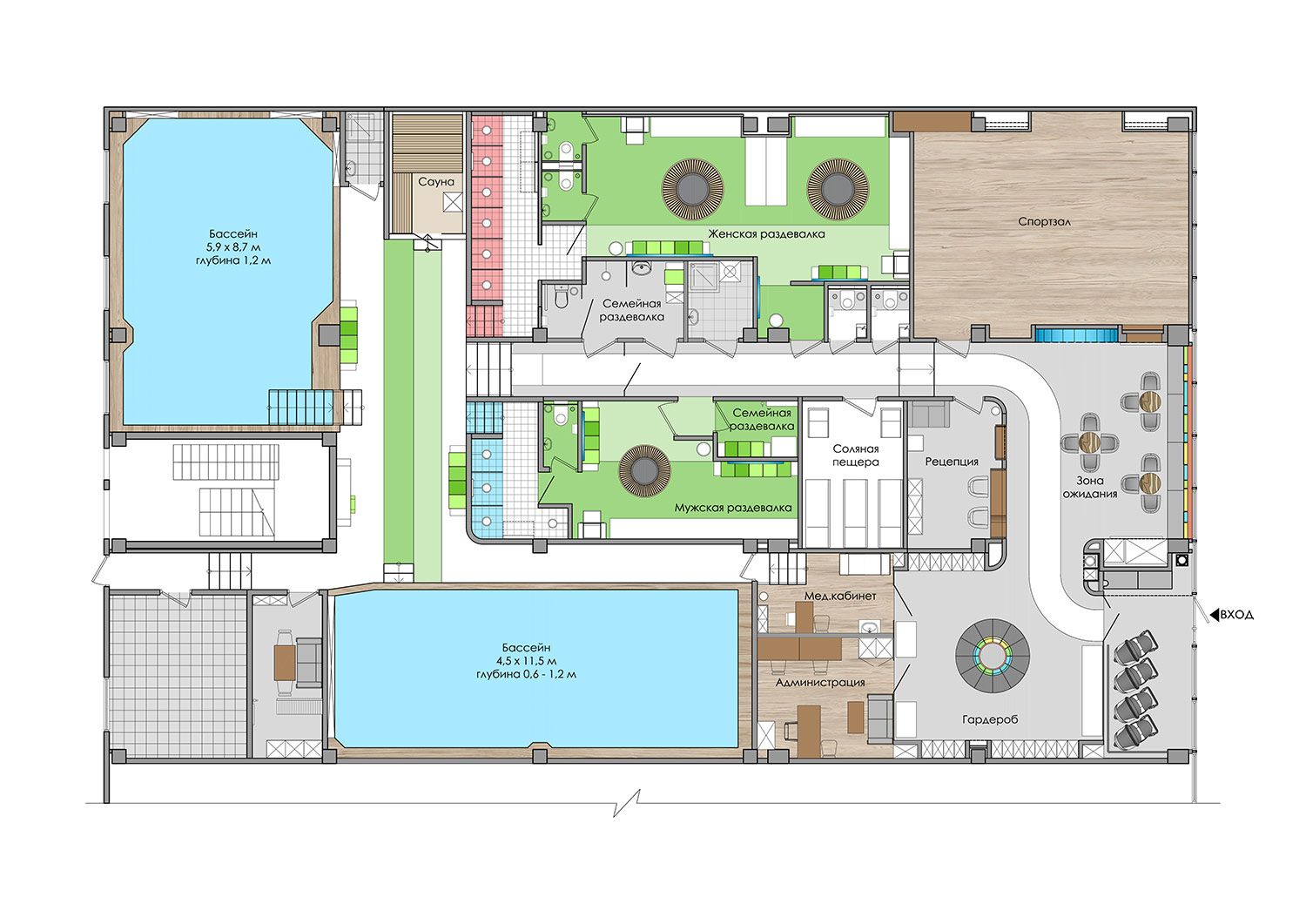 Входная группа и зона бассейнов соединяются сквозным холлом, из которого можно попасть в спортивный зал, соляную пещеру, санузлы, техническое помещение и раздевалки.