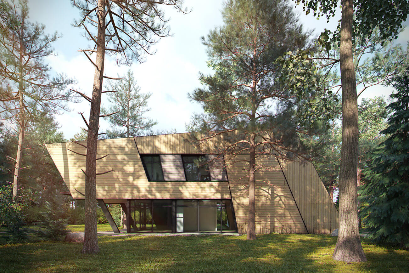 Основную роль в отделке фасадов играет дерево в комбинации со стеклянными витражами и металлическими ограждениями. Высокие витражи с тонкими переплетами практически незаметны глазу. Брус уложенный в разных направлениях и под разными углами создает на фасадах активный рисунок, еще больше искажающий геометрию дома. Тому же способствуют фрагменты стен, выделенные чуть отличающимся оттенком дерева.