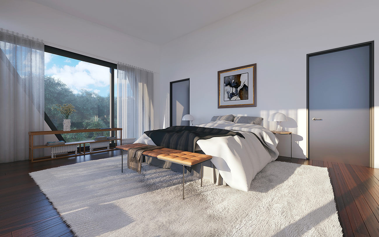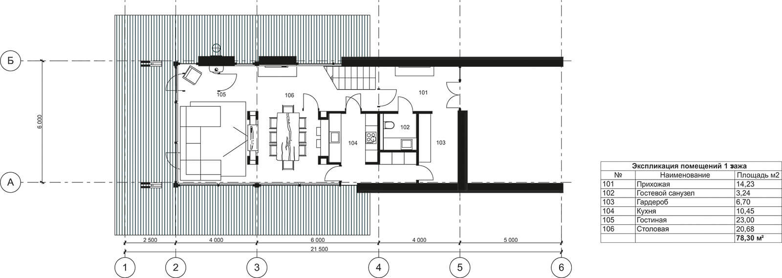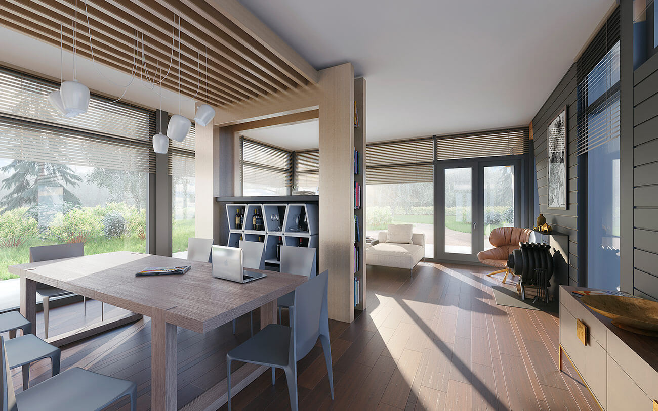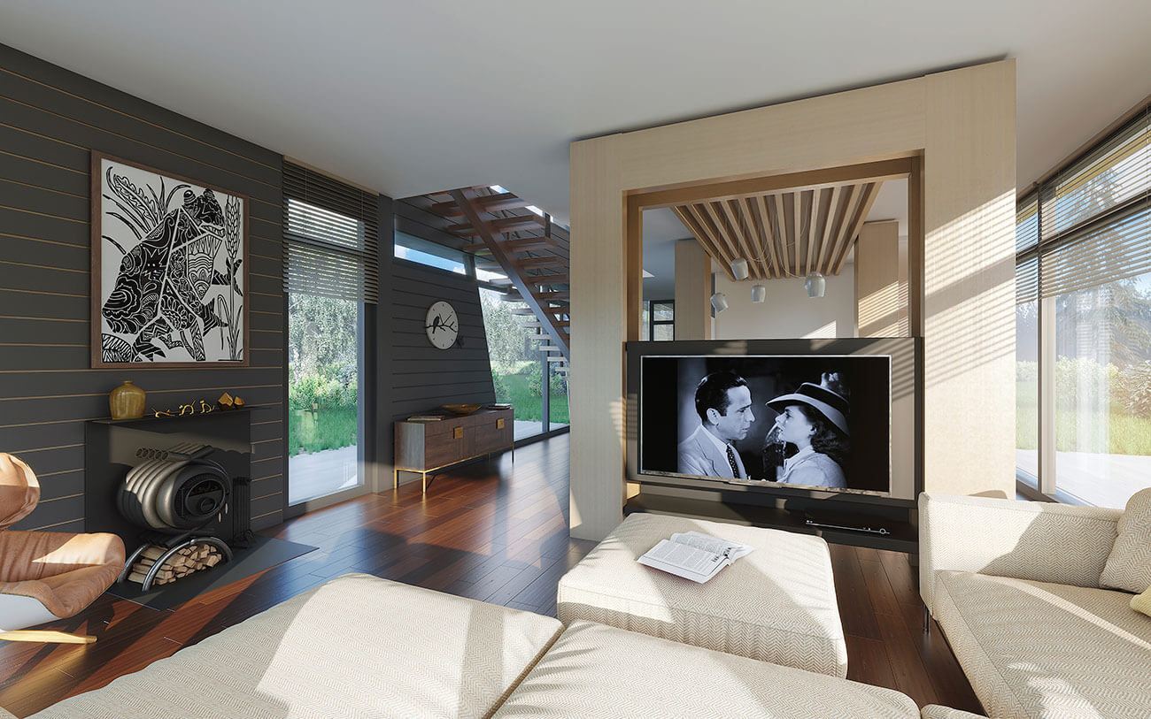 Несмотря на кажущуюся сложность, дом имеет ясную и удобную планировку внутреннего пространства, в границы которого встроен весь необходимый набор помещений. На первом этаже за стеклянным фасадом разместились свободная гостиная и кухня, совмещенная с зоной столовой.