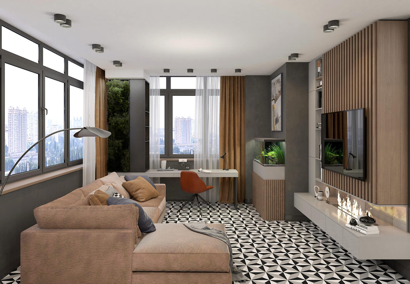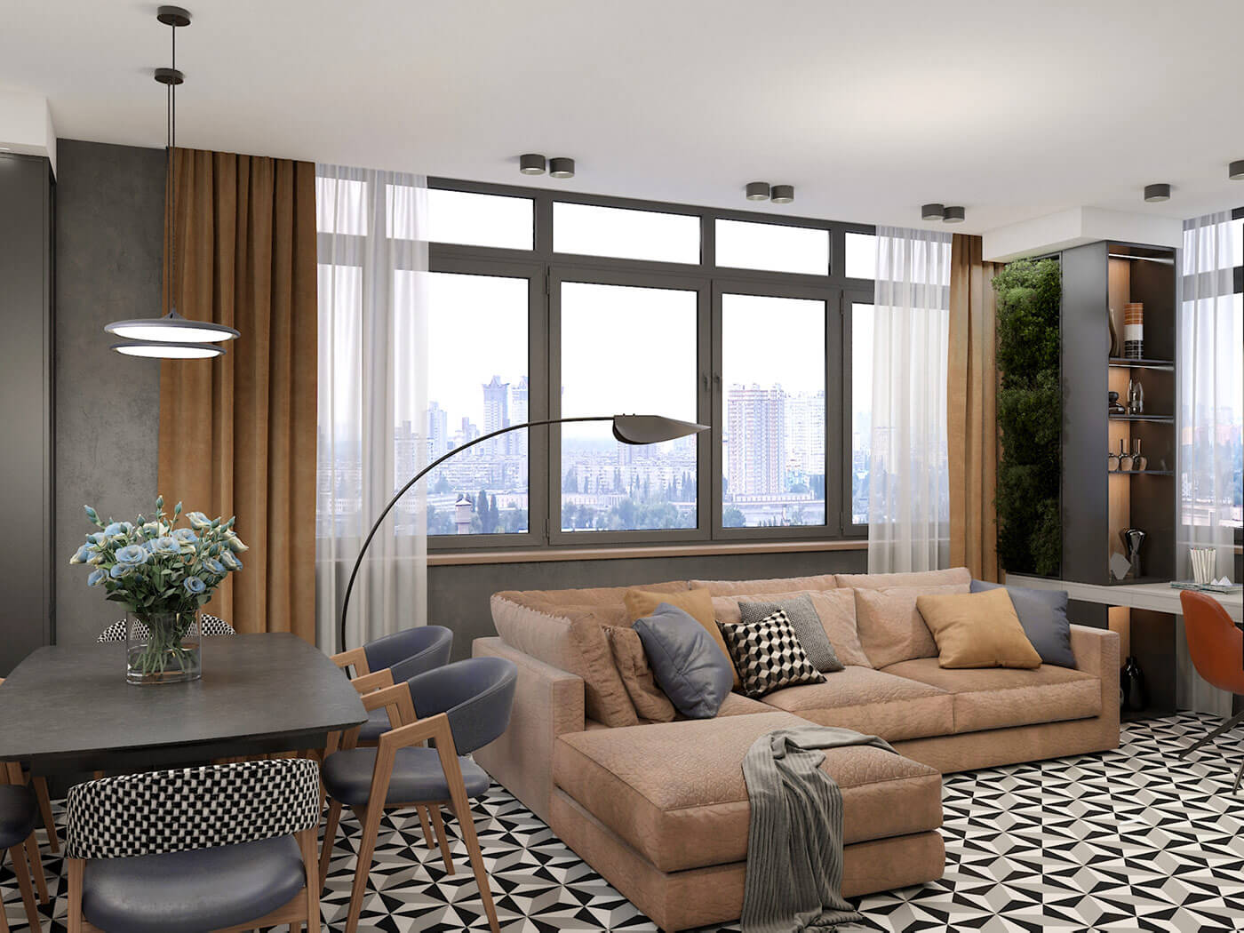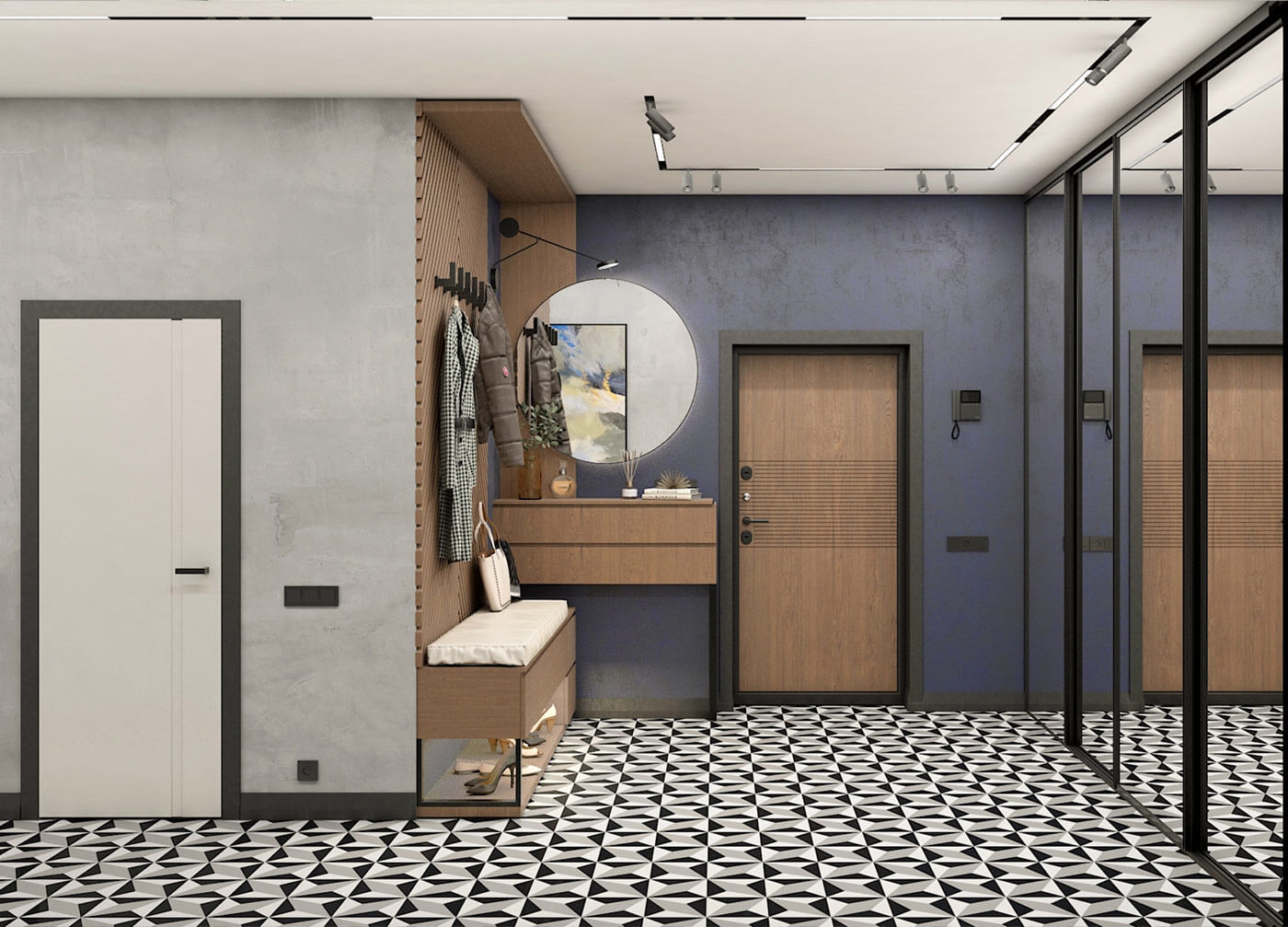 Когда заказчики показали плитку, в которую влюбились, сразу вспомнила Алису в стране чудес. Узор, контрастный, графический сразу стал основой, вокруг которой разрабатывался весь проект. Хотелось создать урбанистический дизайн, поскольку квартира расположена на тринадцатом этаже бывшего административного здания, для этого использованы грубые фактуры стен, серые оттенки, прямые линии. Чтобы интерьер не был холодным, я использовала много дерева и теплые оттенки терракота в текстиле. А чтобы интерьер имел чудинку Алисы и особое настроение, добавлены яркие акценты в элементах мебели и отделке стен, а так же контрастные графические элементы (двери, плинтуса).
