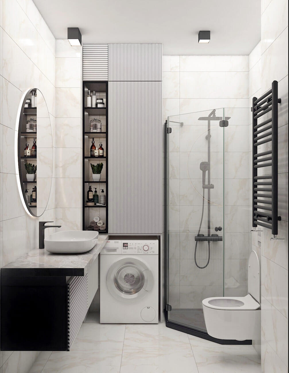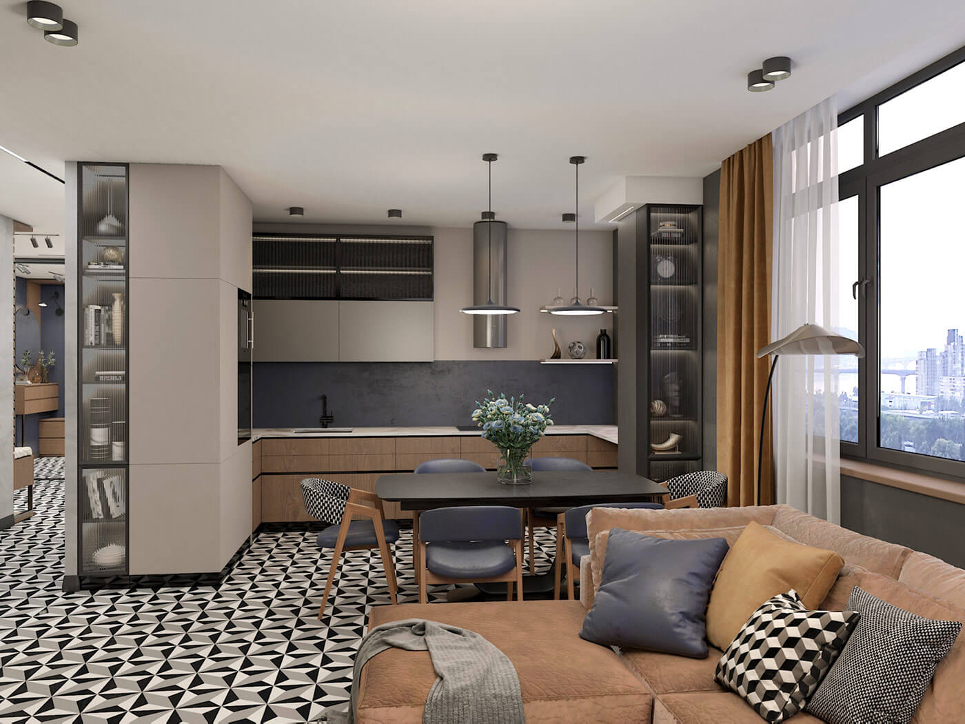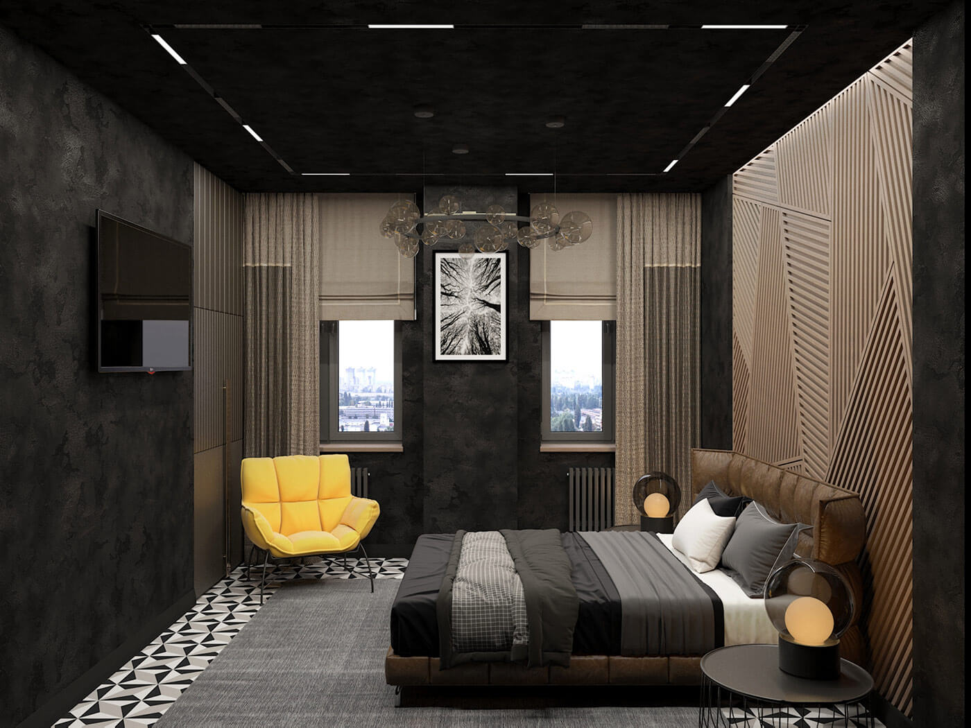 Когда заказчики показали плитку, в которую влюбились, сразу вспомнила Алису в стране чудес. Узор, контрастный, графический сразу стал основой, вокруг которой разрабатывался весь проект. Хотелось создать урбанистический дизайн, поскольку квартира расположена на тринадцатом этаже бывшего административного здания, для этого использованы грубые фактуры стен, серые оттенки, прямые линии. Чтобы интерьер не был холодным, я использовала много дерева и теплые оттенки терракота в текстиле. А чтобы интерьер имел чудинку Алисы и особое настроение, добавлены яркие акценты в элементах мебели и отделке стен, а так же контрастные графические элементы (двери, плинтуса).