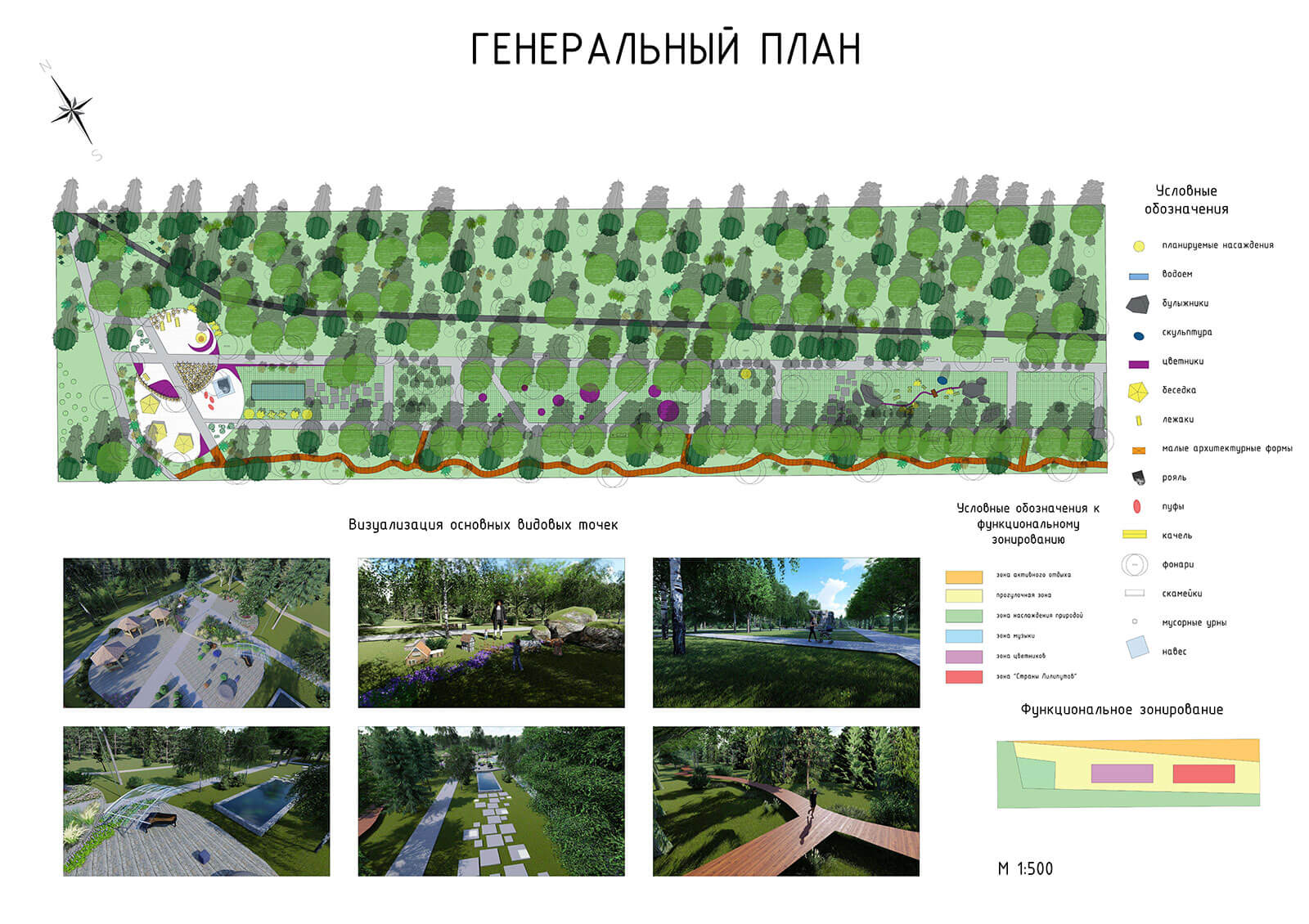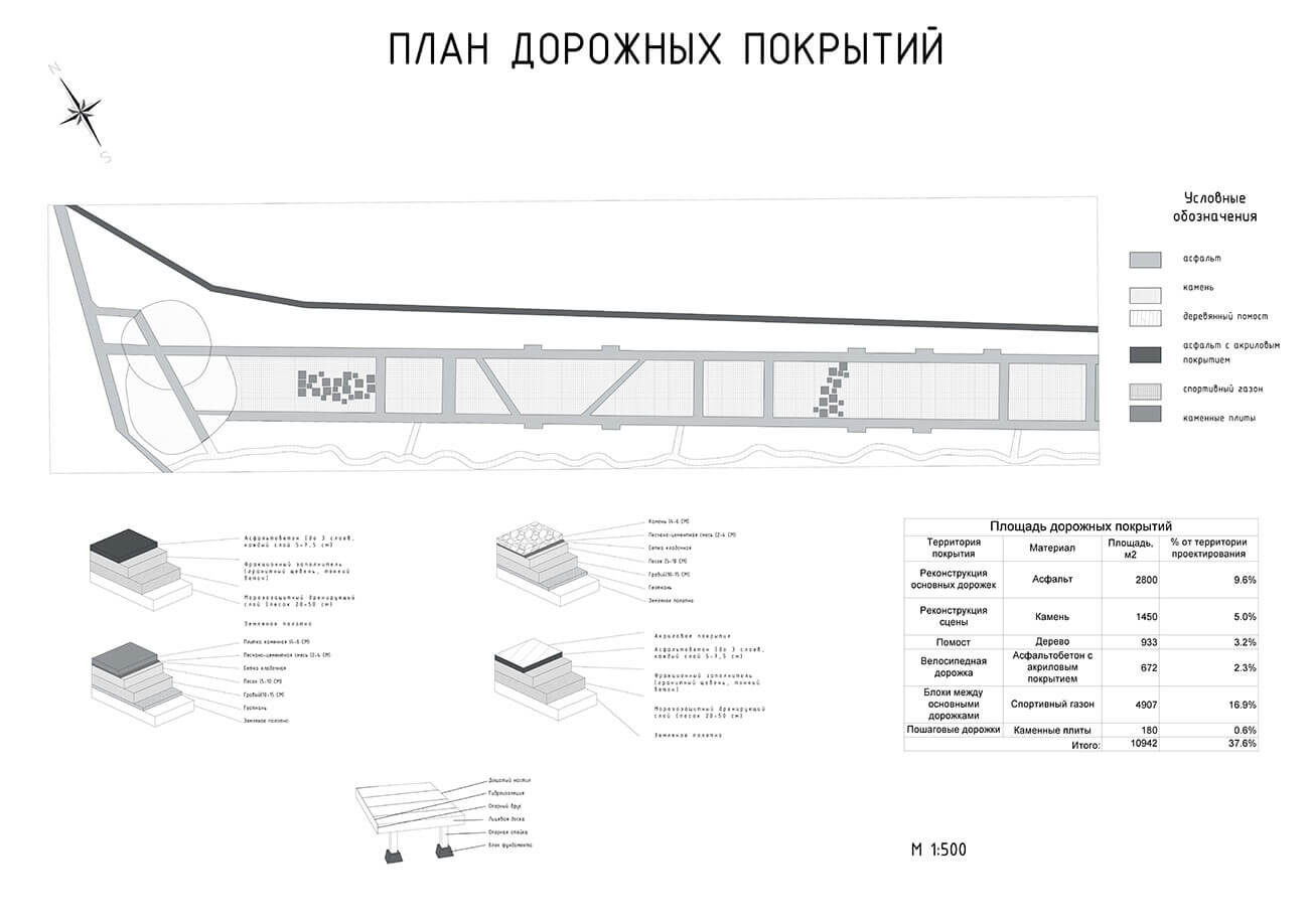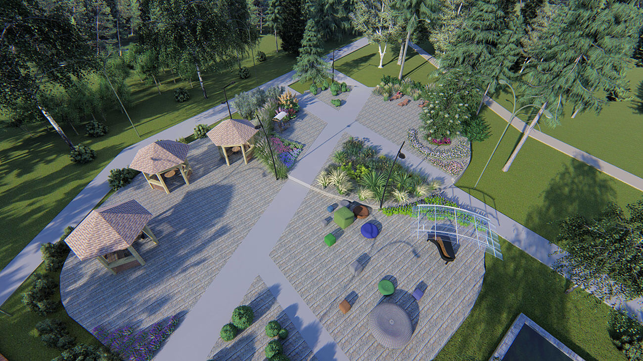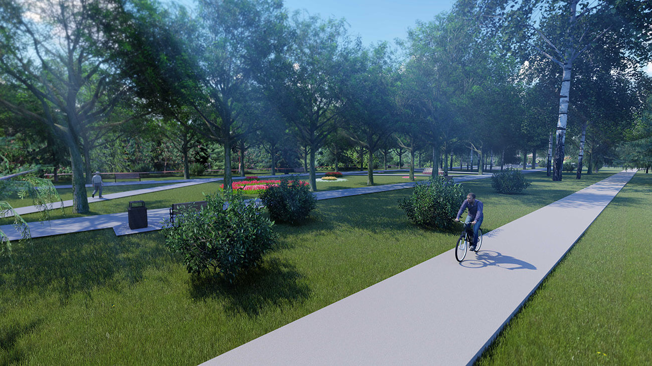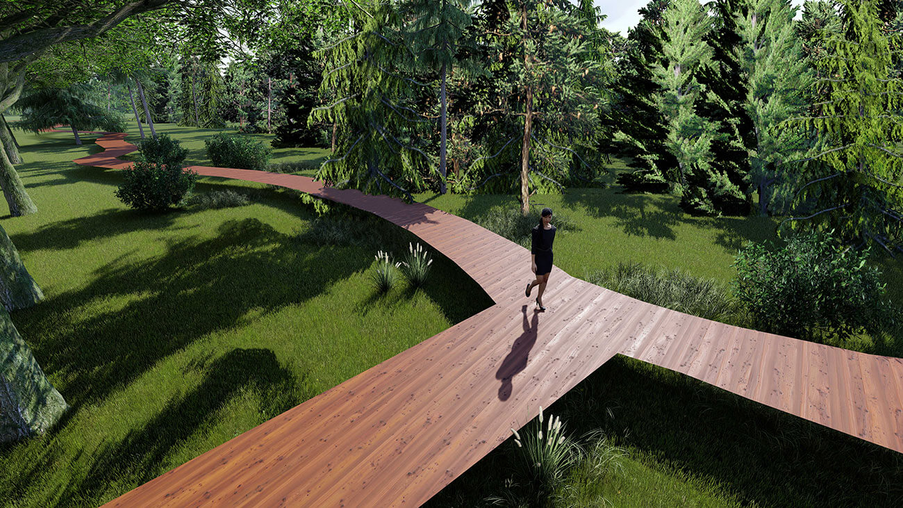 В соответствии с современными запросами граждан в проекте предложено создание велосипедной дорожки по одну сторону основного транзита и деревянного настила для уединенных прогулок в лесной части с другой стороны. Деревянный настил является экологичной и необычной альтернативой обычным мощеным дорожкам — то, что деревянное полотно имеет некоторое расстояние до земли, позволяет произрастающим на территории растениям продолжать свою жизнедеятельность и отлично дополнять общую картину леса.