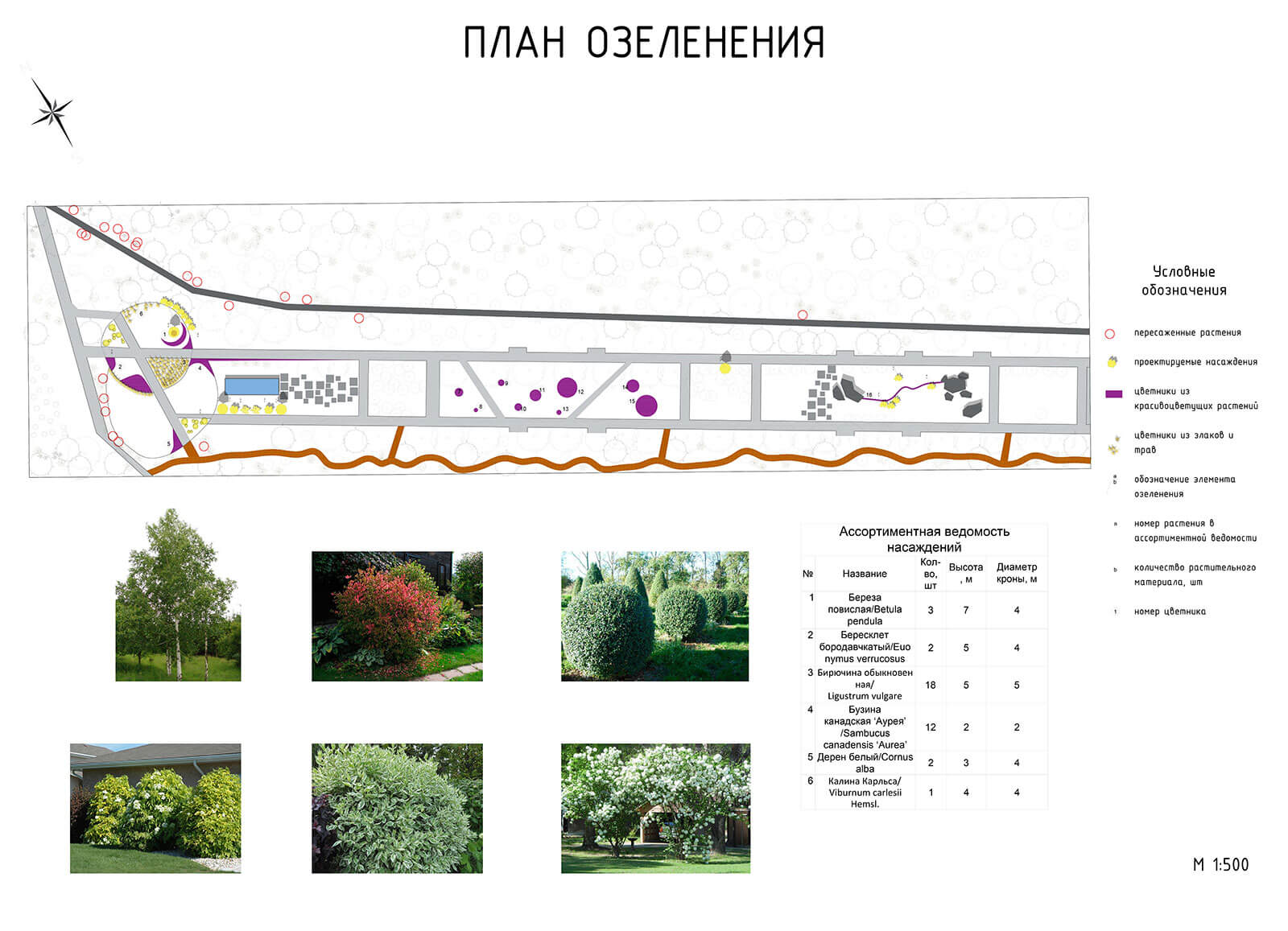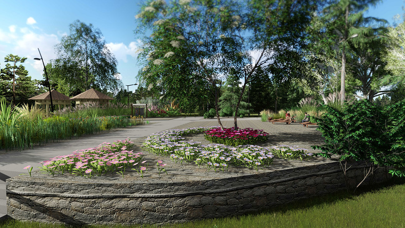 Существующий ассортимент древесных культур предлагается дополнить калиной Карльса и сформированной в шарообразные формы бирючиной обыкновенной. Все цветники выполнены из многолетних культур и предполагают непрерывное цветение.