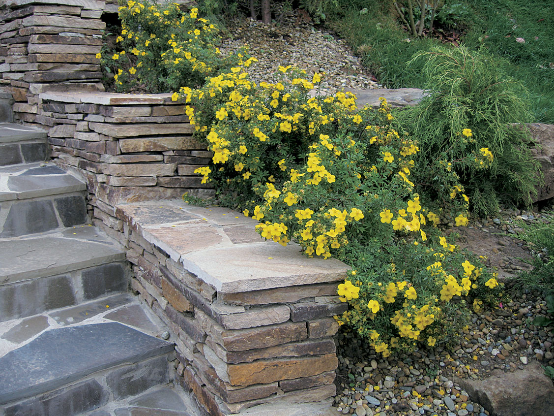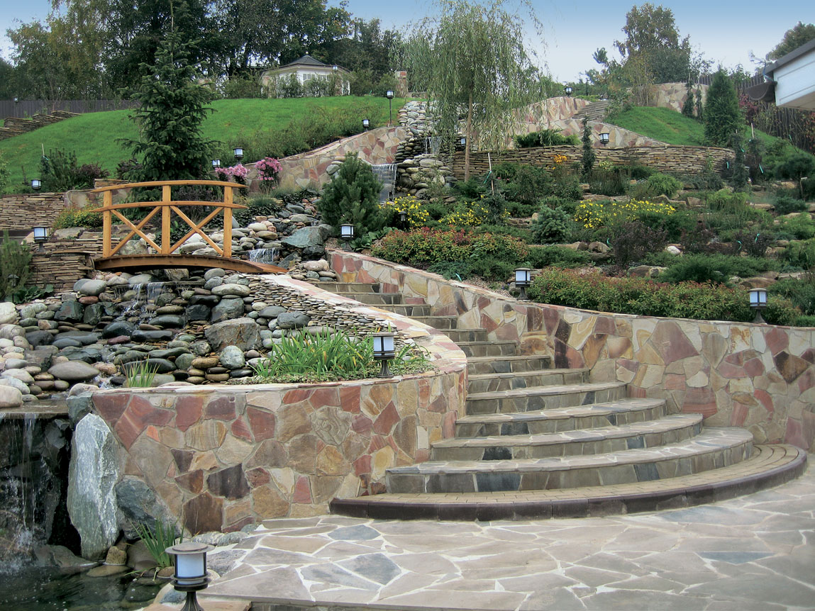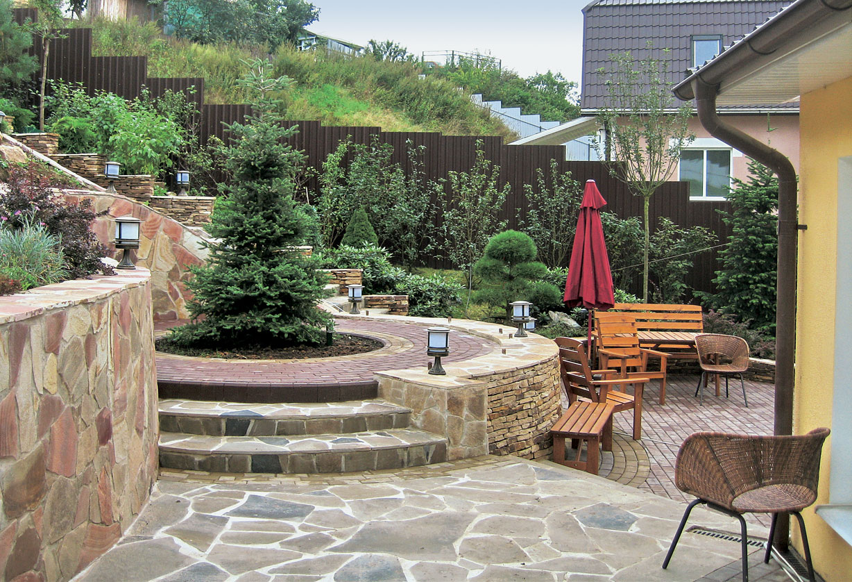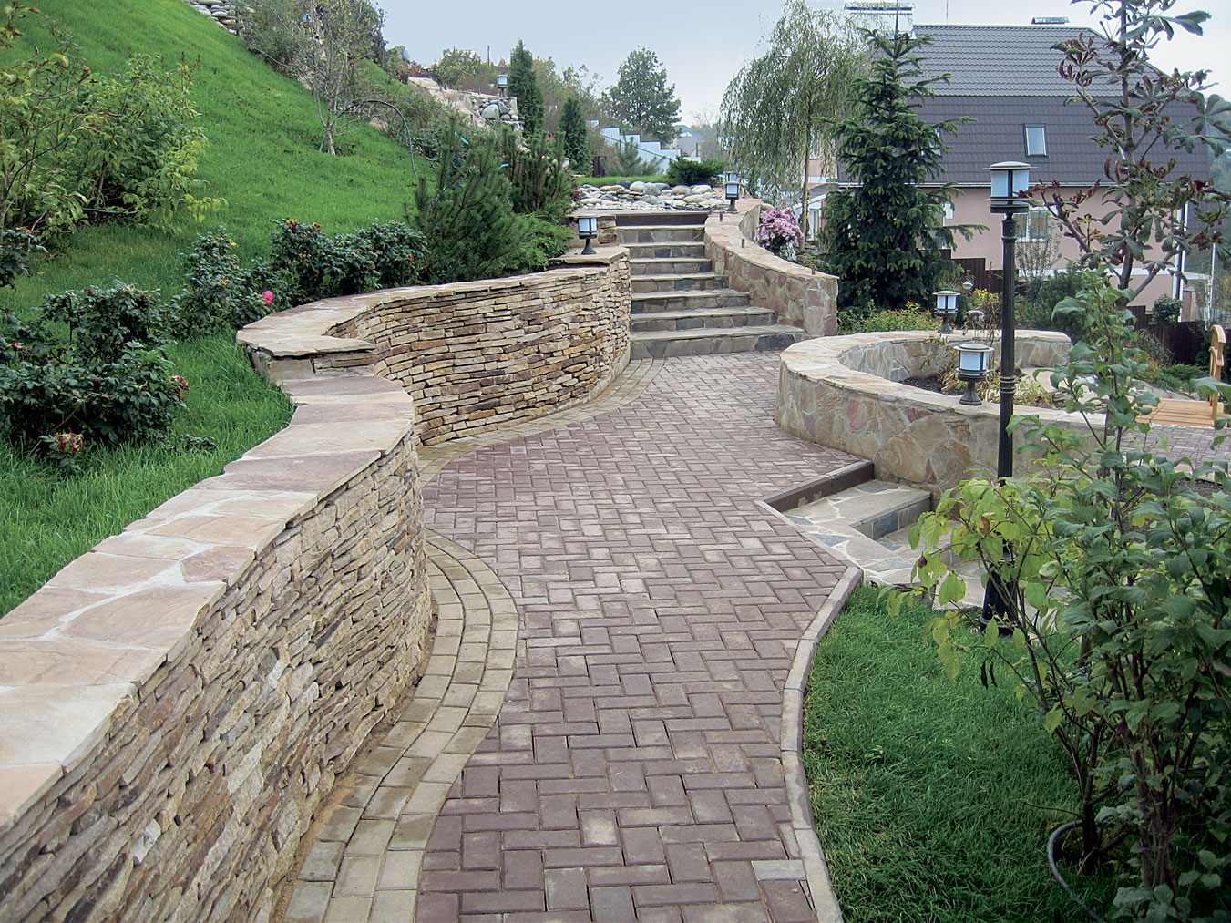 При мощении лестниц и площадок сочетали натуральный камень и тротуарную плитку трех цветов с различным узором раскладки.