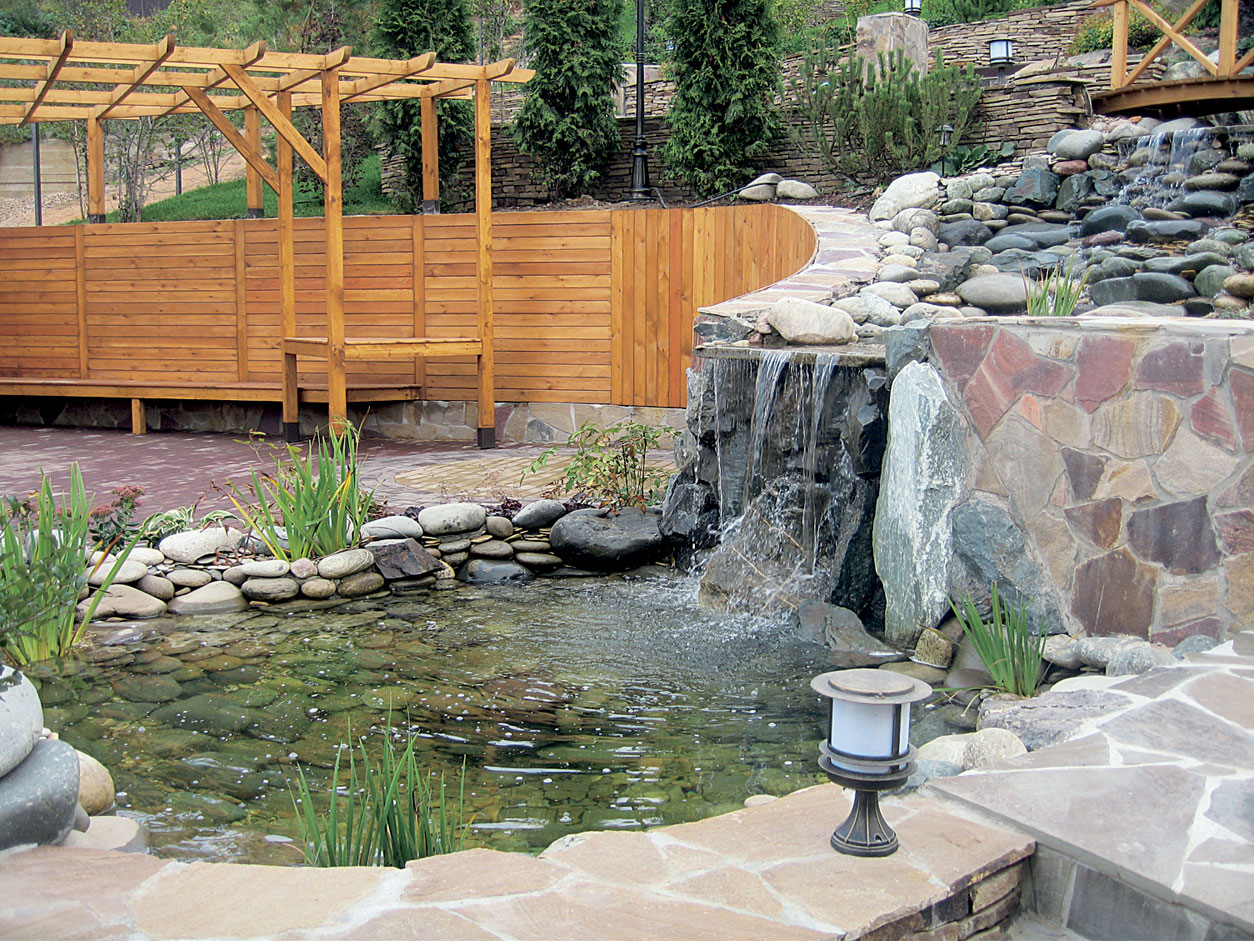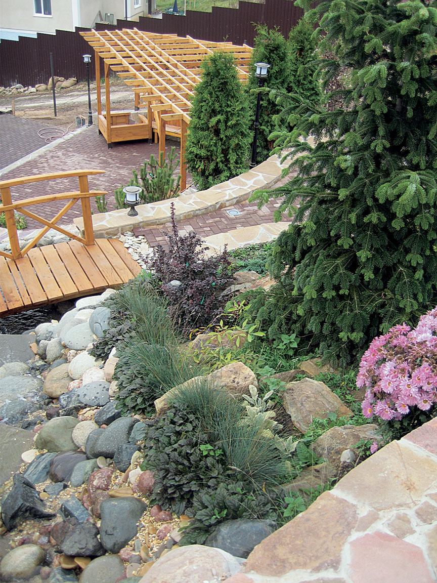 Возле беседки берет начало ручей, который протекает по всей территории участка. Через него перекинуты мостики из лиственницы.