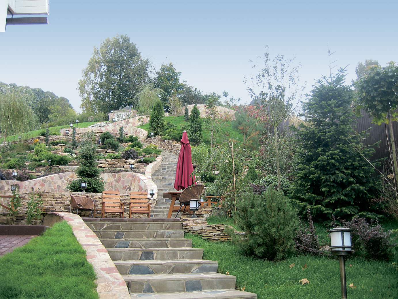 Проектируя генеральный план участка площадью 20 соток в Московской области, старались максимально сохранить существующий рельеф с перепадами в 17 метров и при этом сделать территорию комфортной. По крутому склону проложили удобные каменные дорожки-лестницы со смотровыми площадками для отдыха.