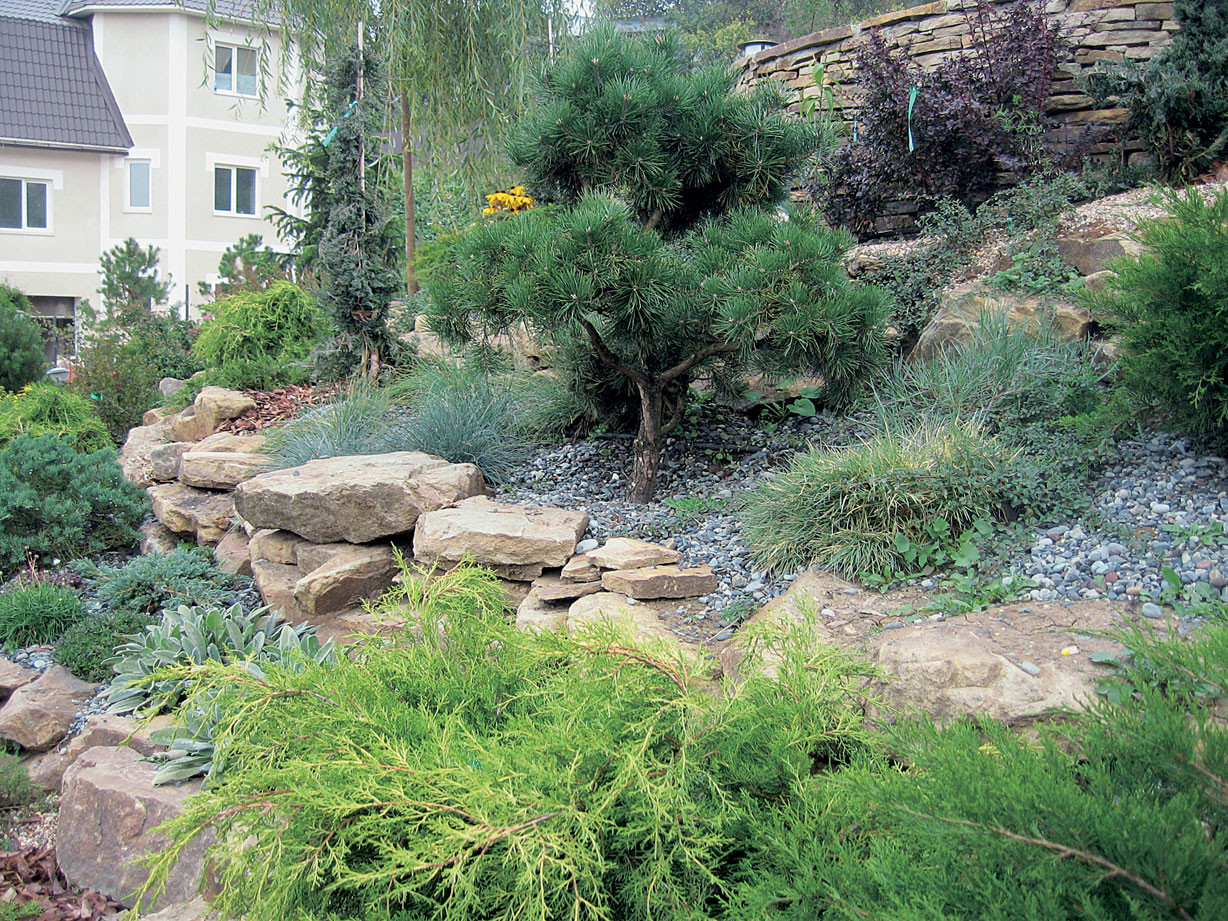 Центральный склон занимает альпинарий, где между грядами камней посажены хвойные деревья, цветущие кустарники и почвопокровные растения, что смотрится органично. Посадки круглый год радуют владельцев всеми красками цветовой палитры.