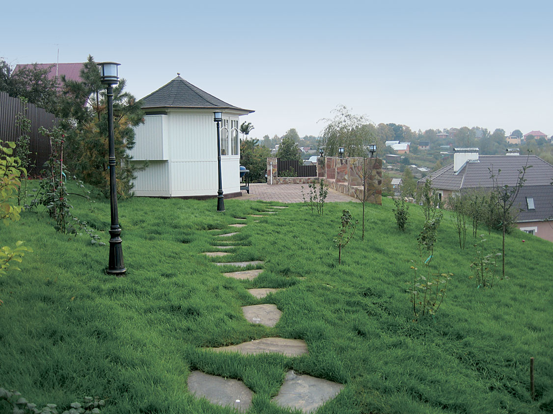 Все работы по благоустройству и озеленению проведены за сезон. Теперь, без труда поднявшись на самый высокий уровень, можно любоваться не только красивой перспективой, но и собственным альпийским склоном.