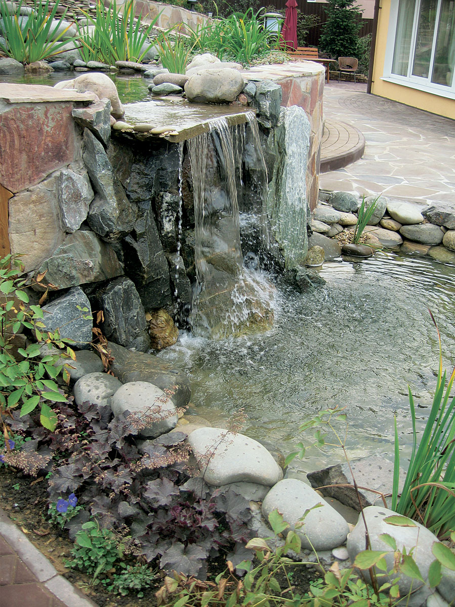 Поднимаясь по лестнице, отдыхая и останавливаясь на смотровых площадках, можно увидеть бегущий горный ручей в разных ракурсах — то он прячется в камнях, скрывается в зарослях растений, то обрушивается бурлящим водопадом в прудик с кувшинками.