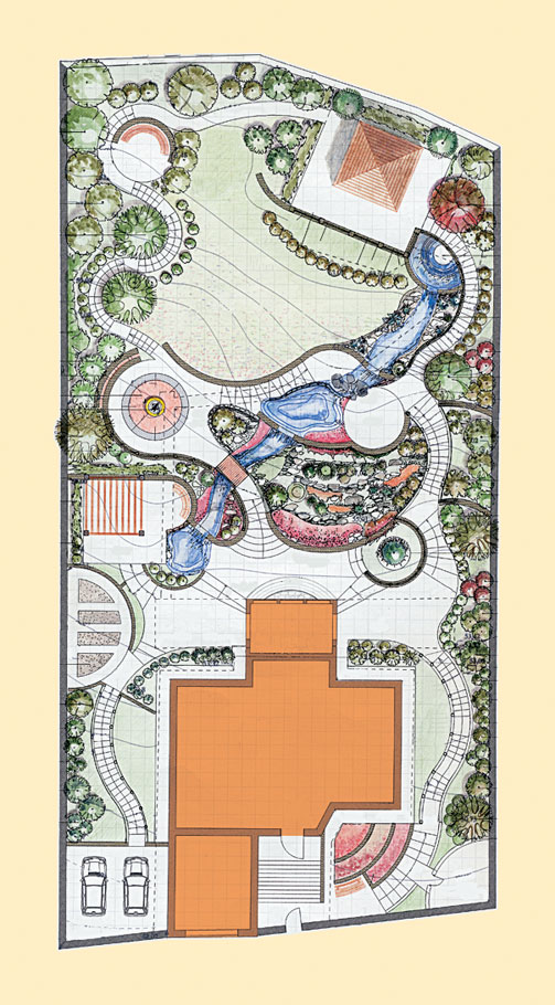 По горизонтали участок разбит на 4 уровня. Первый — входная группа с парадной лестницей, ведущей в дом. Рядом — площадка для отдыха с видом на розарий. Зимний сад плавно перетекает в сад под открытым небом. Здесь расположена вторая терраса с огородом, новогодней елью, площадкой с деревянной перголой и водоемом. На следующем уровне — розарий с солнечными часами, цветники и площадка для отдыха на траве. Самое высокое место занимает плодовый сад с беседкой-павильоном и площадкой для барбекю.