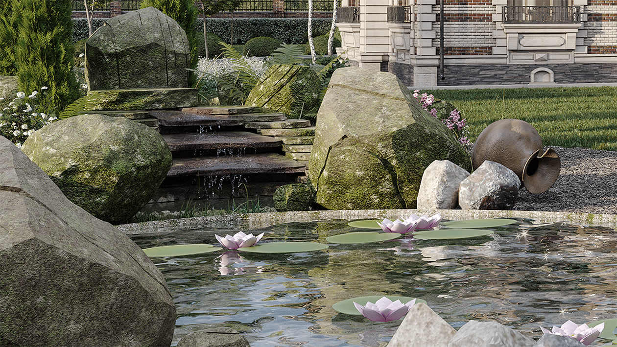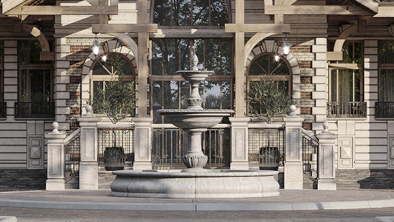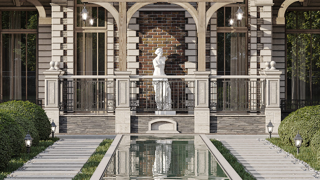 Завершает входную группу каменный фонтан, в то время как во внутреннем дворе скульптура греческой Богини Афродиты отражается в водной глади искусственного водоема.