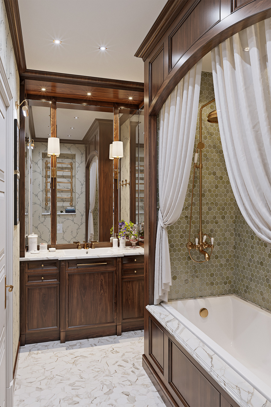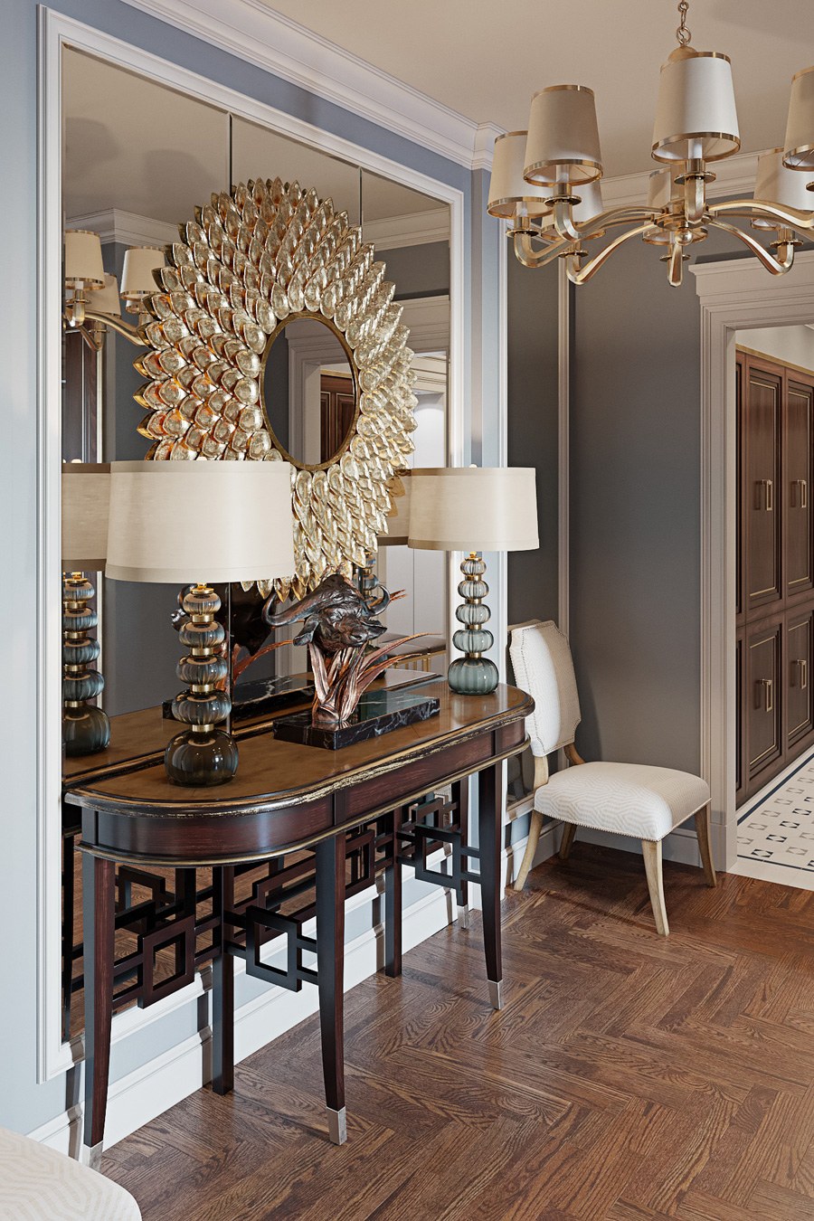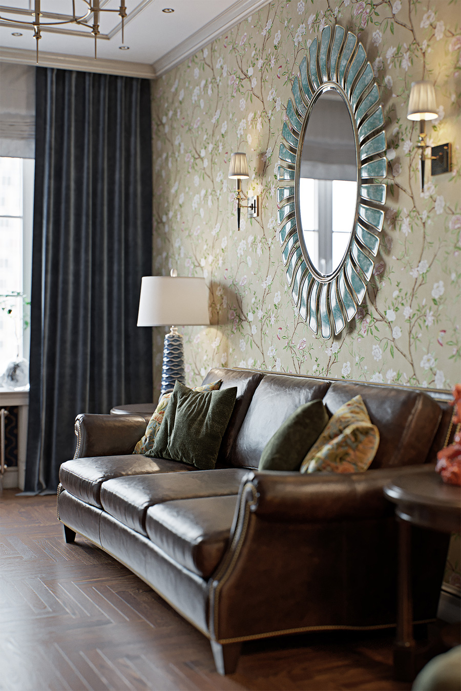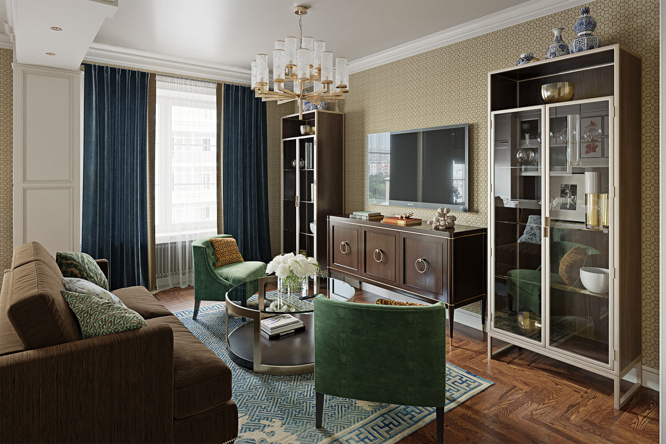 Интерьер квартиры, расположенной в ЖК «Английский Квартал», соответствует не только архитектурной концепции жилого комплекса, но и отвечает желанию заказчиков иметь респектабельное, продуманное до мелочей пространство.