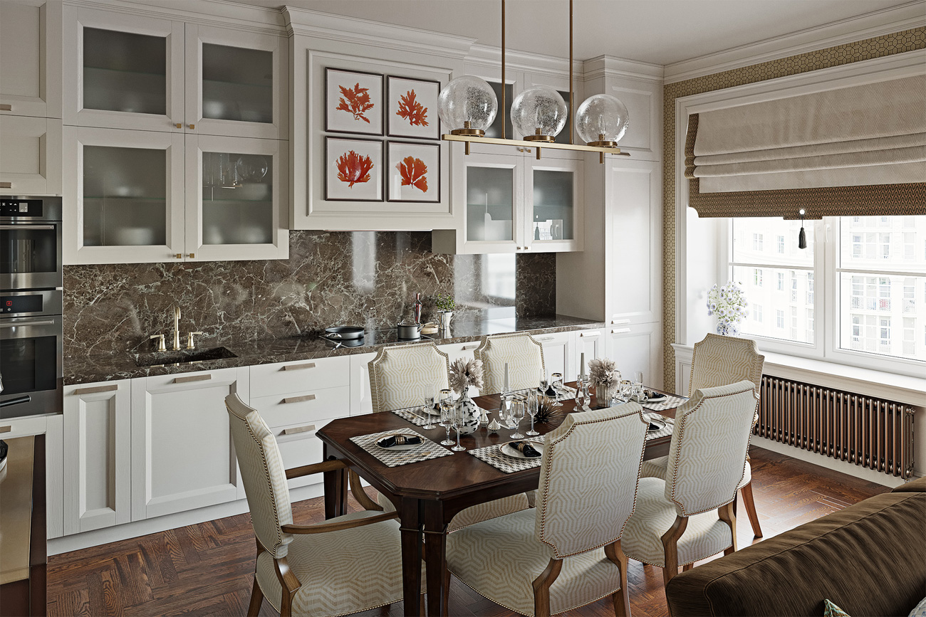 Владельцы квартиры — семейная пара — предпочитают светлые, уютные интерьеры, выполненные в традиционном стиле с современными акцентами. Такой образ авторы проекта и придали данному интерьеру, что подтверждают его основные стилистические и цветовые решения.